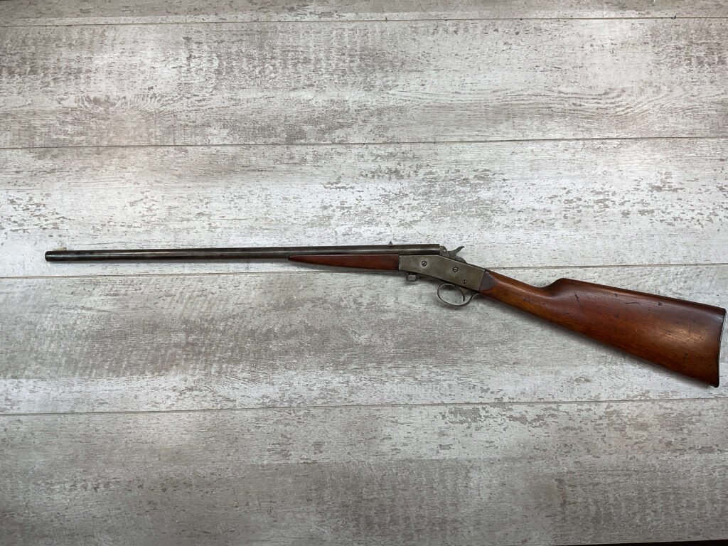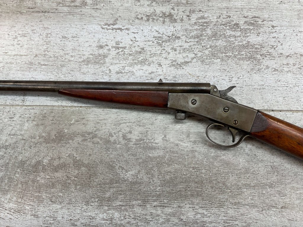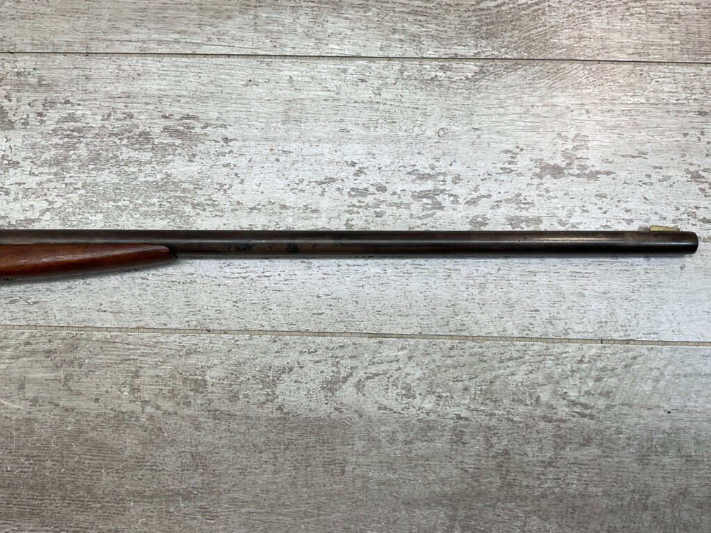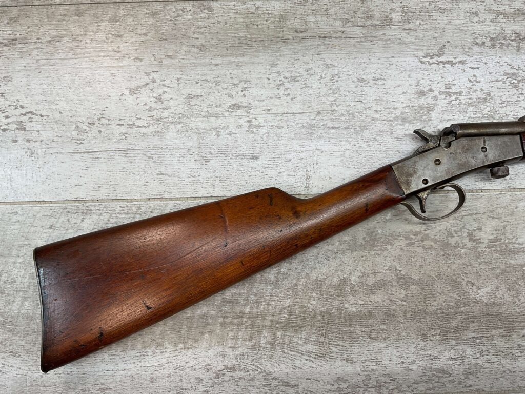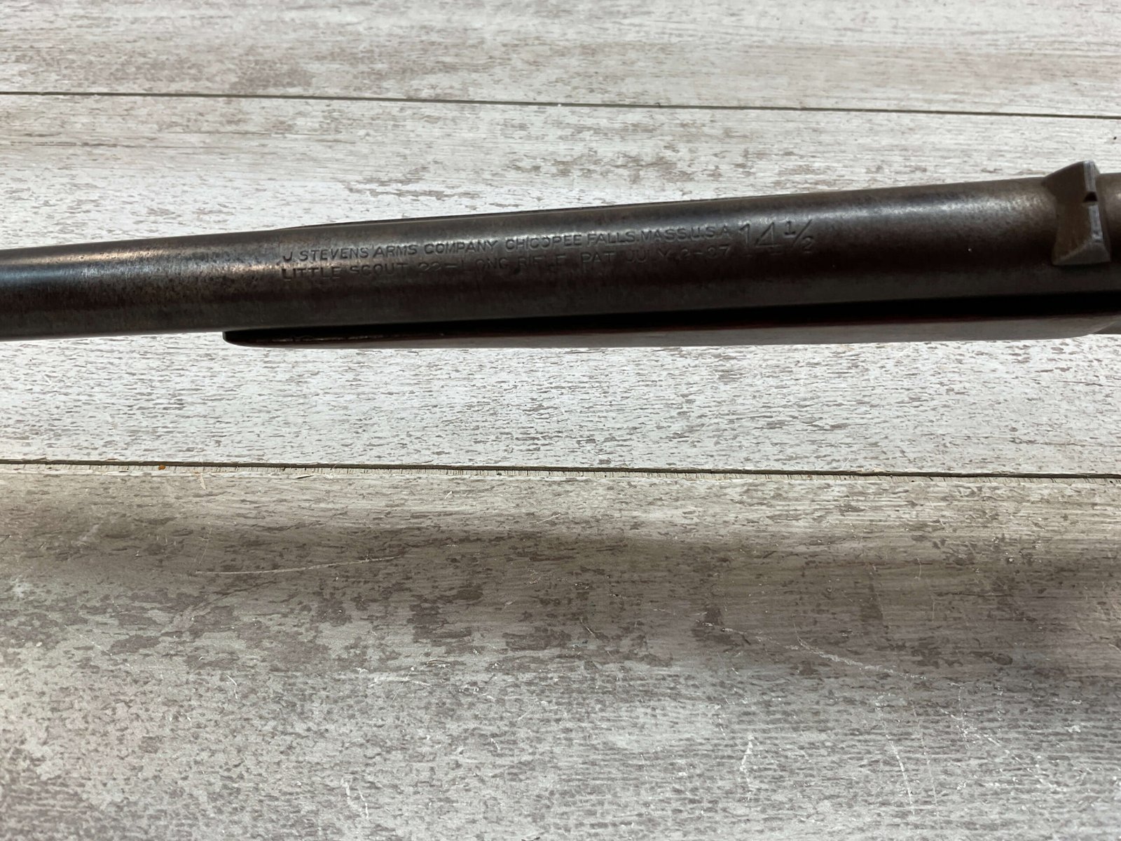 J STEVENS NO 14 1/2 LITTLE SCOUT SINGLE SHOT RIFLE #NSN, 20″ ROUND BARREL, ROLLING BREECH BLOCK ACTION, IRON FRONT & REAR SIGHTS, EXC WOOD W/LIGHT DINGS & IMPRESSIONS FROM AGE/USE, EXC BRIGHT BORE W/STRONG RIFLING, BLUE HAS TURNED GREY/BROWN PATINA, TAKEDOWN, METAL BUTT PLATE, THIS IS A REALLY NICE STEVENS W/EXCELLENT BORE, SURE TO BE A GREAT SHOOTER!!