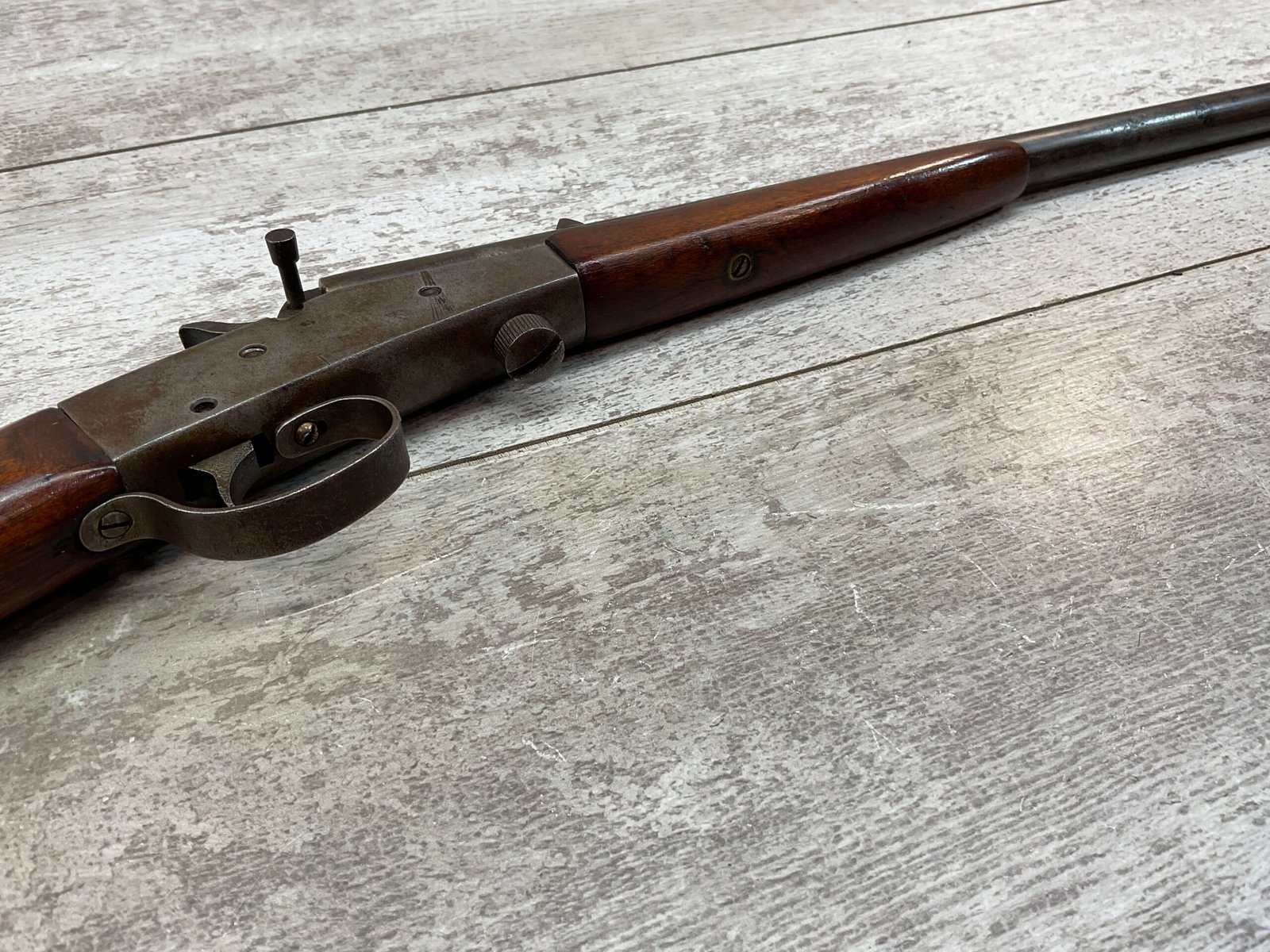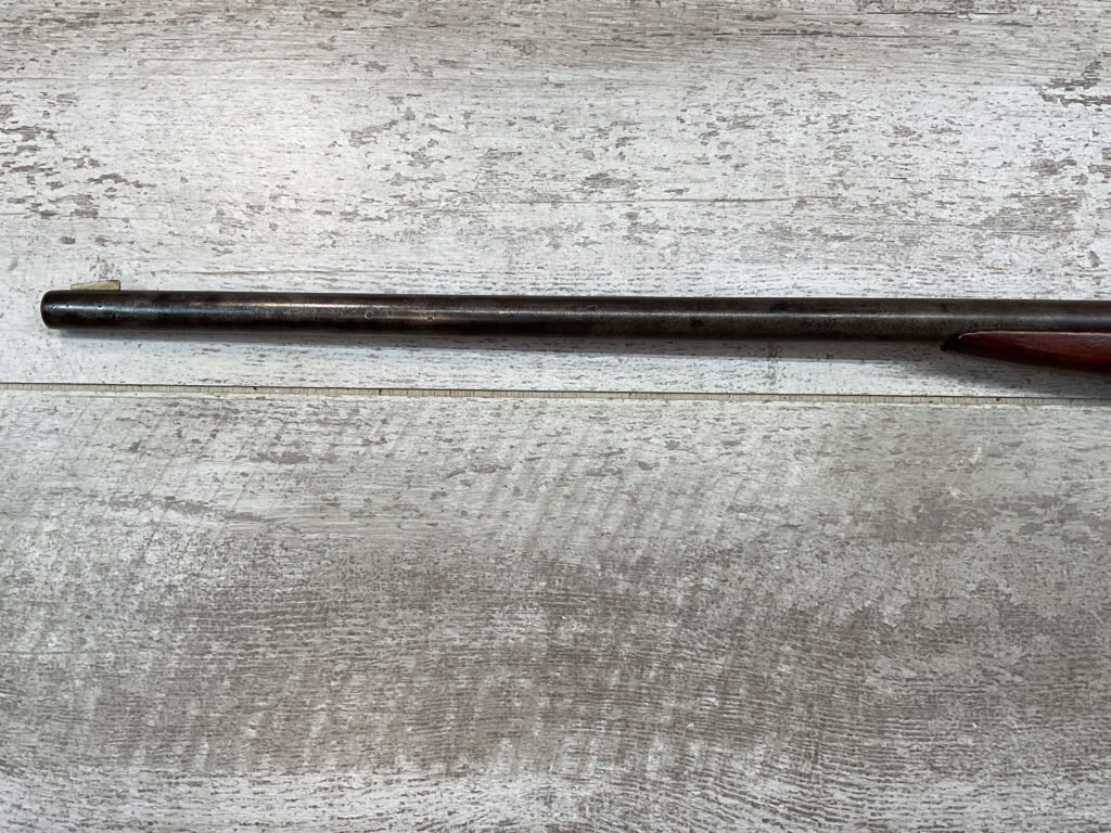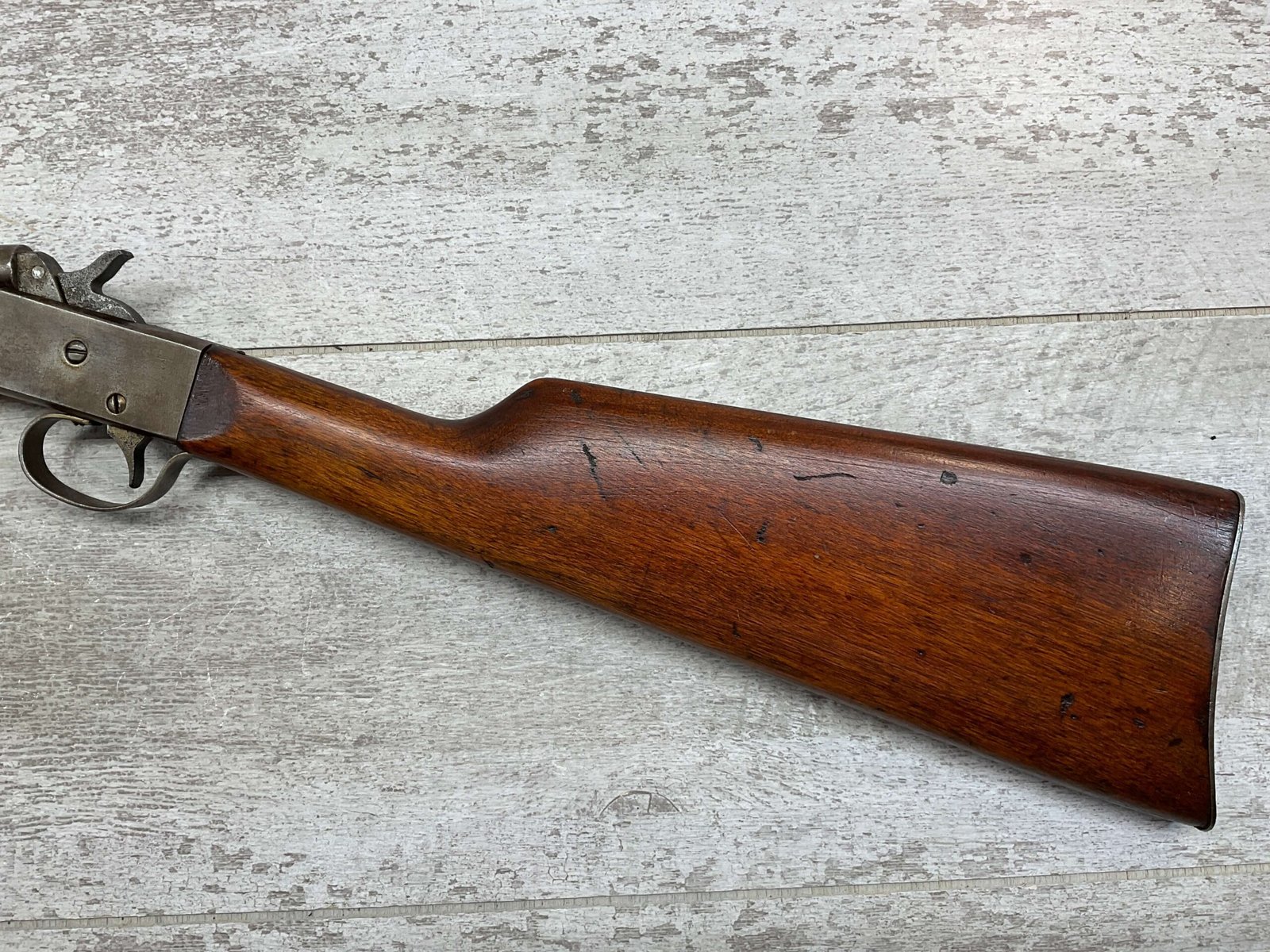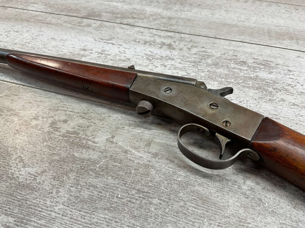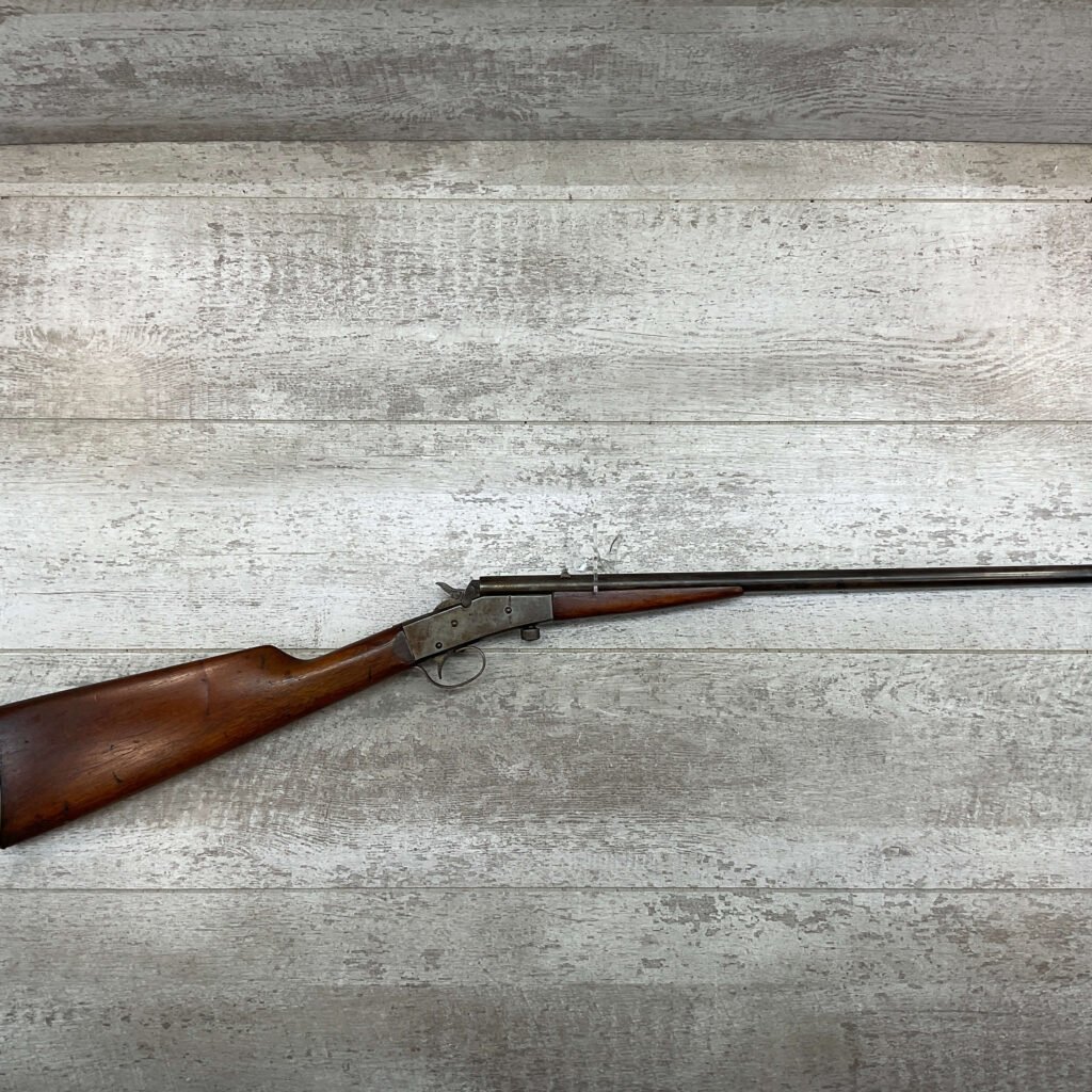 J STEVENS NO 14 1/2 LITTLE SCOUT SINGLE SHOT RIFLE #NSN, 20″ ROUND BARREL, ROLLING BREECH BLOCK ACTION, IRON FRONT & REAR SIGHTS, EXC WOOD W/LIGHT DINGS & IMPRESSIONS FROM AGE/USE, EXC BRIGHT BORE W/STRONG RIFLING, BLUE HAS TURNED GREY/BROWN PATINA, TAKEDOWN, METAL BUTT PLATE, THIS IS A REALLY NICE STEVENS W/EXCELLENT BORE, SURE TO BE A GREAT SHOOTER!!