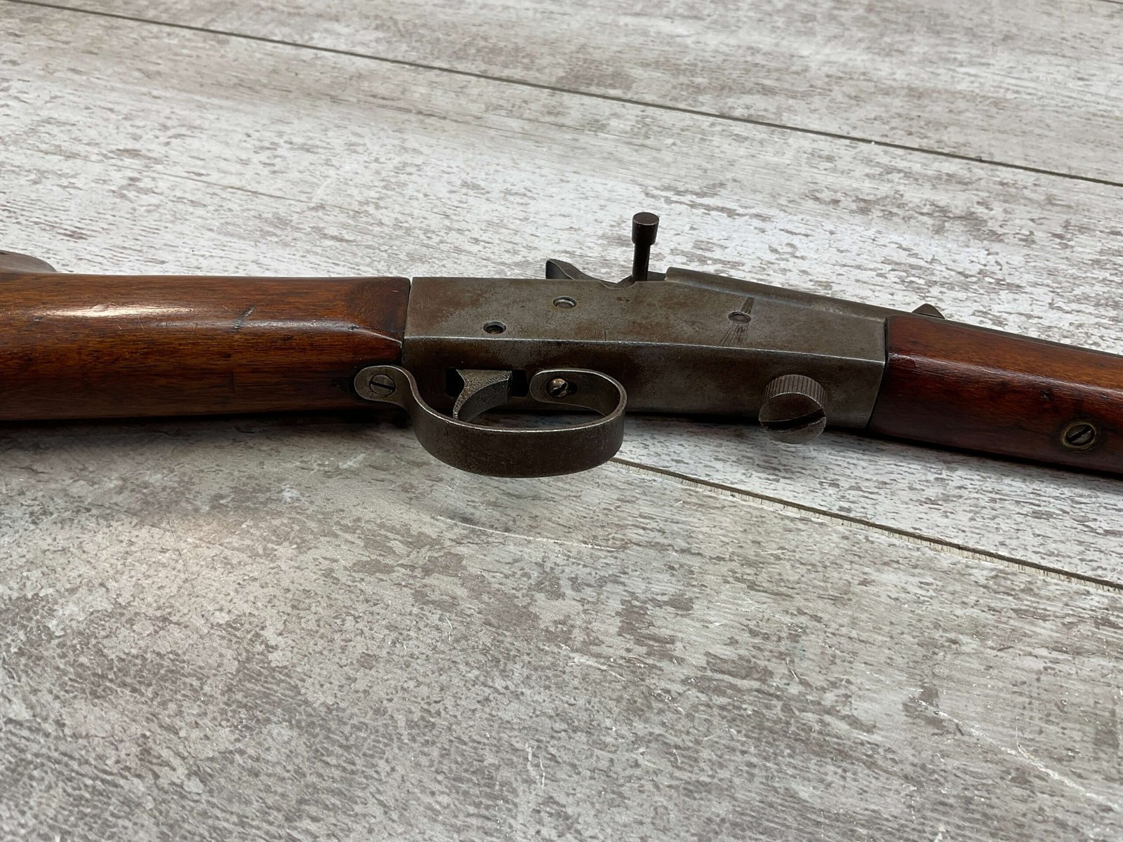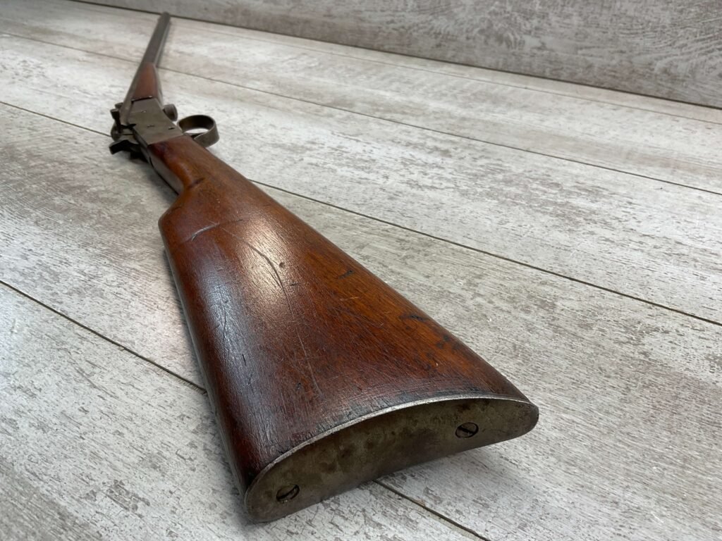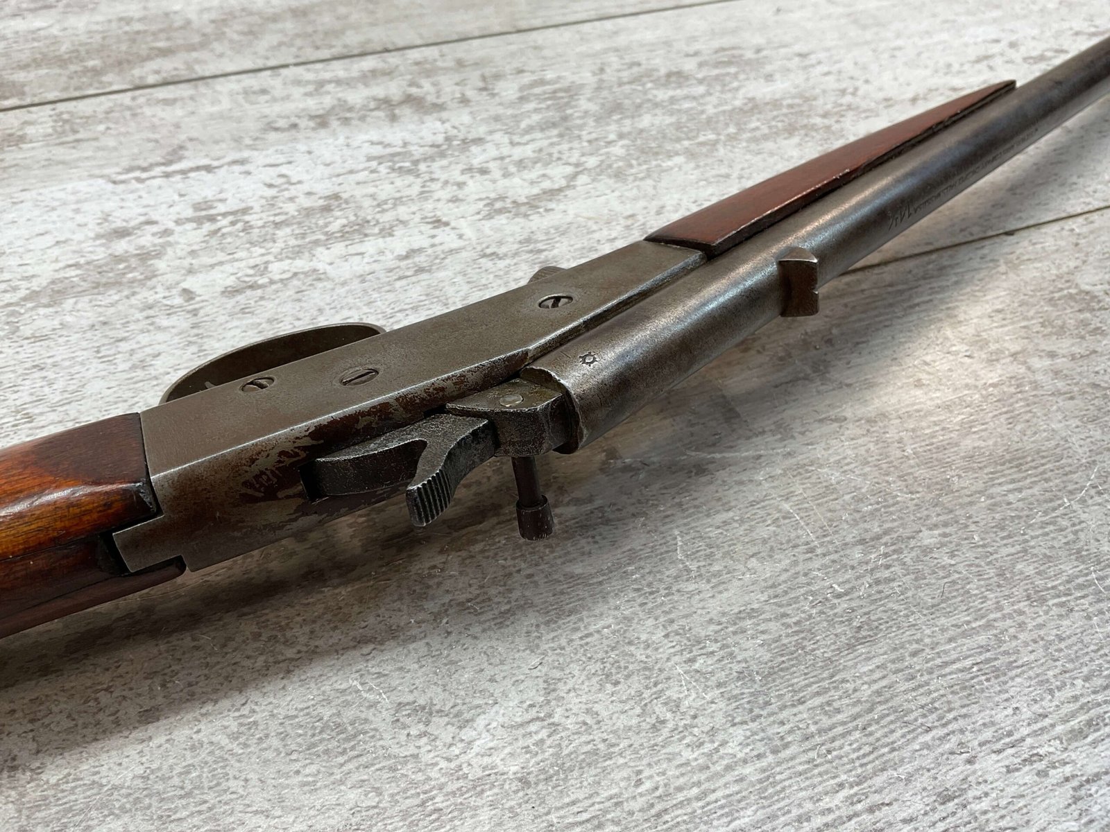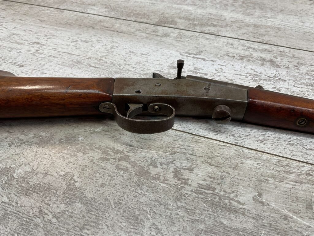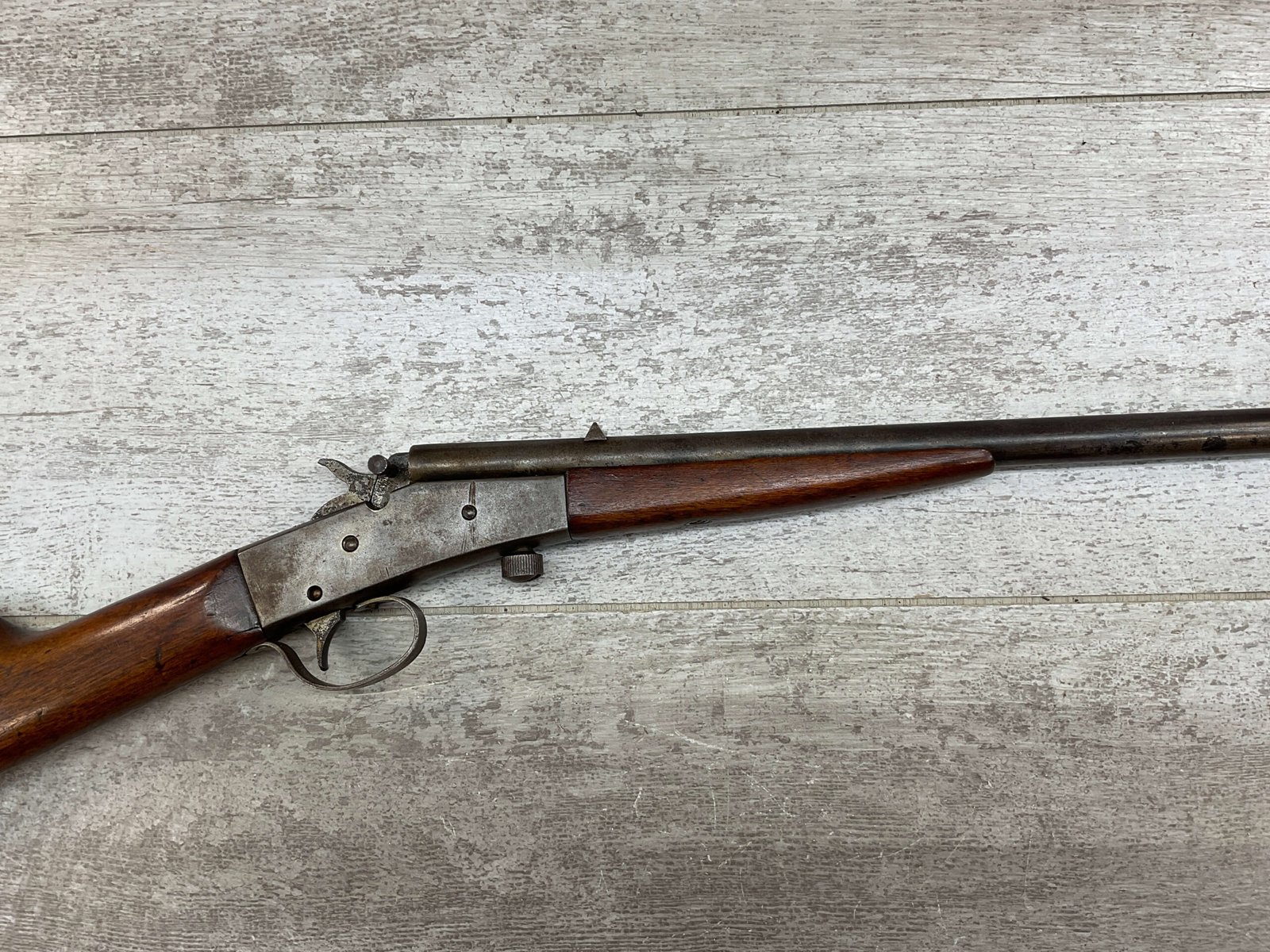 J STEVENS NO 14 1/2 LITTLE SCOUT SINGLE SHOT RIFLE #NSN, 20″ ROUND BARREL, ROLLING BREECH BLOCK ACTION, IRON FRONT & REAR SIGHTS, EXC WOOD W/LIGHT DINGS & IMPRESSIONS FROM AGE/USE, EXC BRIGHT BORE W/STRONG RIFLING, BLUE HAS TURNED GREY/BROWN PATINA, TAKEDOWN, METAL BUTT PLATE, THIS IS A REALLY NICE STEVENS W/EXCELLENT BORE, SURE TO BE A GREAT SHOOTER!!