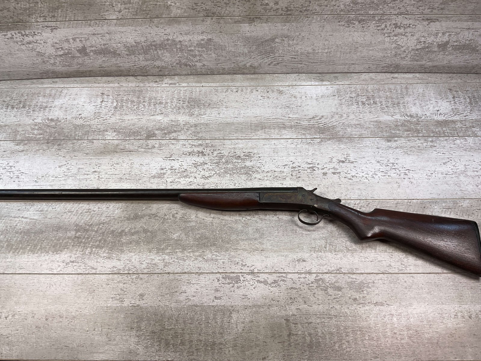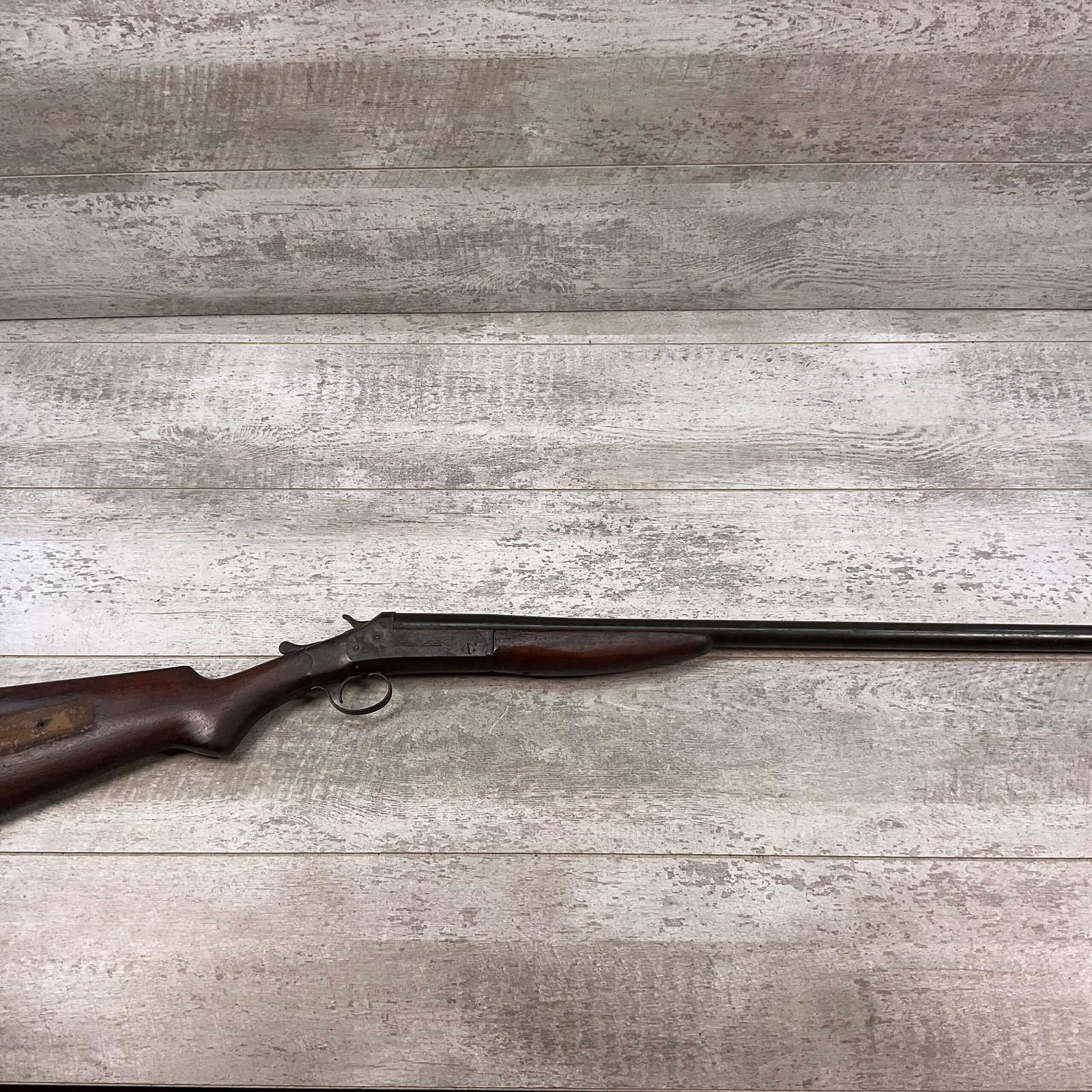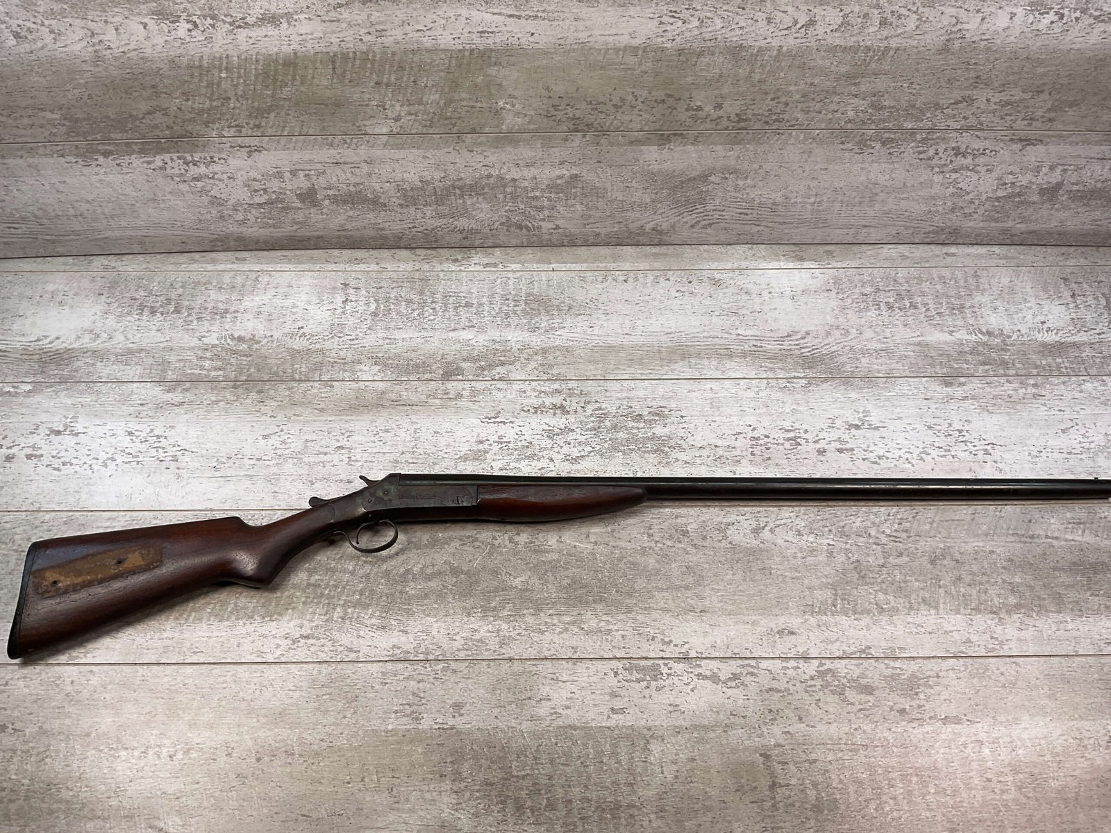 J. STEVENS “THE FULLY GUARANTEED SINGLE GUN” SINGLE SHOT BREAK ACTION 12GA SHOTGUN #NSN 32″ BARREL, CASE COLOR HARDENED RECEIVER W/BROWN PATINA, OK STOCK W/NICKS & DINGS & FINISH MISING ON RIGHT SIDE, BLACK PLASTIC BUTT PLATE, MARKED “12 GUAGE” ON LEFT SIDE OF BARREL, EXTRACTOR, SEEMS TO FUNCTION, GREAT WALL HANGER! OVERALL CONDITION AS SEEN IN PHOTOS