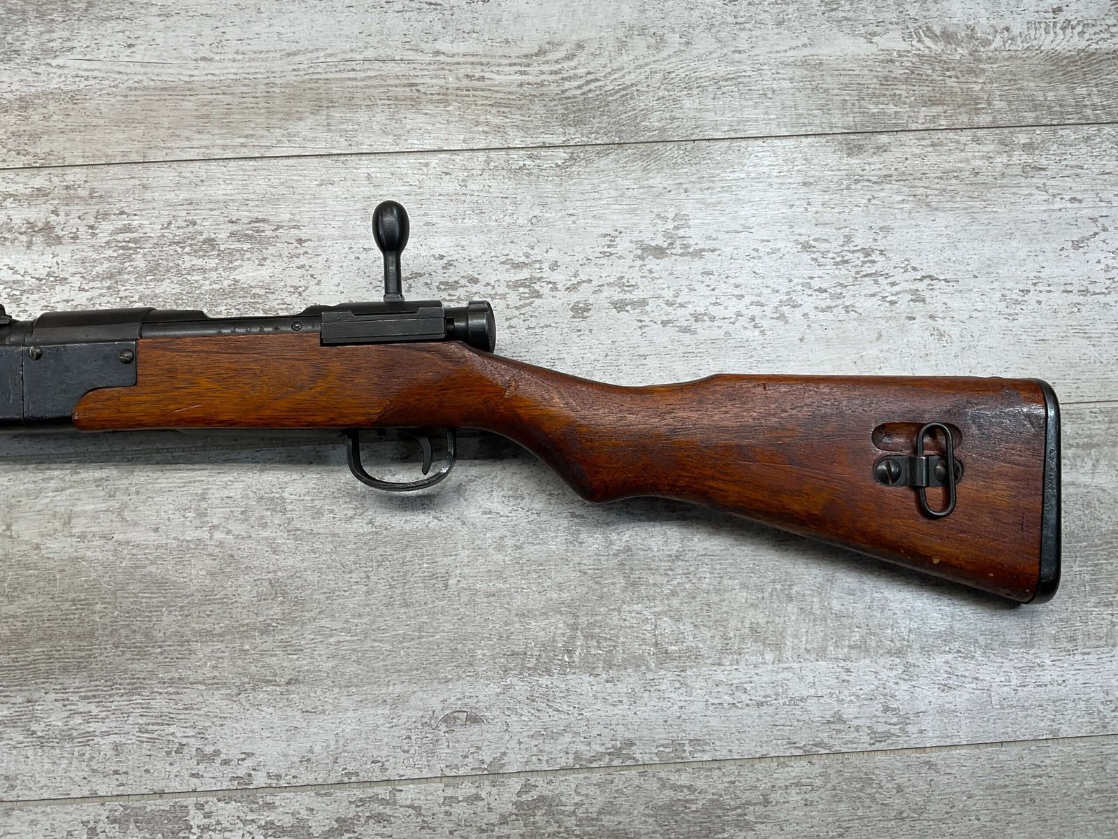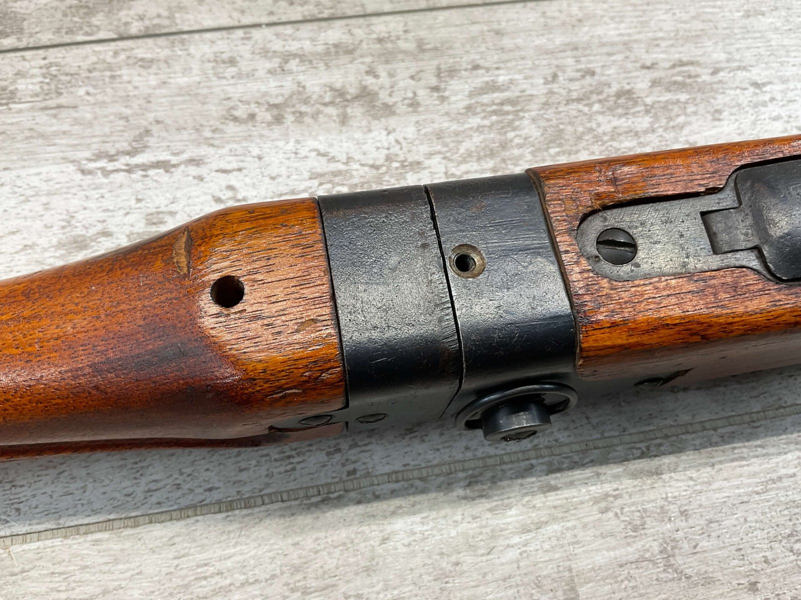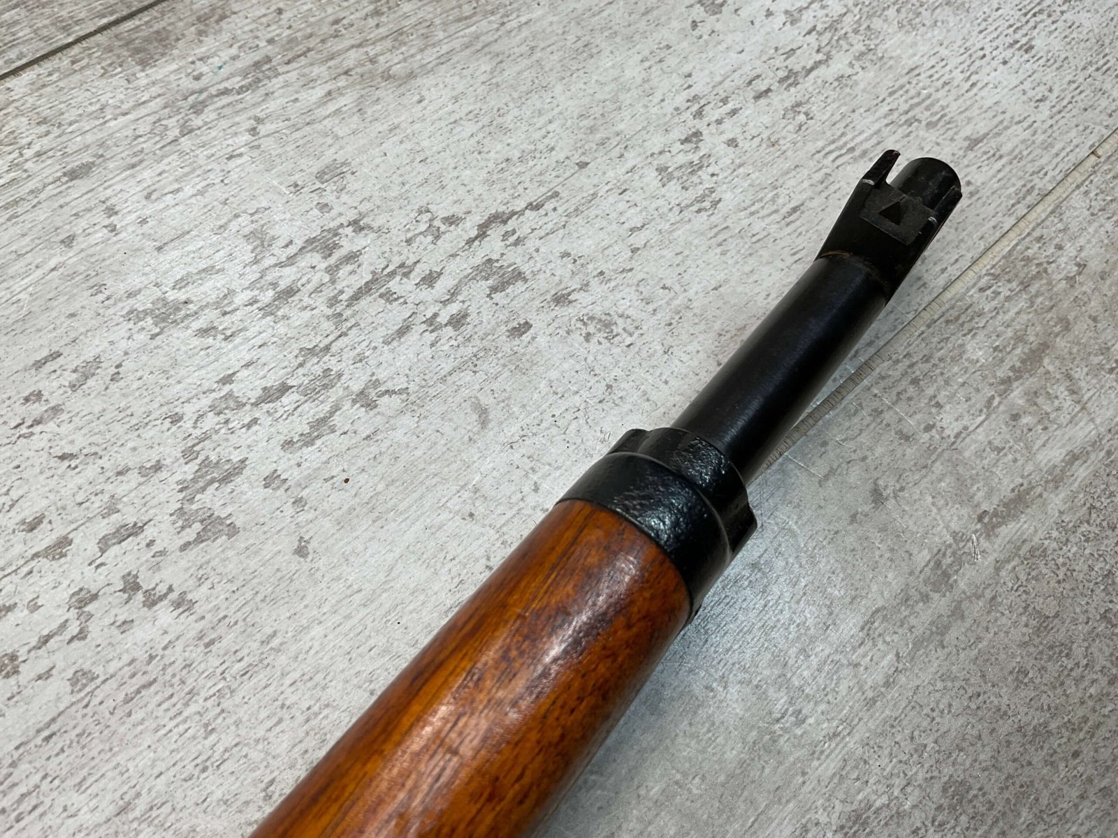The rifle’s folding stock further enhances its paratrooper-friendly design, reducing its overall length for easier handling during airborne operations. The wooden stock and handguard exhibit the classic craftsmanship of Japanese military rifles, featuring a practical and utilitarian aesthetic.