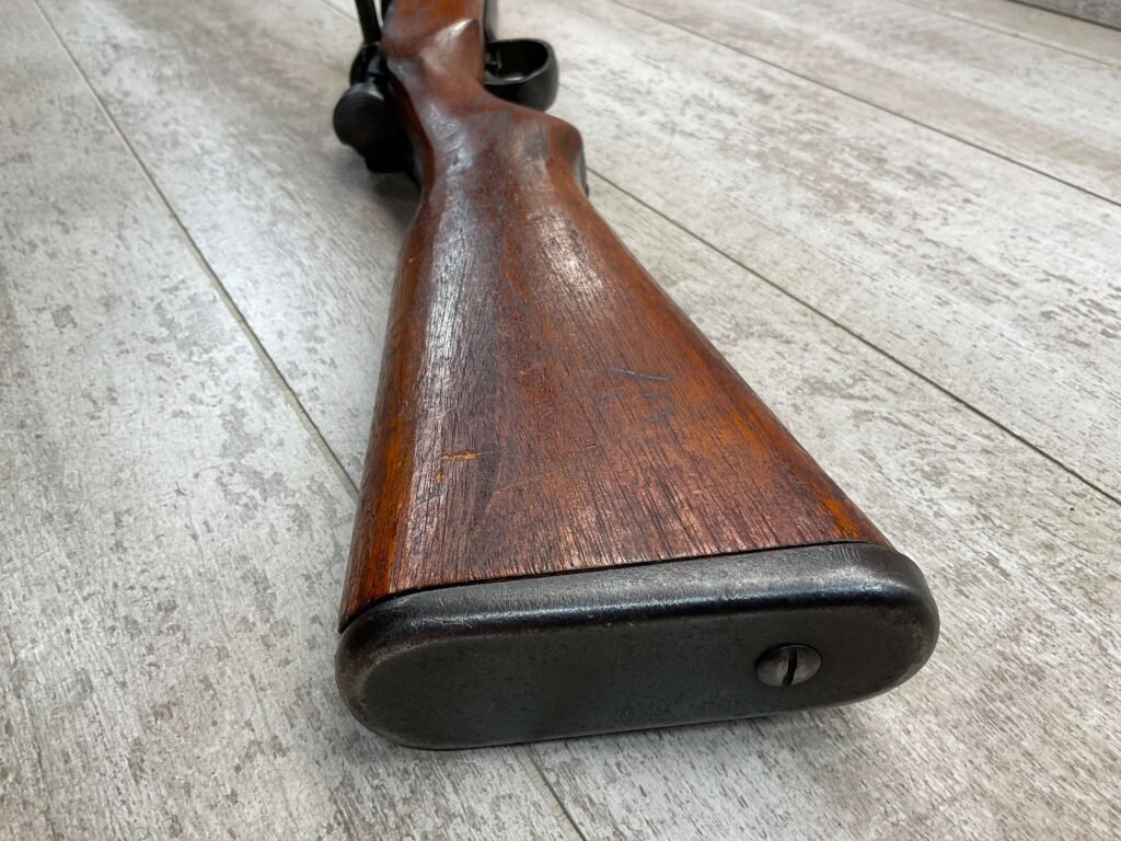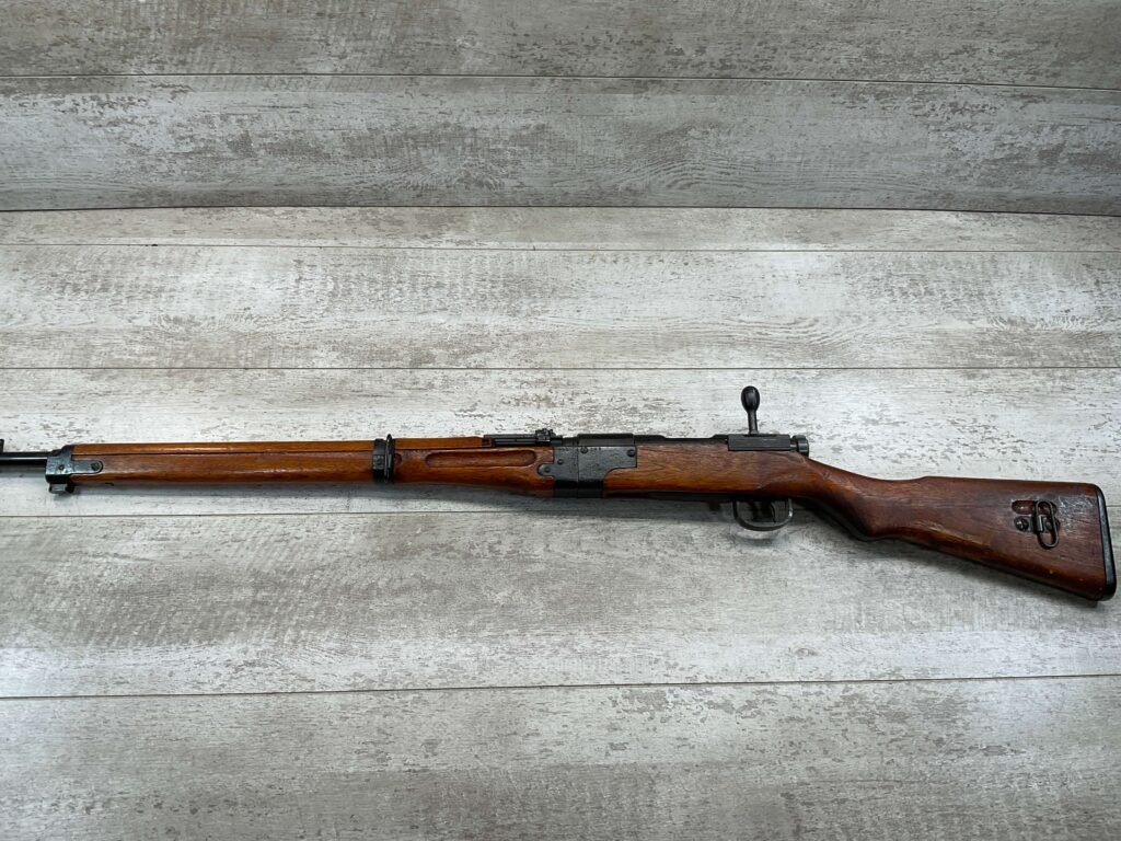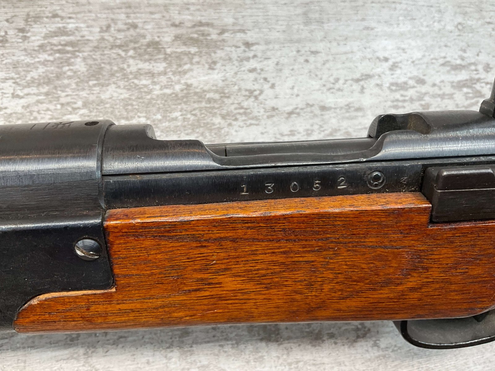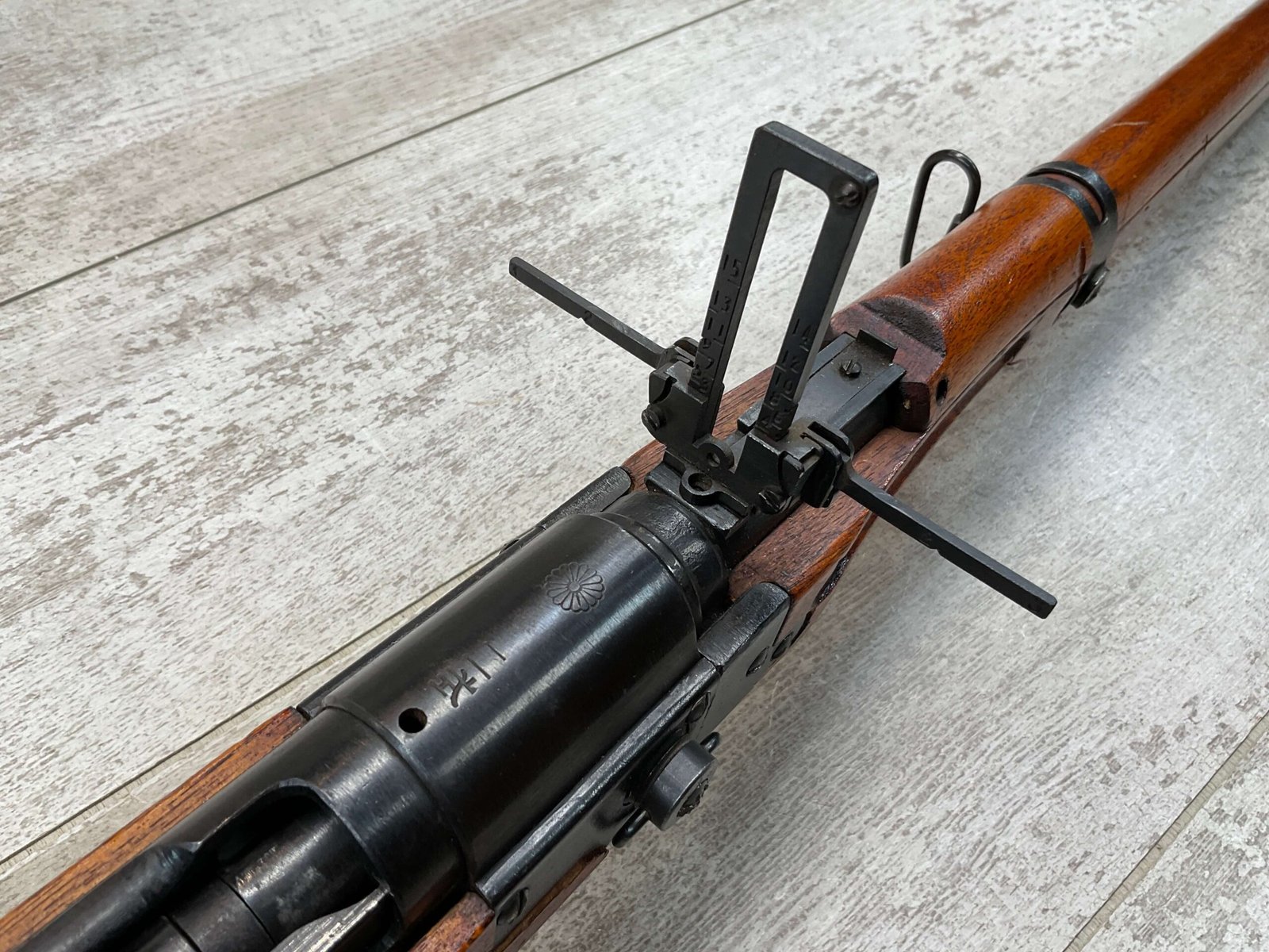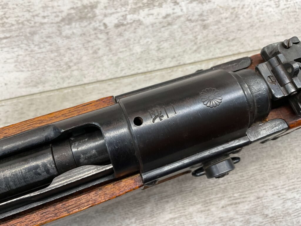 The Arisaka Type 2 is equipped with iron sights for aiming, emphasizing its intended use for short to medium-range engagements. The rifle’s historical significance is further accentuated by the presence of imperial markings and serial numbers, adding to its authenticity and collector appeal.