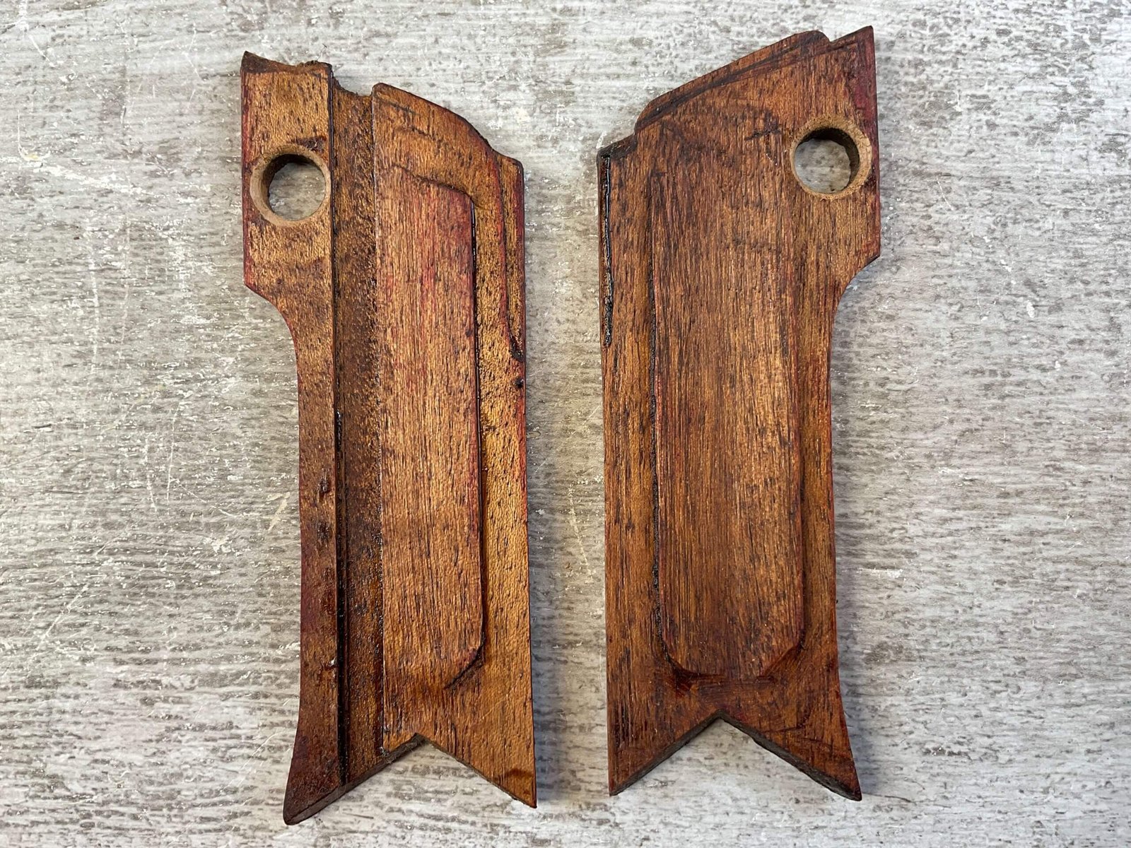JAPANESE NAMBU TYPE 14 DARK CHERRY WOODEN GRIPS, 24 GROOVES, UNMARKED, NO SCREWS, UNSURE IF REPRODUCTION OR NOT, BUT THEY LOOK TO BE USED. IN VG CONDITION.