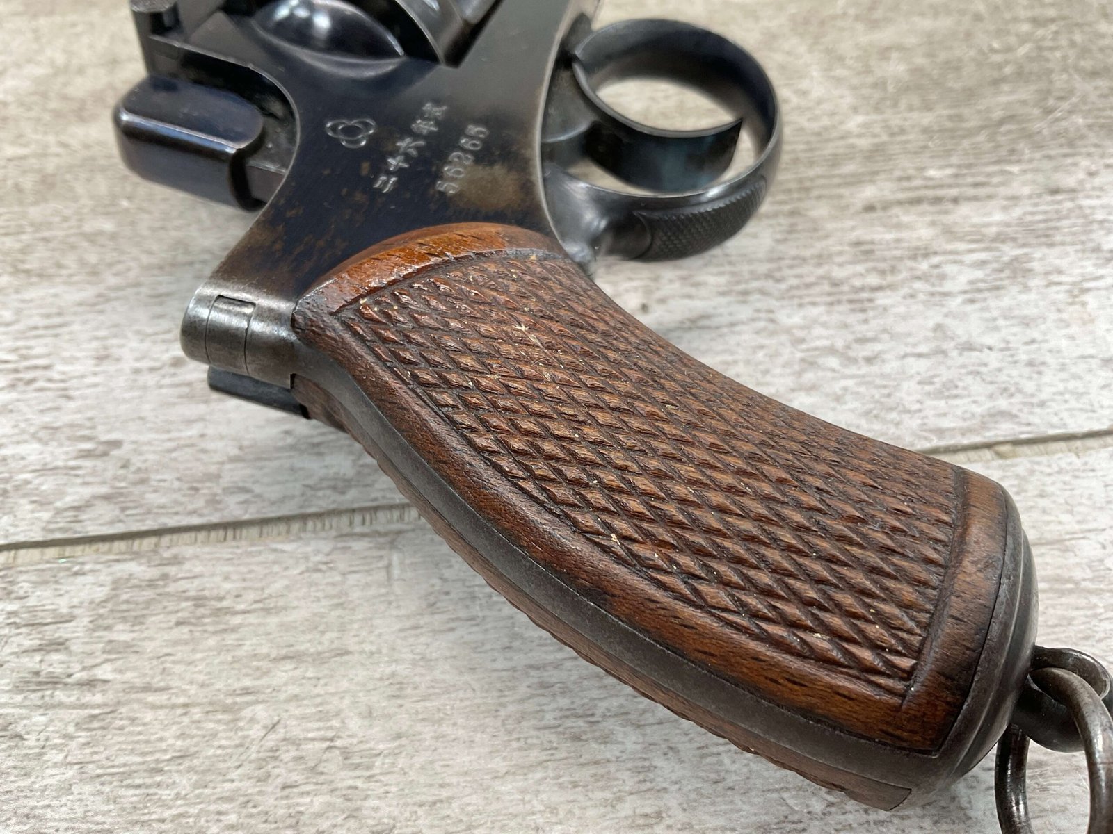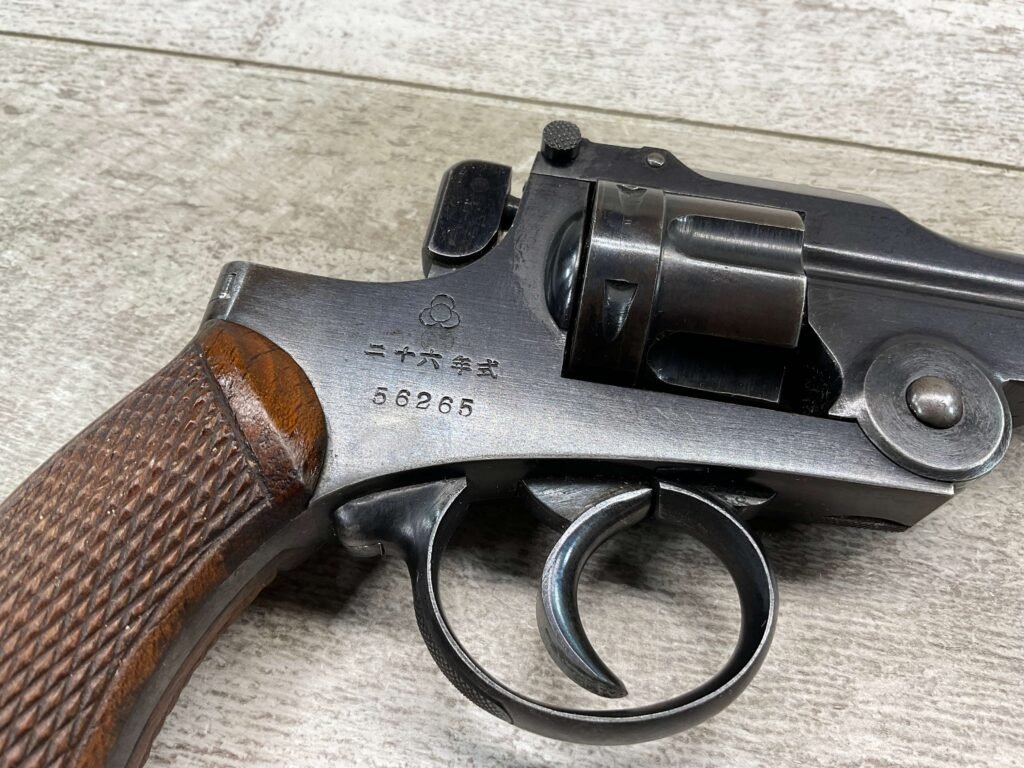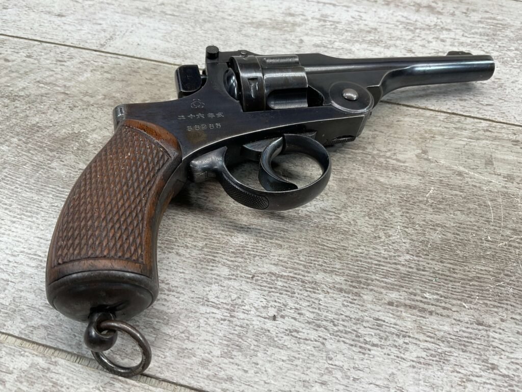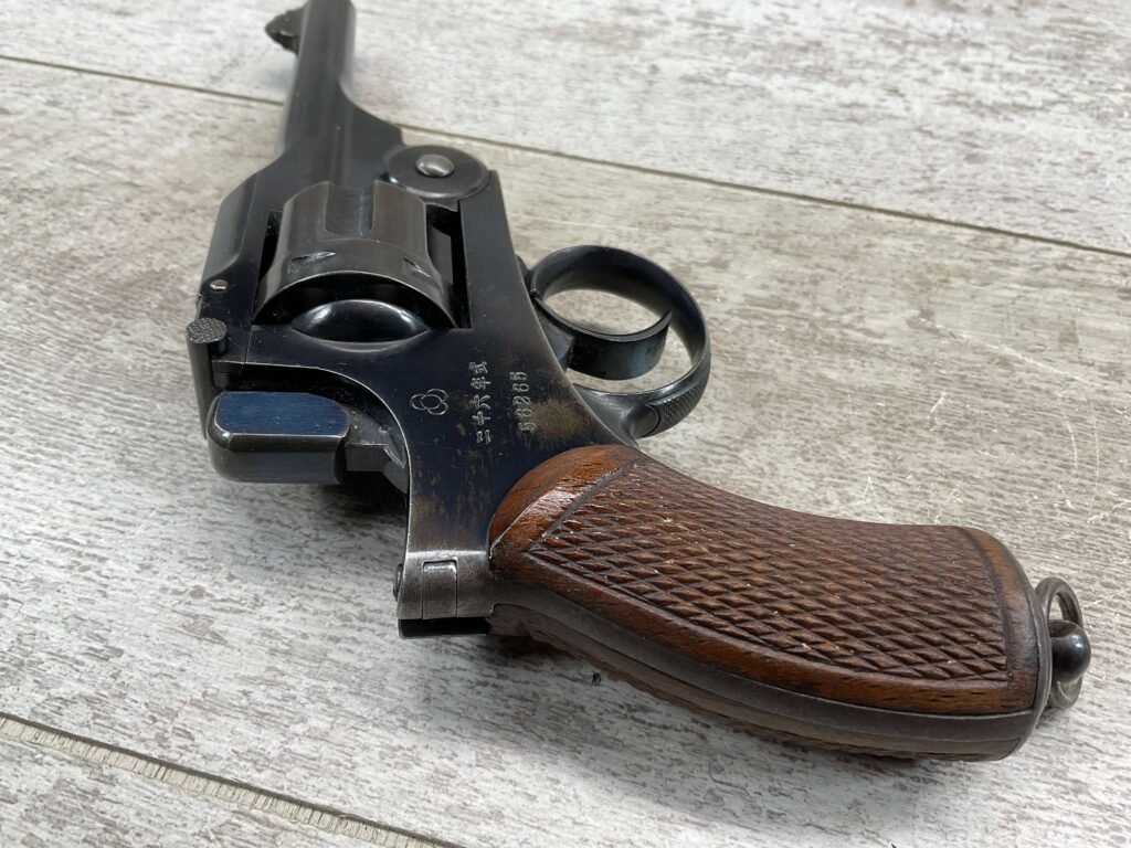 JAPANESE TYPE 26 9X22mmR REVOLVER #56265, 4 3/4″ BBL, EXC BRIGHT BORE & RIFLING, 9X22mmR, TOKYO ARTILLERY ARSENAL, PRE 1935, HAMMERLESS DESIGN, ORIGINAL BLUE FINISH W/SOME FINISH LOSS ON CYLINDER, EXC CHECKERED WOOD GRIPS, CYLINDER DOES NOT MATCH, DA DOUBLE ACTION ONLY TOP BREAK DESIGN, LANYARD LOOP, EXC OVERALL CONDITION