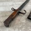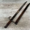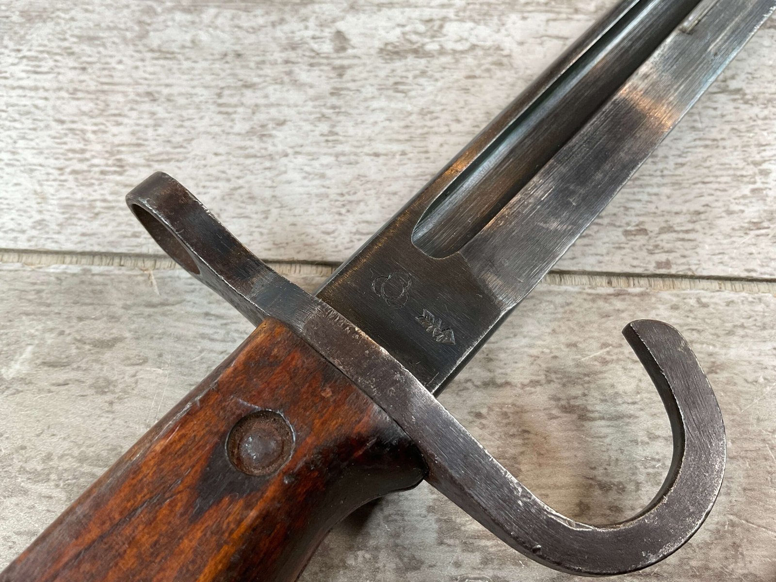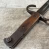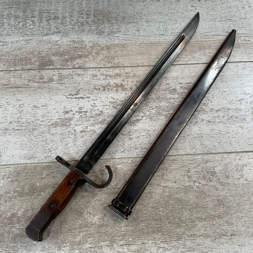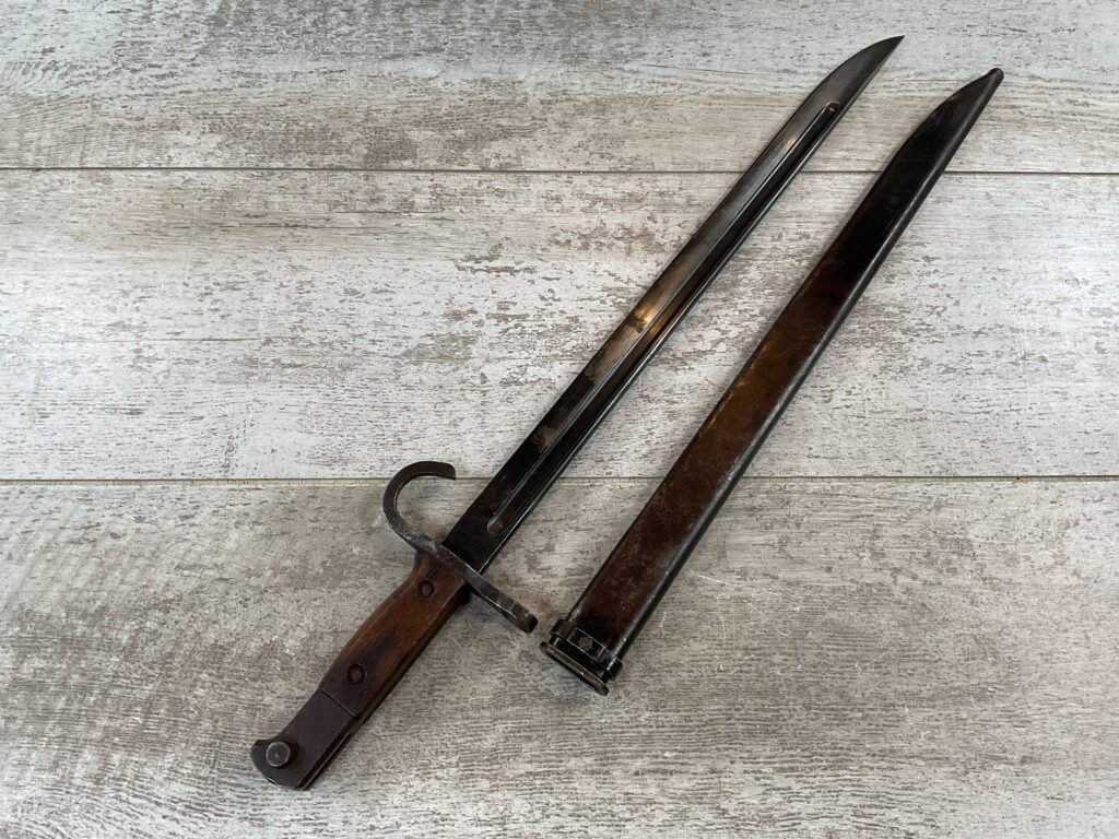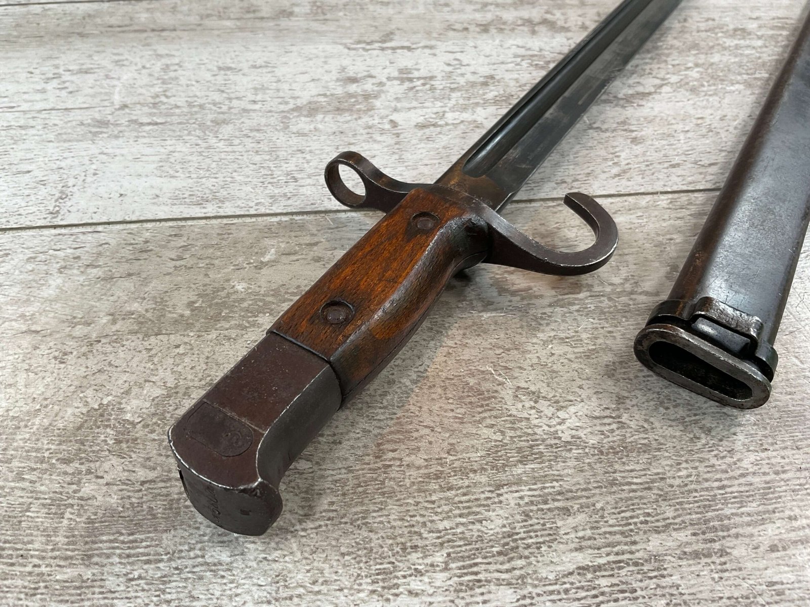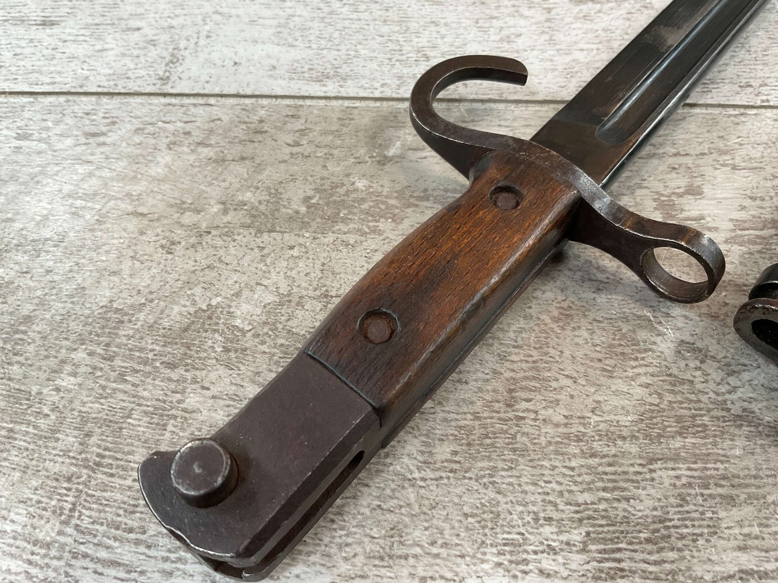 JAPANESE TYPE 30 BAYONET & METAL SCABBARD FOR ARASAKA RIFLE, VARIATION C, BACK OF PAMMEL STAMPED “58026” RICASSO STAMP INDICATES MFR BY KK MATSUSHITA KINZOKU (APPROX. MATSUSHITA METAL WORKING CORP.), BLADE LENGTH 15 5/8″, OVERALL LENGTH 20 1/8″, SIDES OF PAMMAL ARE FLAT, 2-PIECE WOOD GRIP, BLADE AND GRIPS IN GOOD CONDITION WITH WEAR MARKS FROM THE SCABBARD WOOD GRIPS SHOW WEAR FROM USE, SCABBARD IS IN GOOD CONDITION WITH NO DENTS, HIGH EDGE WEAR AND DISCOLORATION DARK BRONZE COLORATION, OVERALL THE SET IS IN GOOD/VERY GOOD CONDITION.