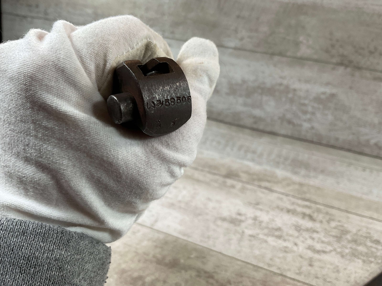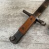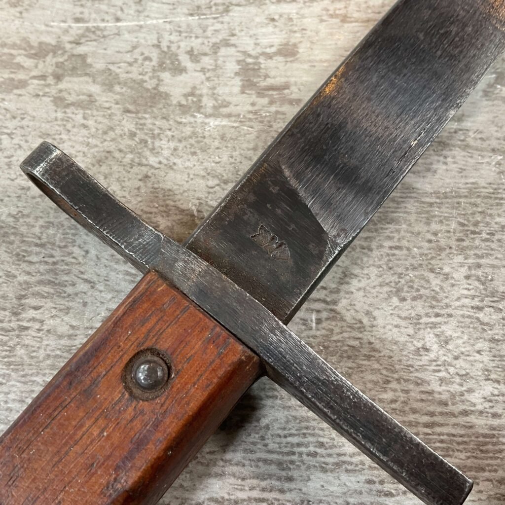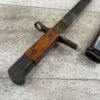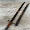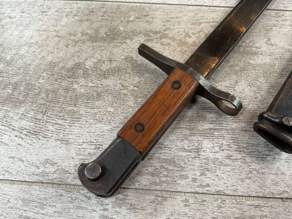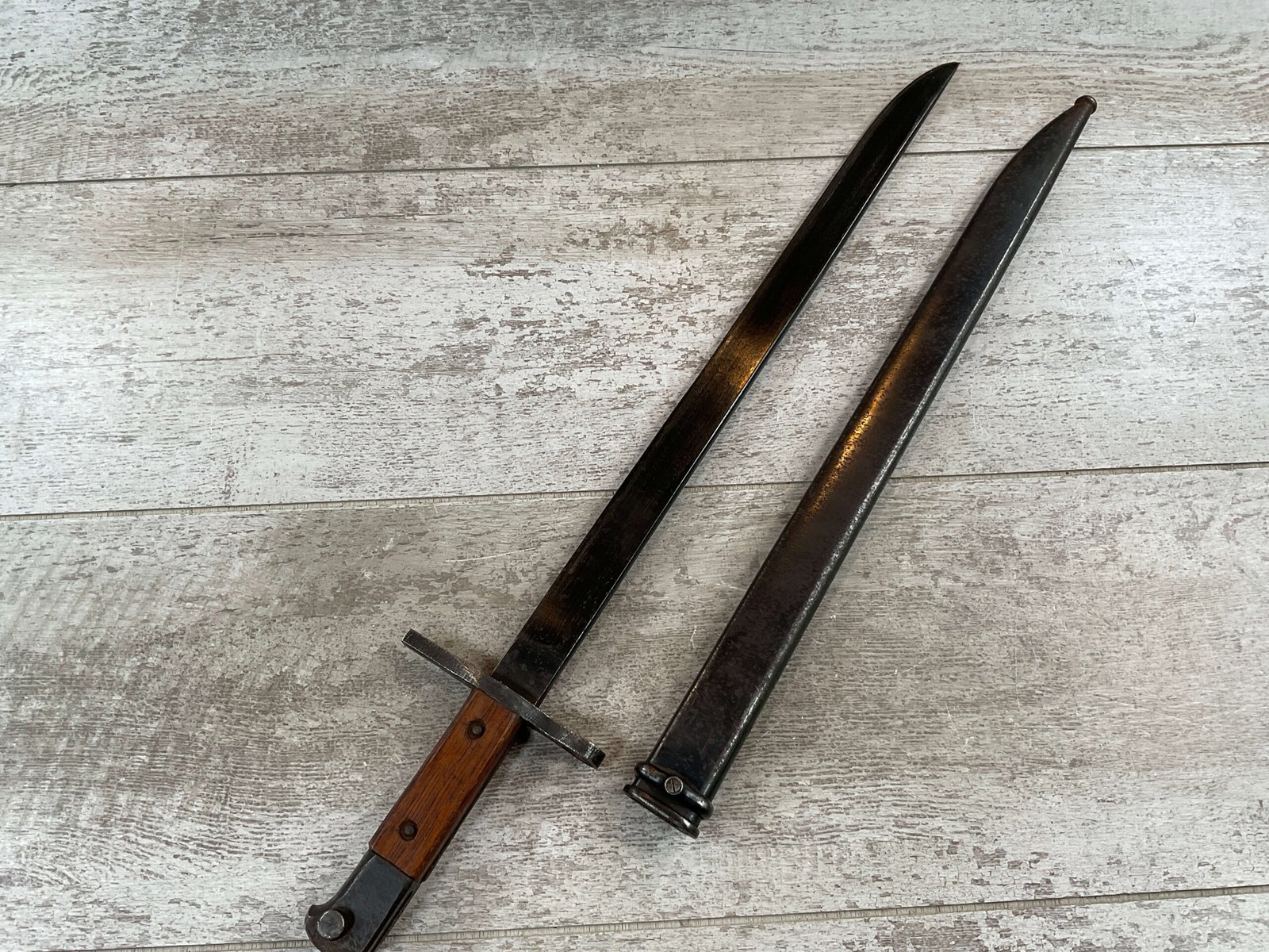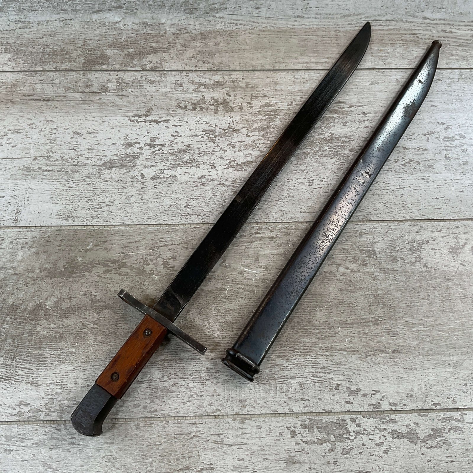 JAPANESE TYPE 30 BAYONET & METAL SCABBARD FOR ARASAKA RIFLE, VARIATION E, NO FULLER FLAT BLADE, BACK OF PAMMEL STAMPED “58506” WITH OTHER UNREADABLE STAMPS, CROSS GUARD IS STRAIGHT W/O HOOK, RICASSO STAMP INDICATES MFR BY NATIONAL DENKI (NATIONAL ELECTRIC), BLADE LENGTH 15 1/2″, OVERALL LENGTH 20″, SIDES OF PAMMAL ARE FLAT, 2-PIECE WOOD GRIP, BLADE AND GRIPS IN GOOD CONDITION WITH WEAR MARKS FROM THE SCABBARD, WOOD GRIPS SHOW WEAR FROM USE, SCABBARD IS IN GOOD CONDITION WITH NO DENTS, HIGH EDGE WEAR, AREAS OF PIN PRICK DISCOLORATION, OVERALL THE SET IS A RARE VARIATION E IN VERY GOOD CONDITION.