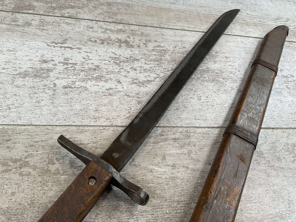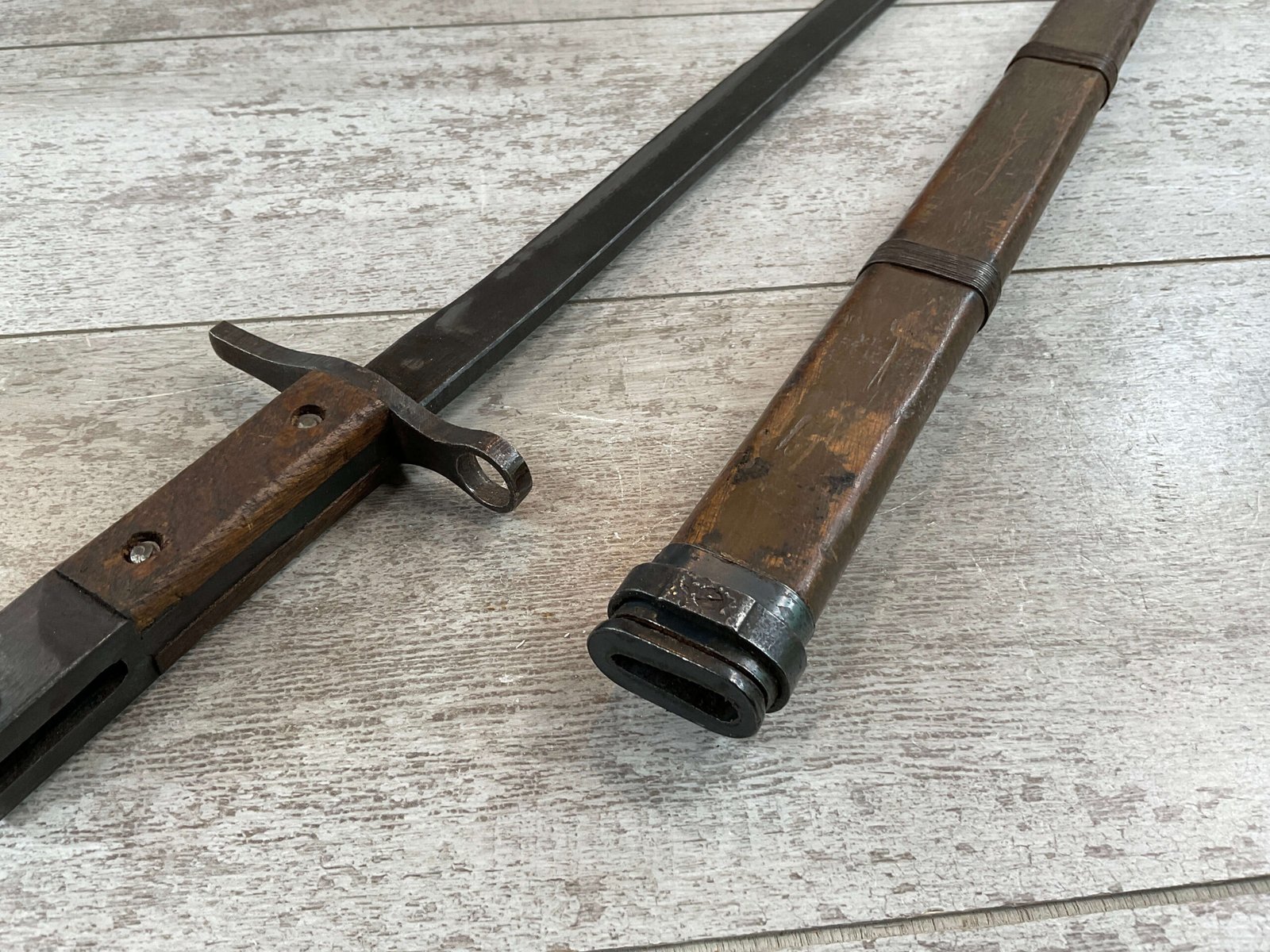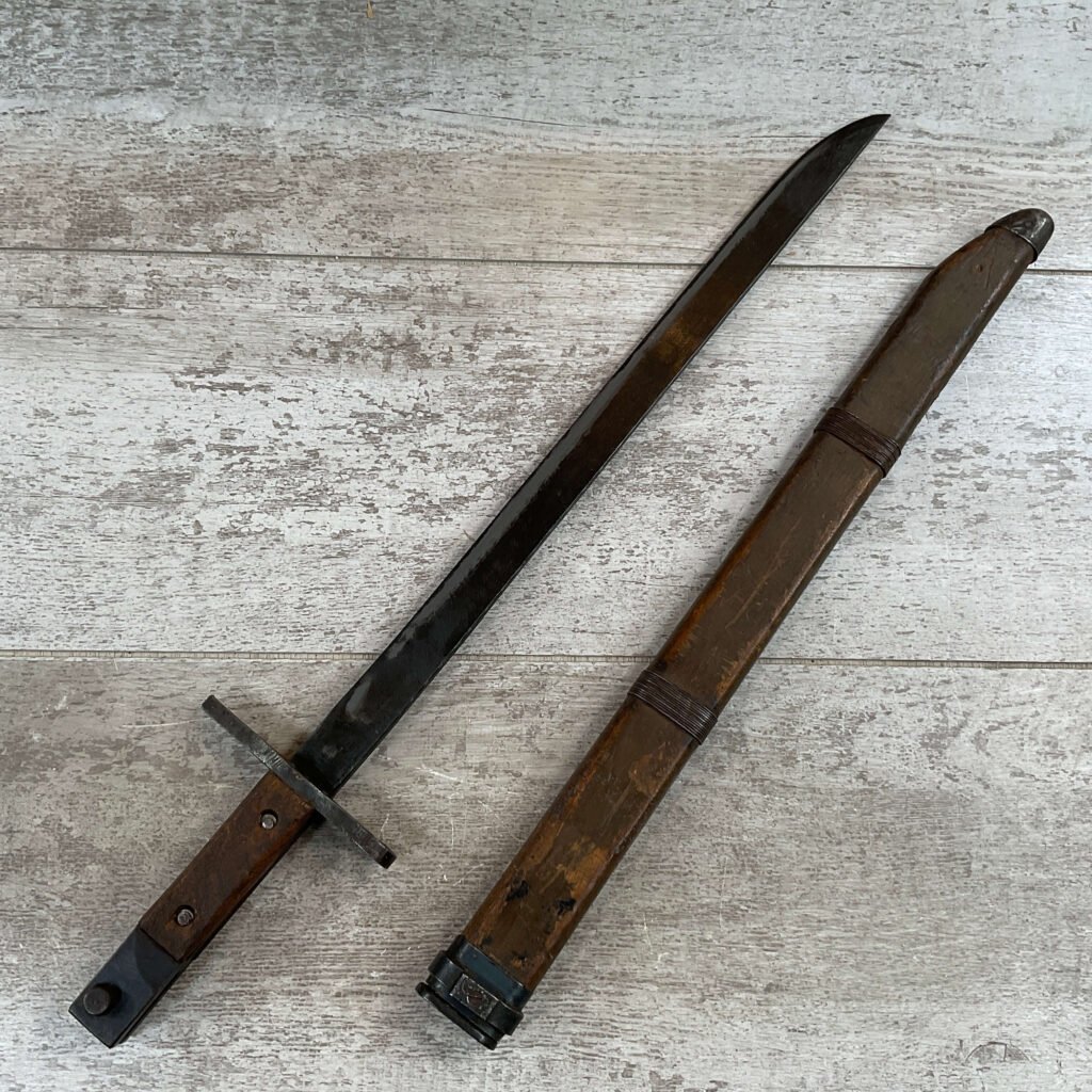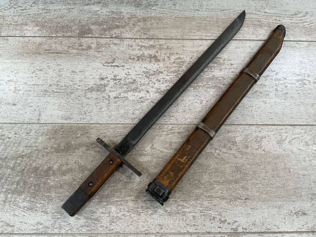 The Japanese Type 30 Bayonet, also known as the Arisaka Bayonet, is a distinctive edged weapon used by the Imperial Japanese Army during World War II. The “Last Ditch” variant refers to a version produced towards the end of the war when resources were scarce and manufacturing quality declined. Here’s a description of the Late WWII Last Ditch Type 30 Bayonet: