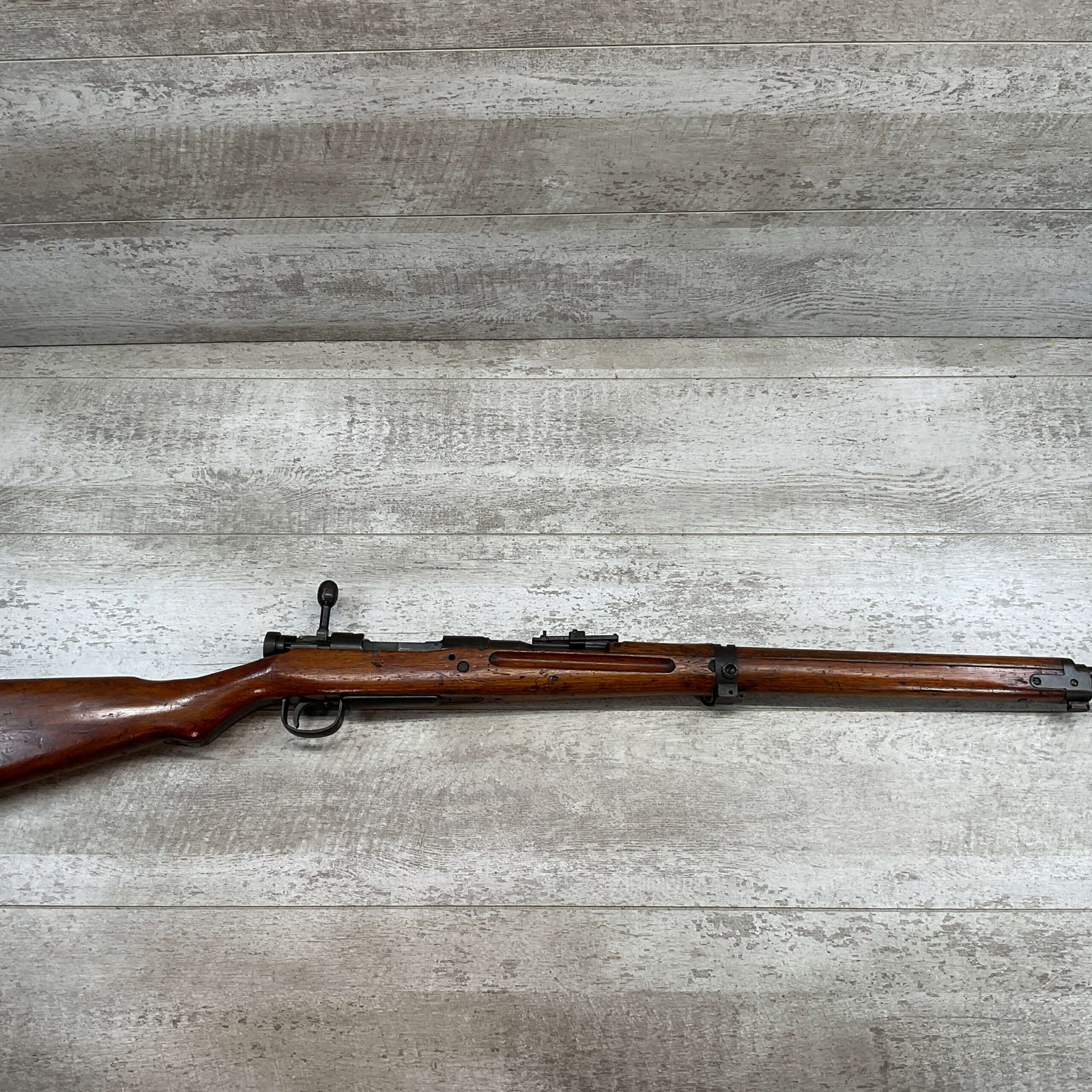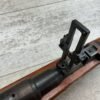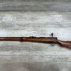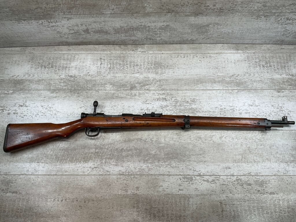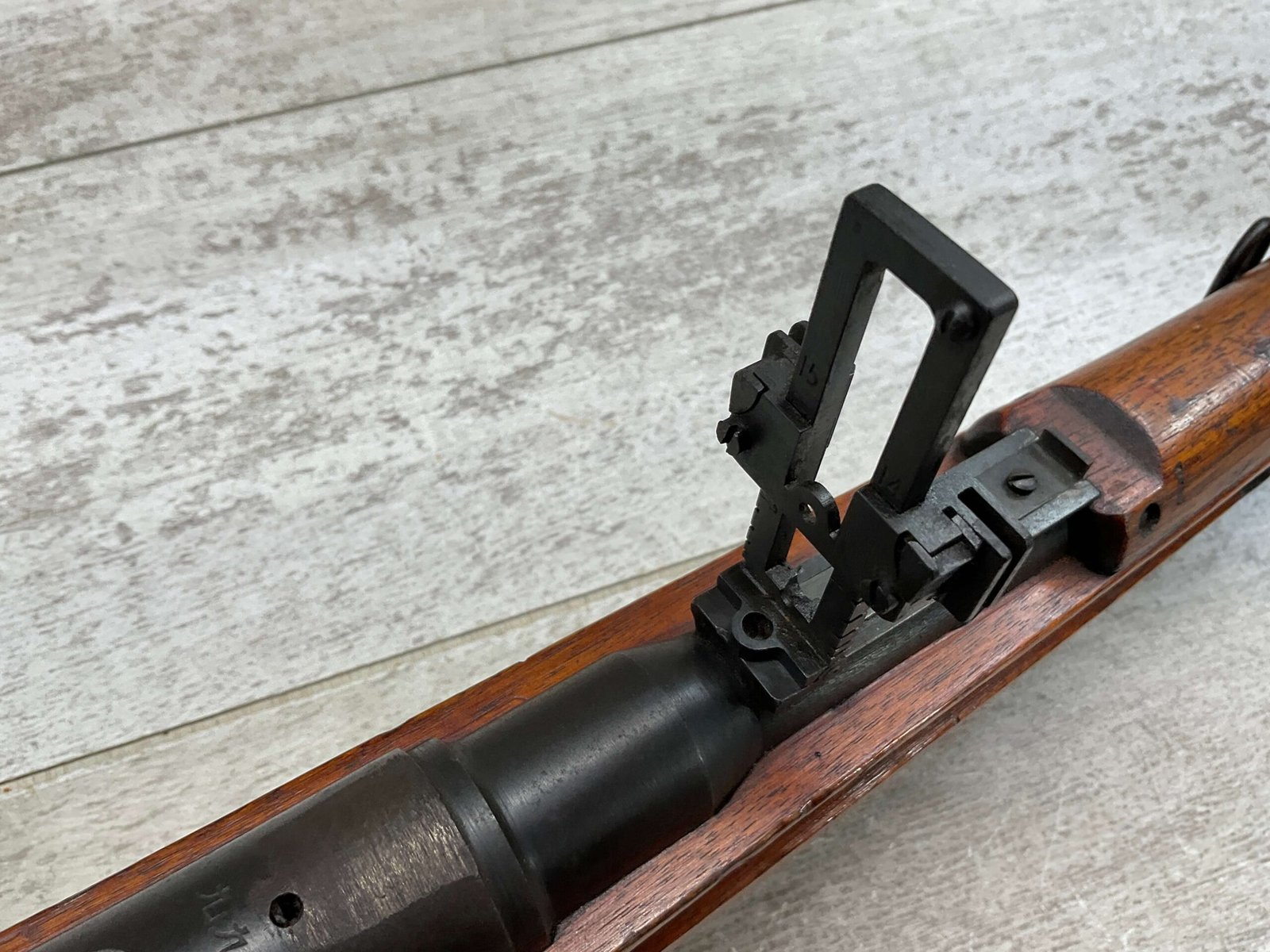 JAPANESE TYPE 99 7.7MM BOLT ACTION RIFLE #85121, 25.9″ BBL, LACKING AIRCRAFT WING CALIPERS ON REAR SIGHT, KOKURA ARSENAL SERIES 21, 90% BLUE, GOOD STOCK W/TYPICAL NICKS & DINGS, GROUND MUM, MATCHING BOLT, NO CLEANING ROD (WOODEN ROD INSERTED), NO DUST COVER, DEEP PITTING AROUND END OF MUZZLE, 85%+ OVERALL