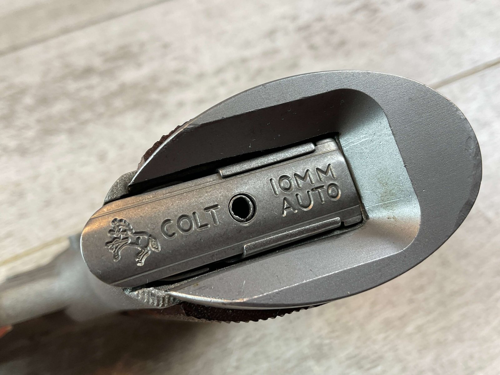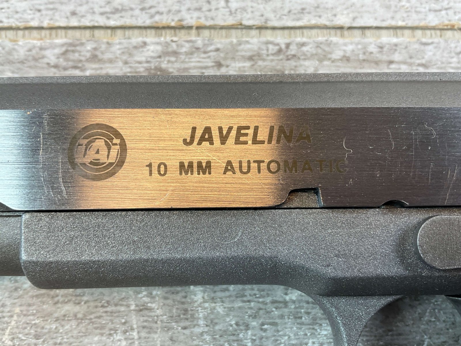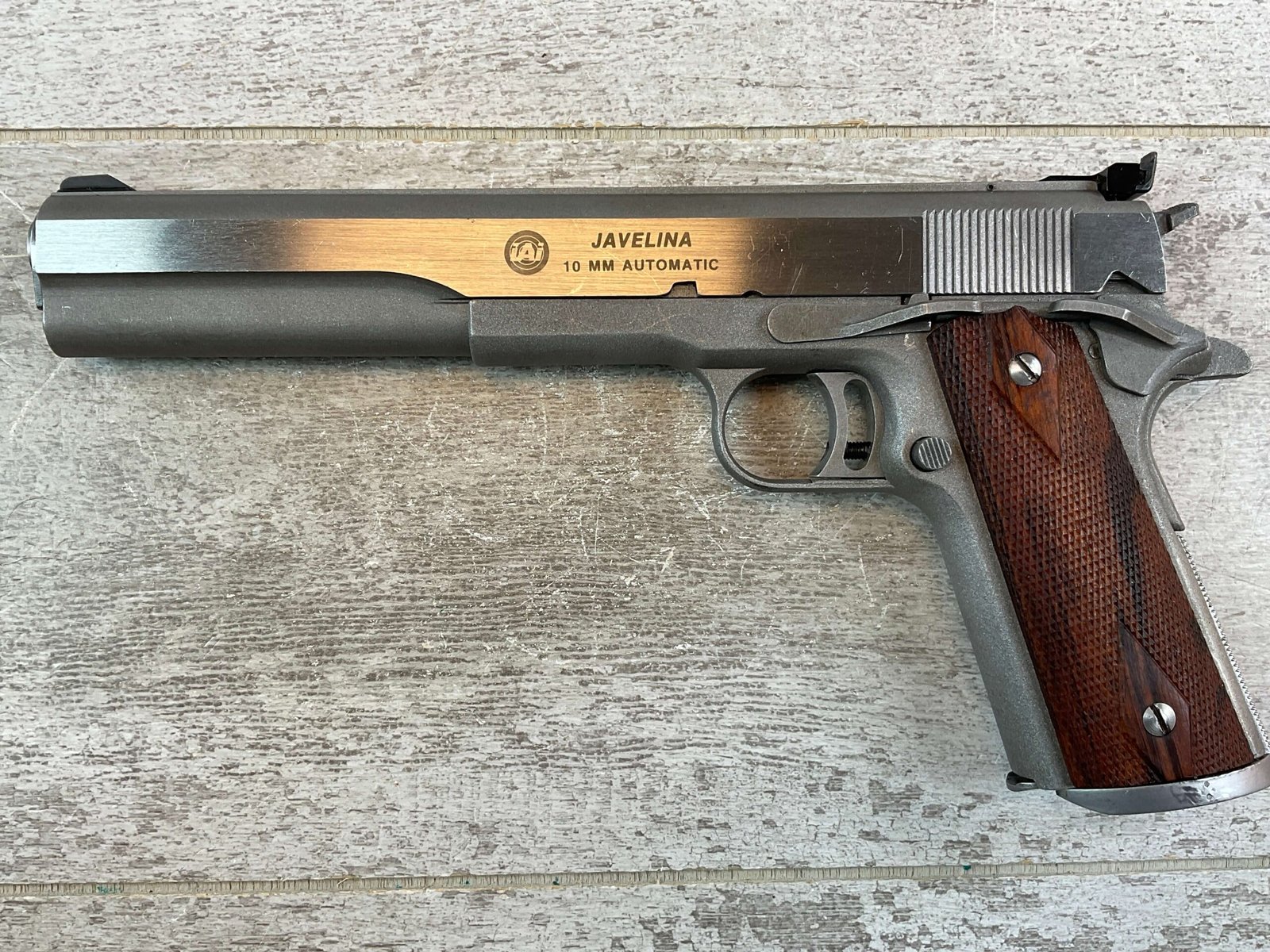 JAVELINA IAI HUNTING MODEL 10MM 7″ LONGSLIDE 1911 SEMI AUTO PISTOL, JAMES EARL JONES COLLECTION #J00339, 7″ BARREL, EXC MIRROR BORE & RIFLING, VG-EXC STAINLESS FINISH ON SLIDE W/LIGHT SIGN OF USE, EXC CHECKERED WALNUT GRIPS, THE LEFT SIDE OF THE SLIDE IS MARKED W/THE IAI LOGO AND “JAVELINA / 10 MM AUTOMATIC”. THE RIGHT SIDE OF THE FRAME IS MARKED W/THE SERIAL NUMBER, IAI LOGO AND “IRWINDALE, CA.”. THE RIGHT SIDE OF THE SLIDE IS MARKED “HUNTING MODEL”, 1 – 8 ROUND COLT MAGAZINE, MAG WELL EXTENSION, CONDITION AS SHOWN IN PICTURES, FROM THE JAMES EARL JONES “FAVORITES” COLLECTION W/ CERTIFICATE OF AUTHENTICITY.