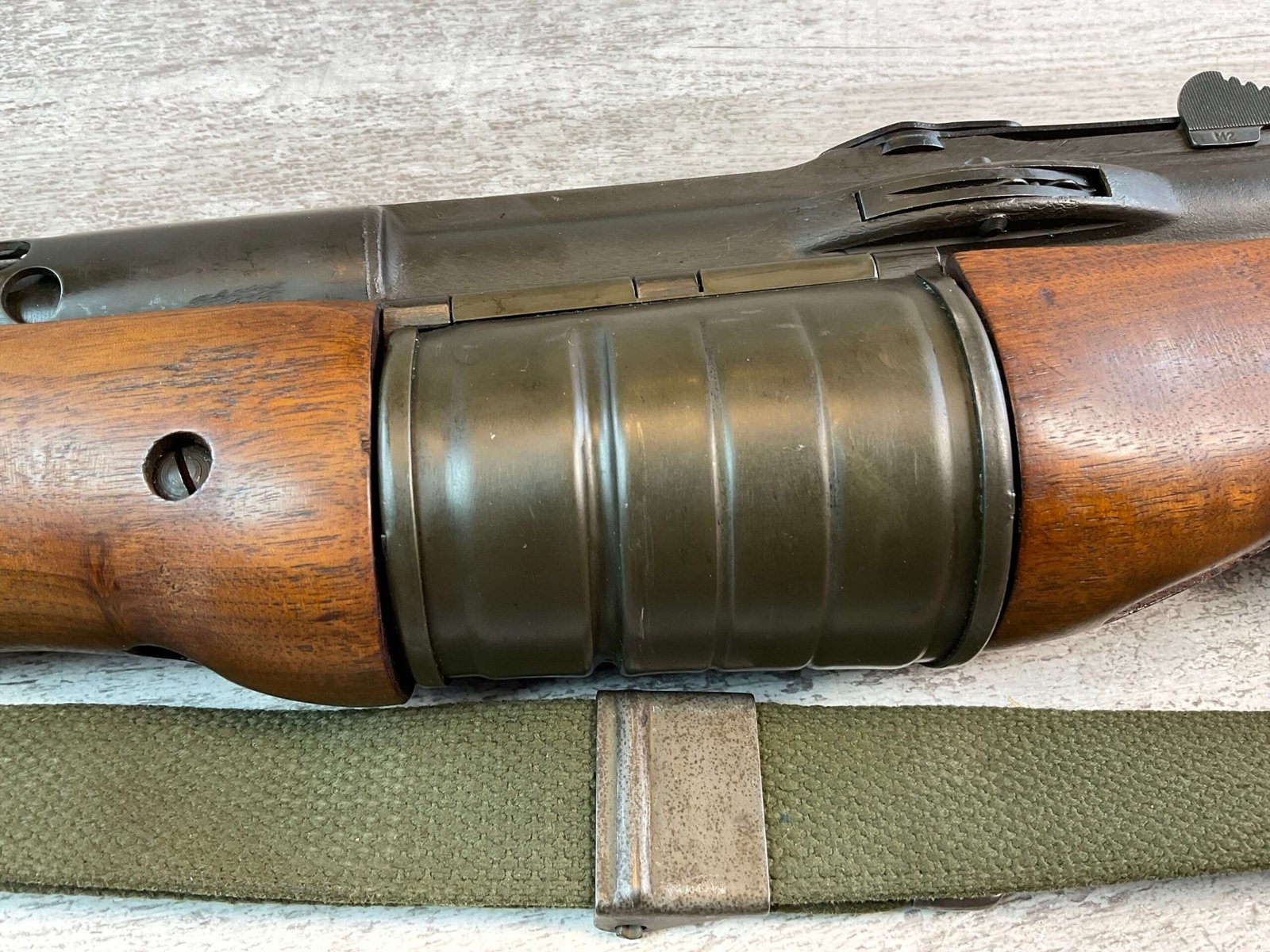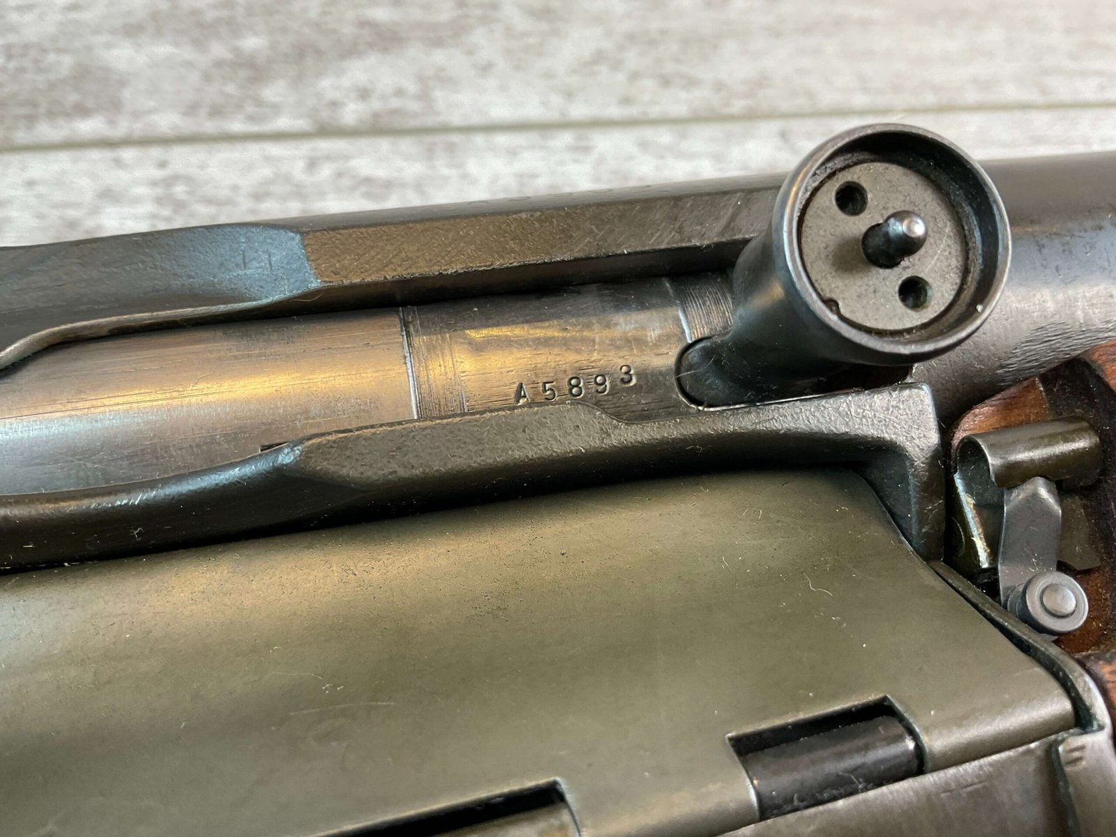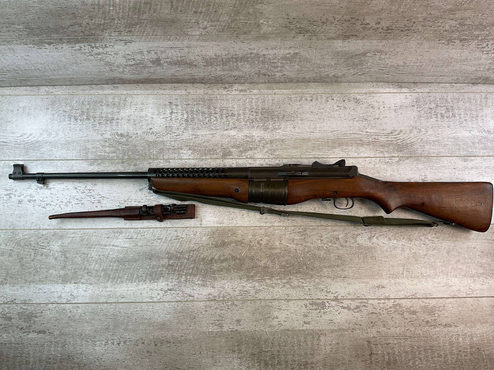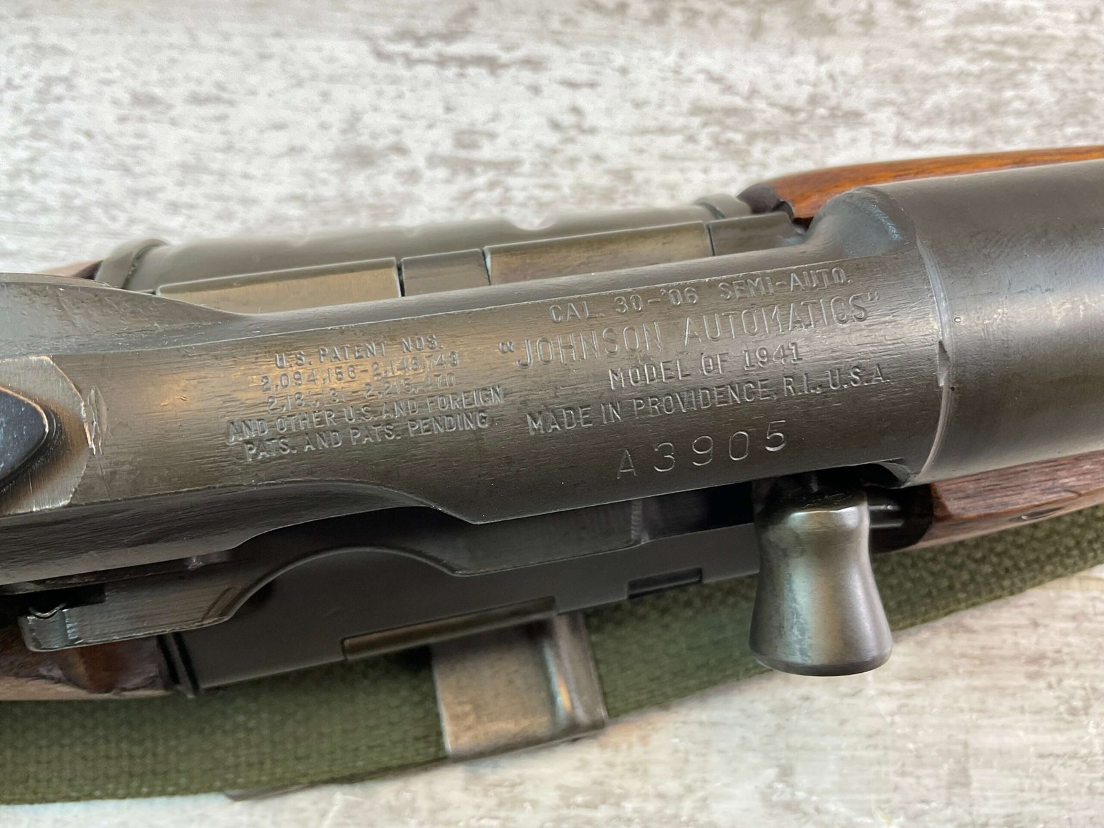 JOHNSON AUTOMATICS MODEL 1941 .30-06 CAL MILITARY RIFLE, JAMES EARL JONES COLLECTION, NEAR NEW W/ BAYONET #A3905, 22″ ORIGINAL BARREL, EXC PARKERIZED METAL FINISH, EXC WALNUT PISTOL GRIP STOCK, SHORT RECOIL OPERATED ROTATING BOLT FED BY INTERNAL 10 SHOT ROTARY MAGAZINE, ADJ TANGENT REAR SIGHT & BLADE FRONT SIGHT, TOP OF RECEIVER SHOWS CORRECT MARKING OF “U.S. PATENT NOS./2,094,156-2,146,749/2,181,131-2,215,470/AND OTHER U.S. AND FOREIGN/PATS. AND PATS. PENDING. MODEL MARKING READS CAL. 30-’06 SEMI-AUTO/”JOHNSON AUTOMATICS”/MODEL OF 1941/MADE IN PROVIDENCE, R.I., U.S.A.”, RIGHT RECEIVER SHOW “CRANSTON/ARMS/CO” IN TRIANGLE, OIL FINISH, GREEN CANVAS SLING, ORIGINAL UNISSUED BAYONET (STILL HAS PLASTIC DIP ON “HANDLE” AREA) VG-EXC LEATHER HOLSTER FOR BAYONET, NOT SURE YOU WILL FIND ANOTHER BAYO OR GUN IN THIS REMARKABLE VERY RARE CONDITION, CONDITION AS SHOWN IN PICTURES, FROM THE JAMES EARL JONES “FAVORITES” COLLECTION W/ CERTIFICATE OF AUTHENTICITY.