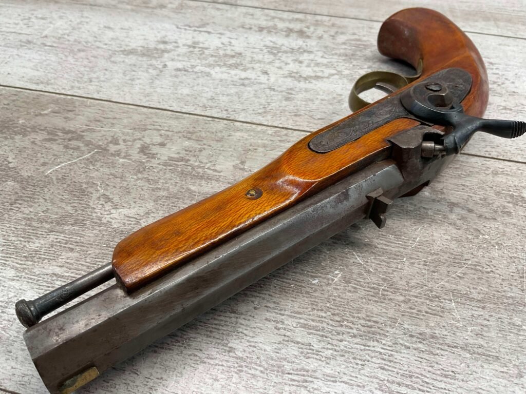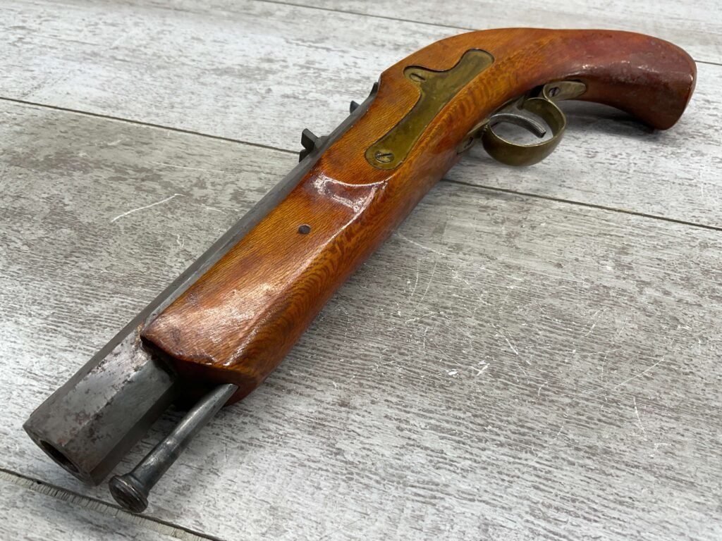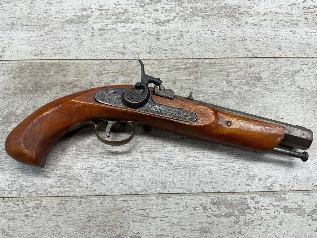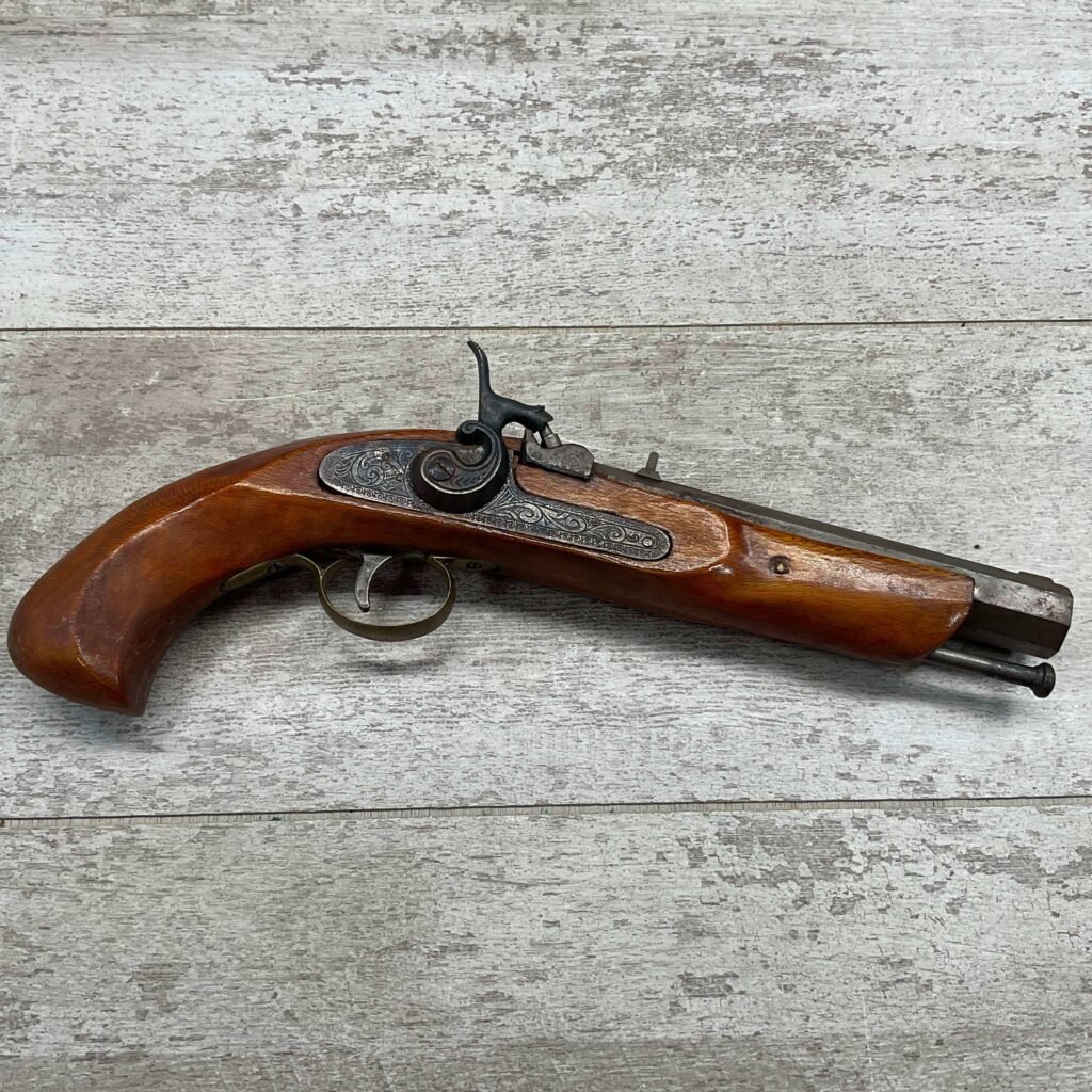 JUKAR .50 CAL BLACK POWDER PERCUSSION PISTOL #0034376, 7″ OCTAGON BARREL, RUSTY BORE & FAIR RIFLING, BIRDS HEAD GRIP WALNUT STOCK, BRASS TRIGGER GUARD, GOOD OVERALL, ANTIQUE-NO FFL TRANSFER REQUIRED
