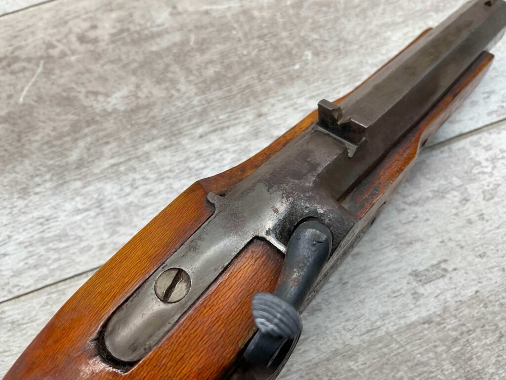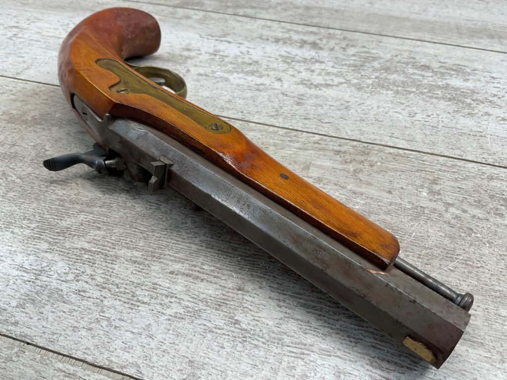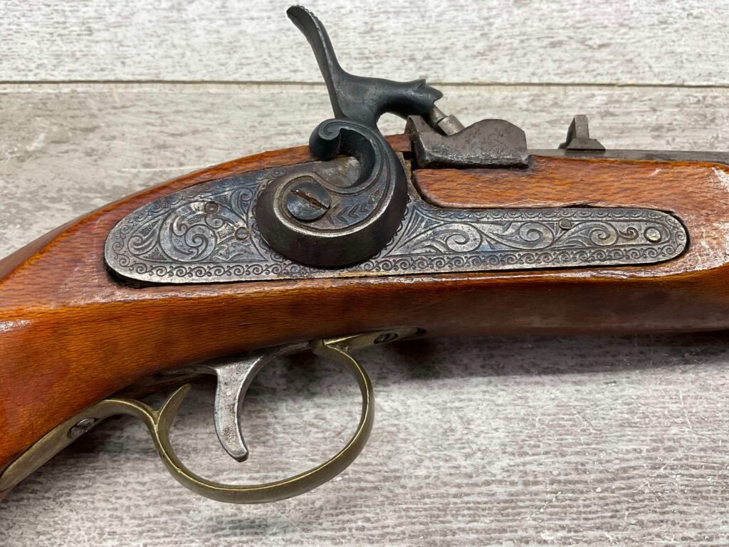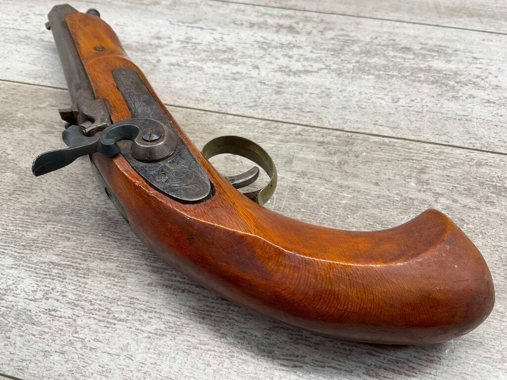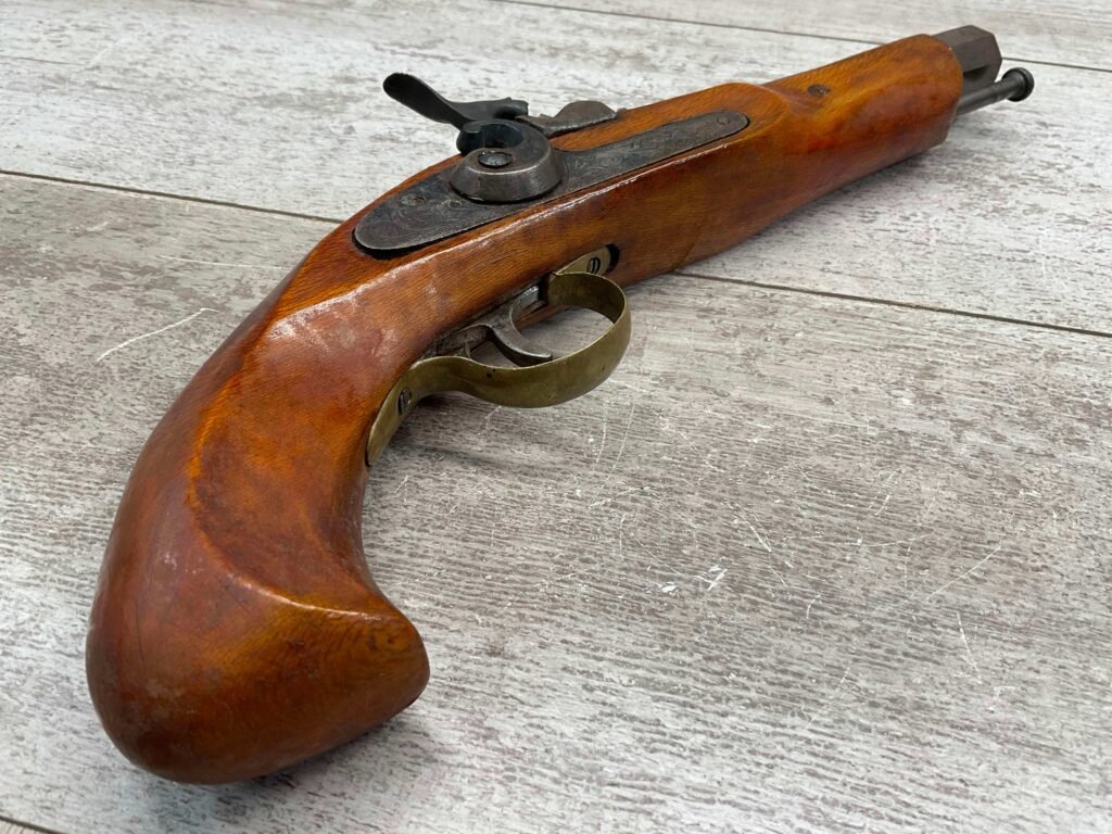 JUKAR .50 CAL BLACK POWDER PERCUSSION PISTOL #0034376, 7″ OCTAGON BARREL, RUSTY BORE & FAIR RIFLING, BIRDS HEAD GRIP WALNUT STOCK, BRASS TRIGGER GUARD, GOOD OVERALL, ANTIQUE-NO FFL TRANSFER REQUIRED