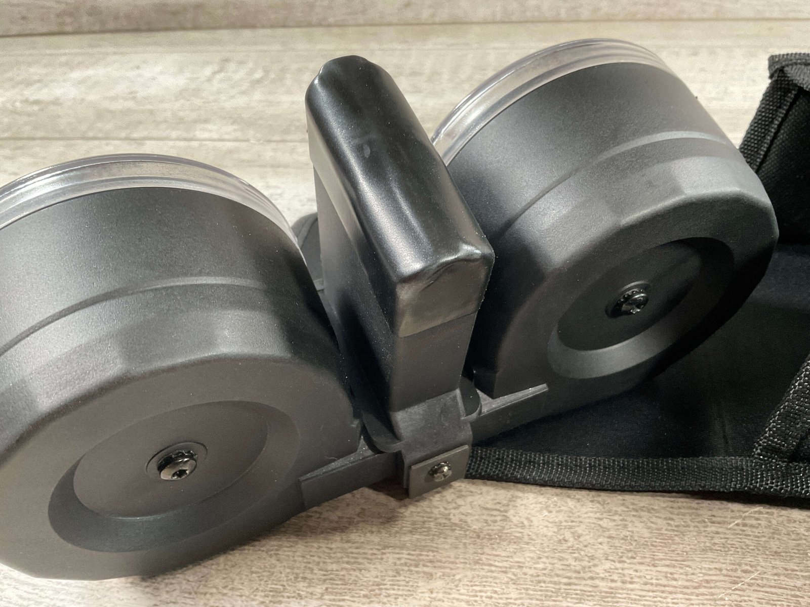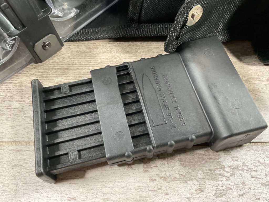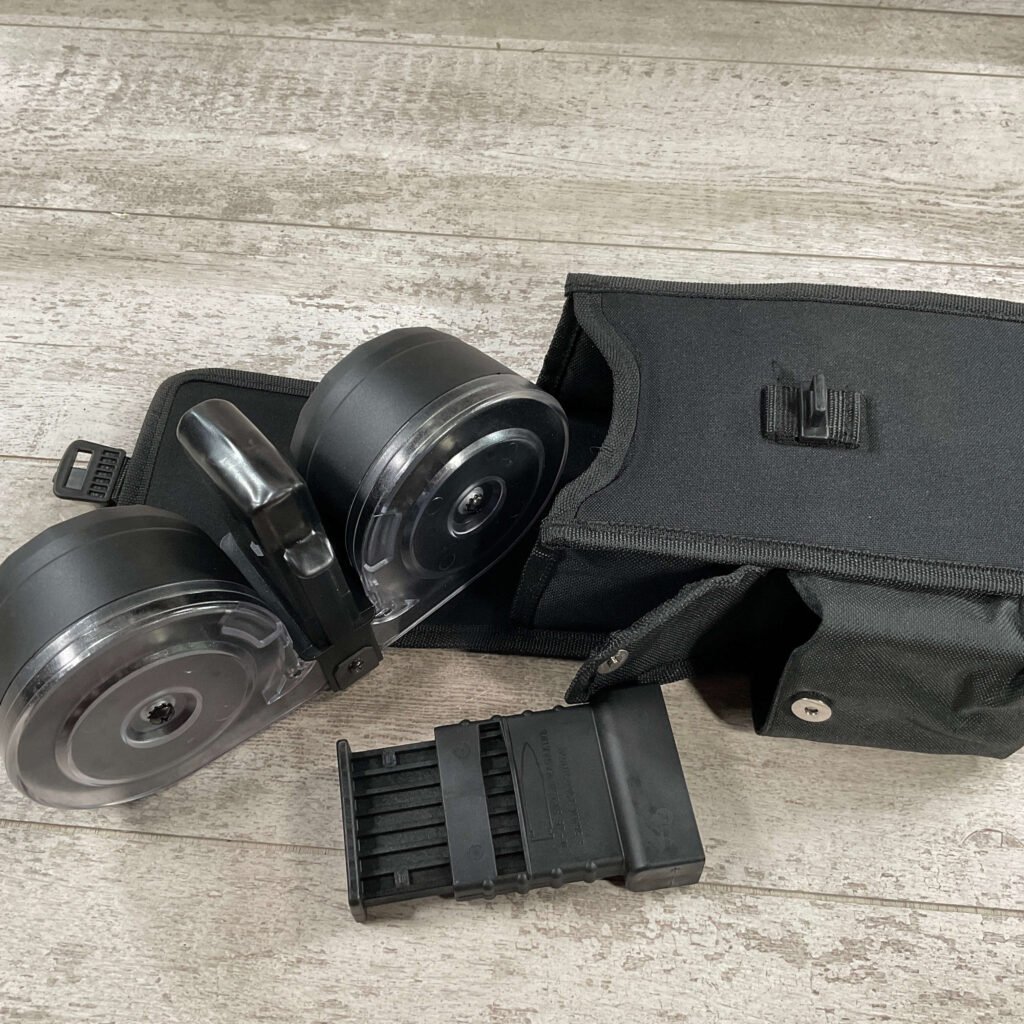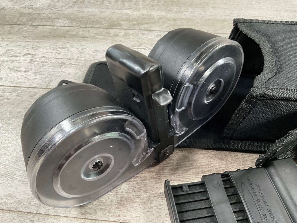 KCI AR15 .223/5.56 100ROUND DOUBLE DRUM MAGAZINE W/POUCH & LOADER, DRUM FEEDS ALTERNATELY FROM THE LEFT & RIGHT SIDES TO MAINTAIN BALANCE, INCLUDES MANUAL, DRUM, CARRYING POUCH, GRAPHITE LUBRICANT, AND LOADER.