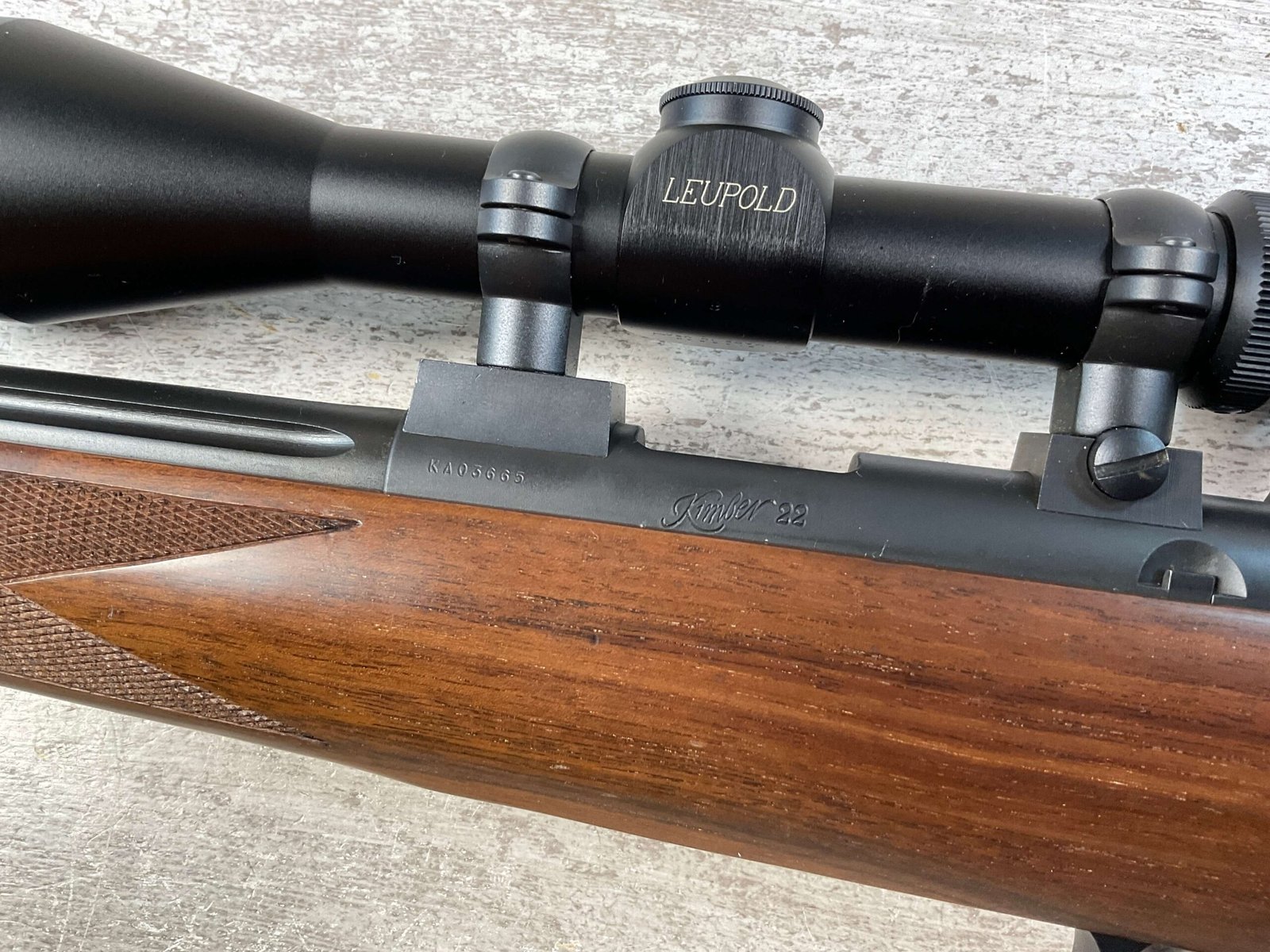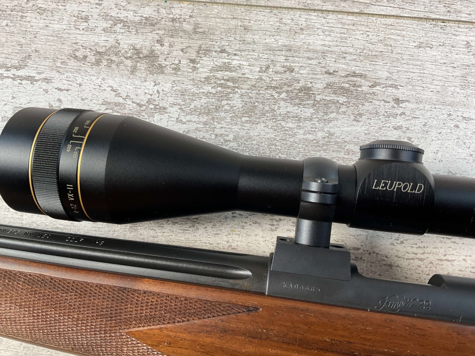 KIMBER (HUNTER SILHOUETTE) MODEL 22LR, MINTY #KA03665, 24″ HALF FLUTED MEDIUM SPORTER MATCH GRADE BARREL W/O SIGHTS, CHECKERED WALNUT HIGH COMB MONTE CARLO STOCK W/ URETHANE STOCK FINISH, ADJ TRIGGER, MATTE BLUE FINISH, SMOOTH ACTION, CRISP TRIGGER, LEUPOLD 4-12 VX-II MATTE BLACK OPTICS, MINTY BORE & RIFLING, BEAUTIFUL GUN!