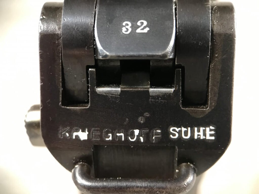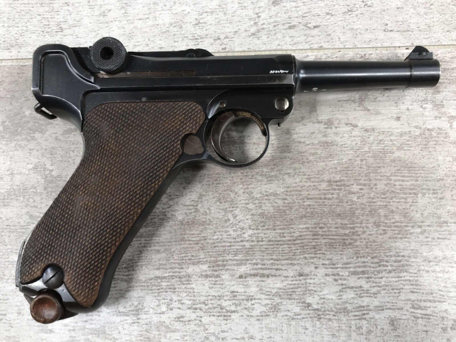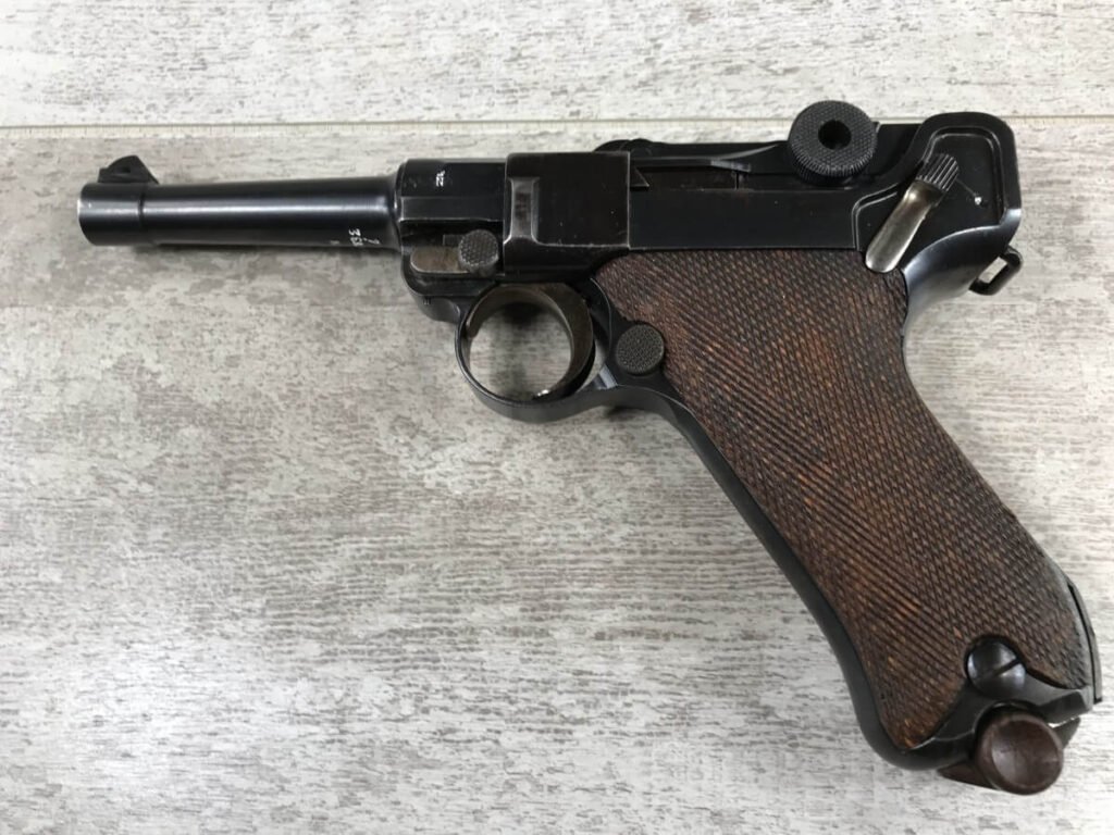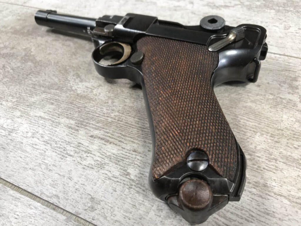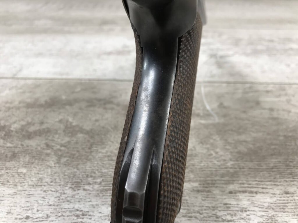 KRIEGHOFF COMMERCIAL DWM 1921 LUGER P08 #6732i, 3 3/4″ 30 CAL BBL, KRIEGHOFF SUHL REAR FRAME MARKED, VERY RARE, EXC BRIGHT BORE, EXC CHECKERED GRIPS, CORRECT UN-NUMBERED MAG, HIGH EDGE WEAR, 97-98%