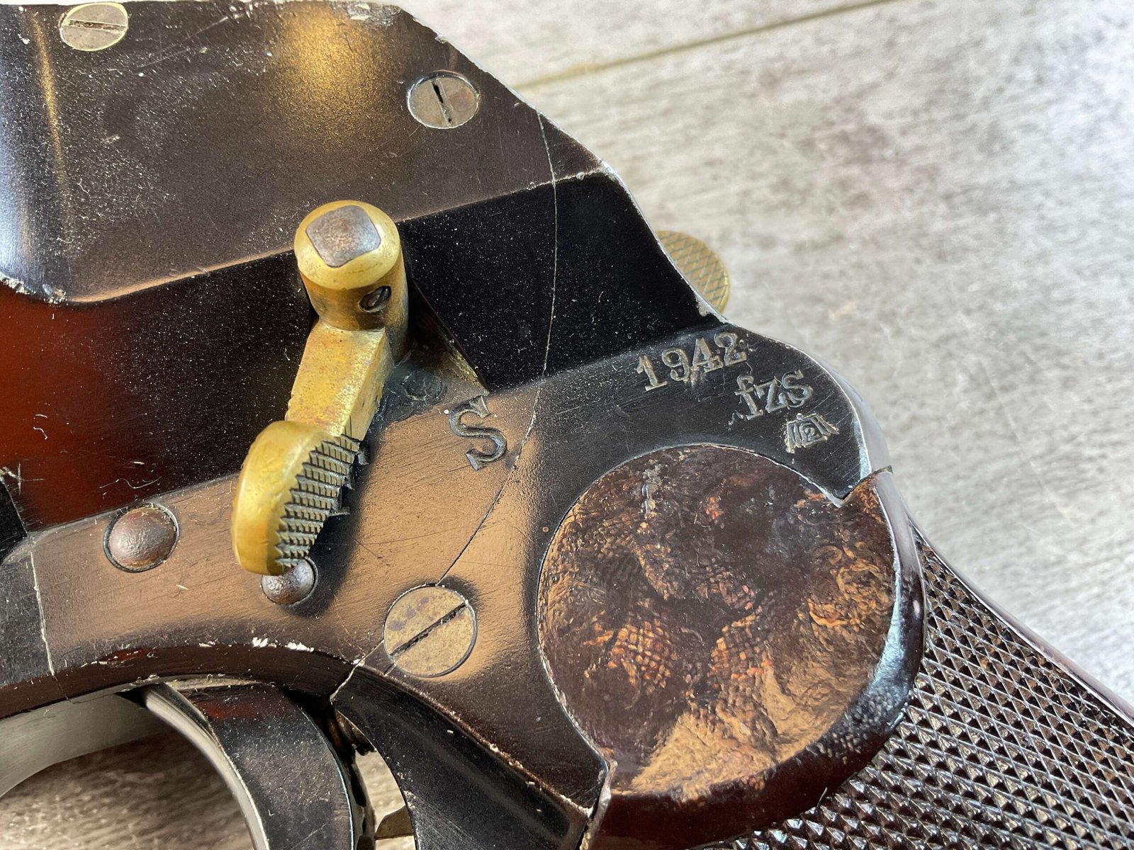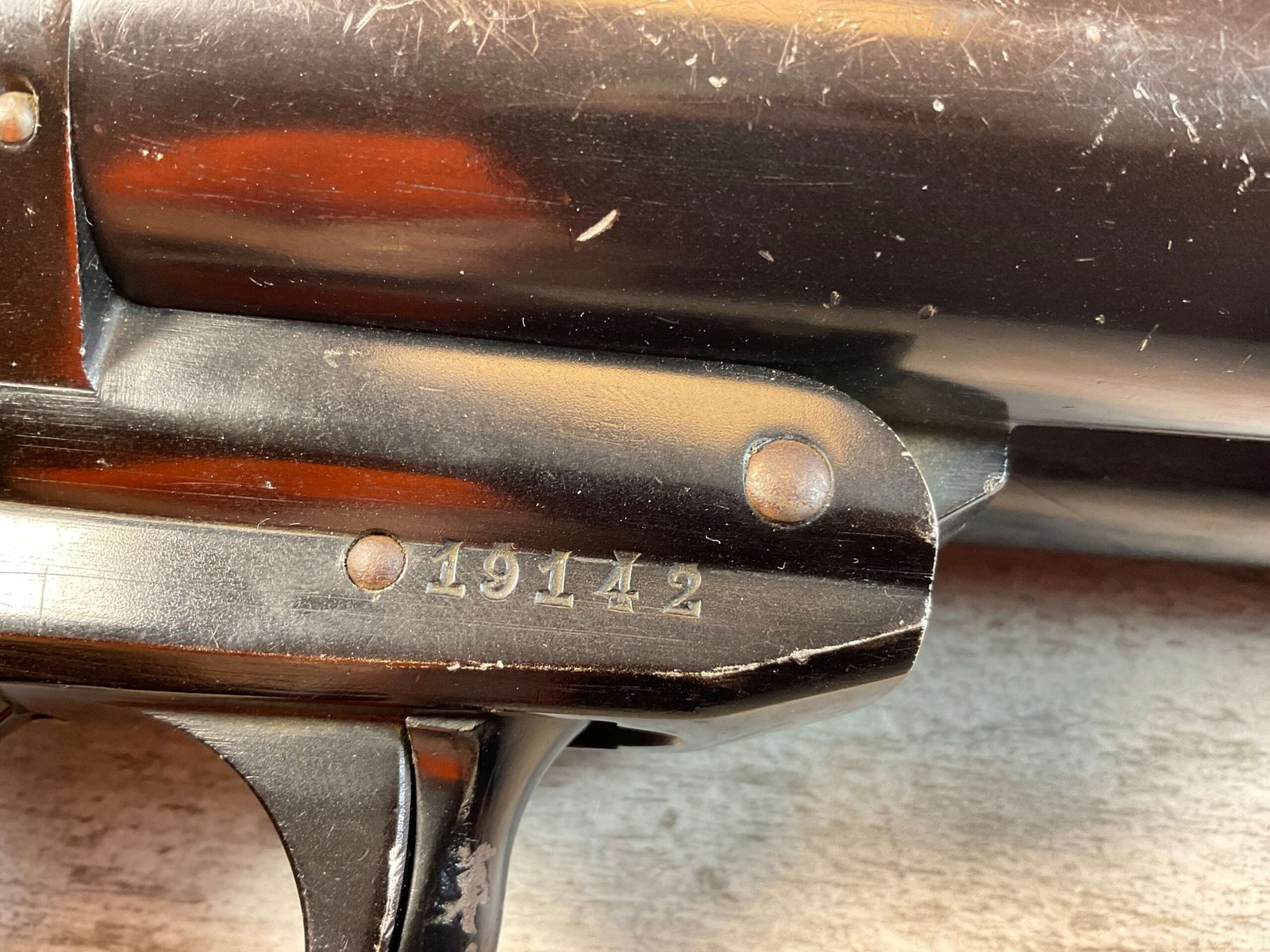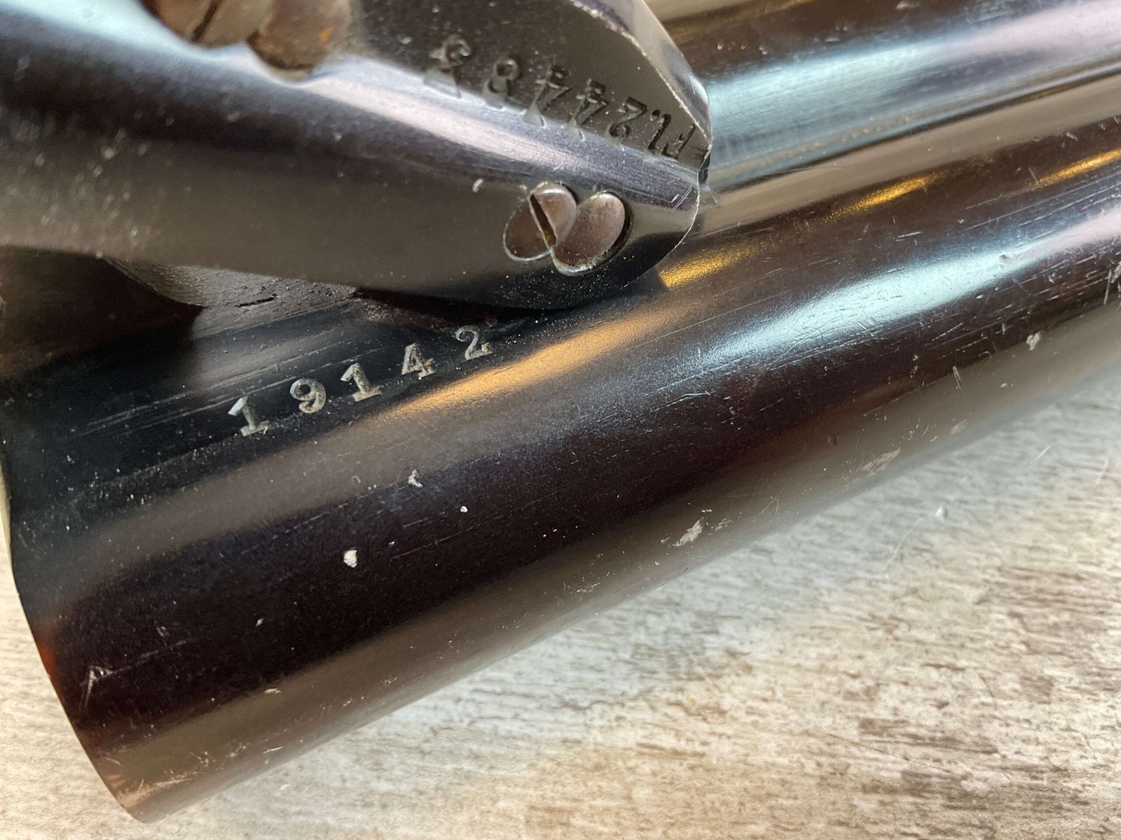 KRIEGHOFF LUFTWAFFE DOUBLE BARREL FLIEGER LEUCHTPISTOLE L. FLARE PISTOL #19142, 26.5MM, MARKED “FL. 24483” ON LEFT SIDE OF FRAME, EXC CHECKERED MOLTED REDDISH-BROWN BAKELITE GRIPS, MARKED “FZS 1942”, SELECTOR SWITCH CAN FIRE 2 FLARES, THE LEFT, THE RIGHT OR BOTH AT THE SAME TIME, BRASS SAFETY ON LEFT SIDE, FULLY FUNCTIONING BREAK OPEN BARREL W/LEVER UNDER THE TRIGGER GUARD, ORIGINAL WAR FINISH W/MINOR WEAR & FINISH LOSS, CONDITION AS SHOWN IN PICTURES, FROM THE JAMES EARL JONES “FAVORITES” COLLECTION W/ CERTIFICATE OF AUTHENTICITY.