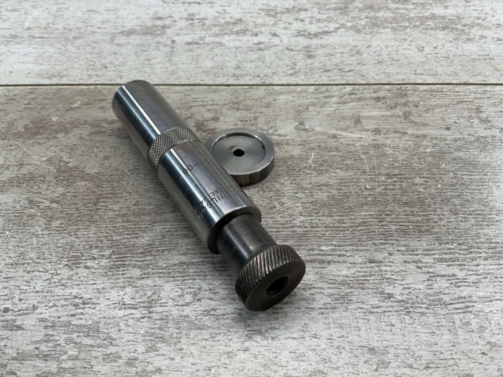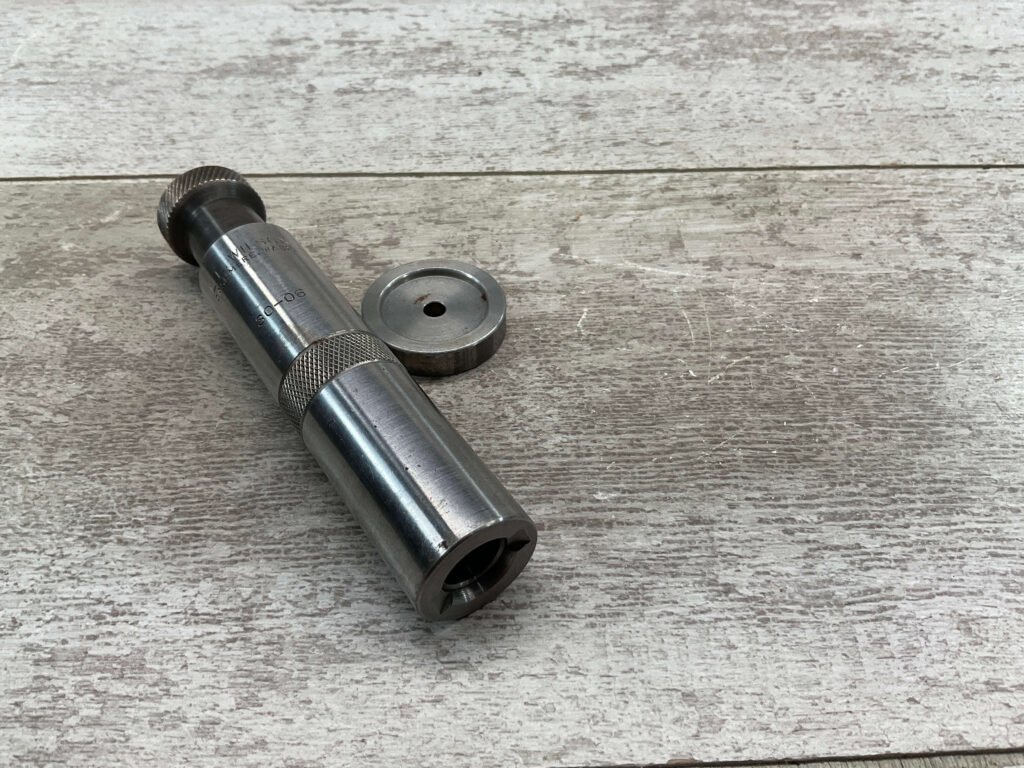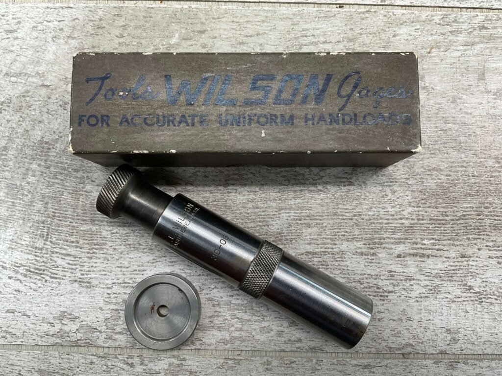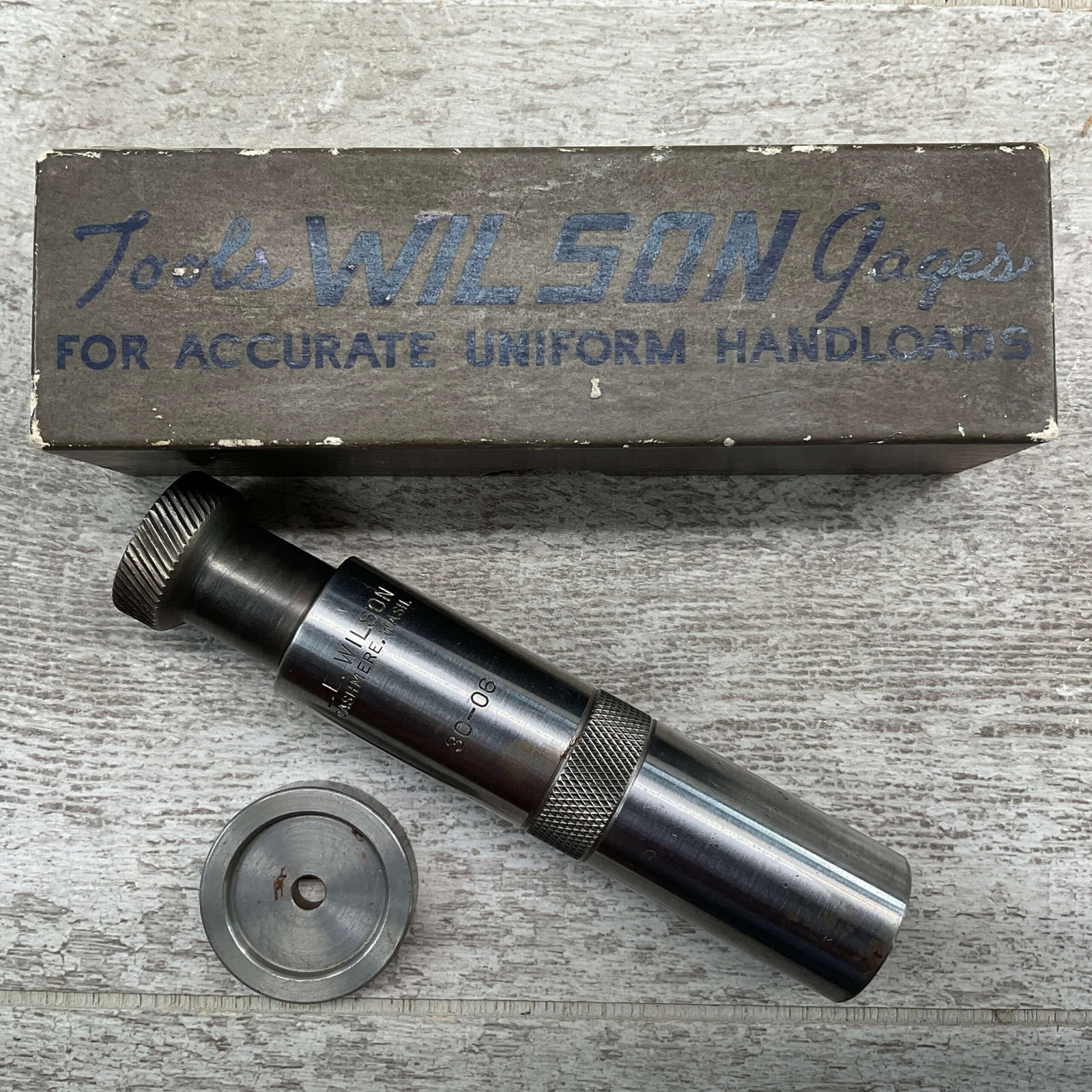 L.E. WILSON CHAMBER TYPE BULLET SEATER 30-06, TWO PEICE BOX, GREY WITH BLUE TEXT, VINTAGE W/ HIGH EDGE WEAR, BULLET SEATER IN EXC CONDITION