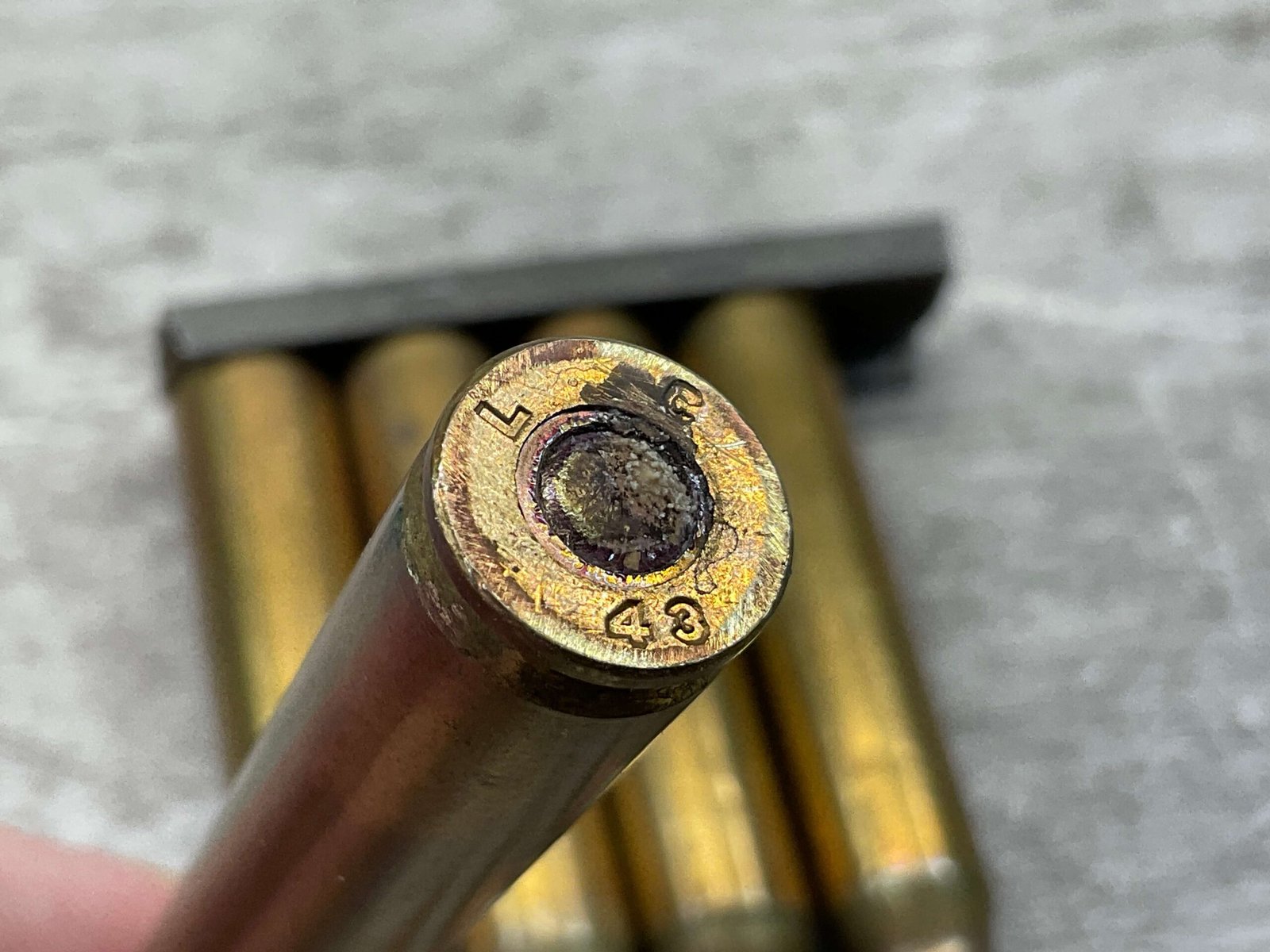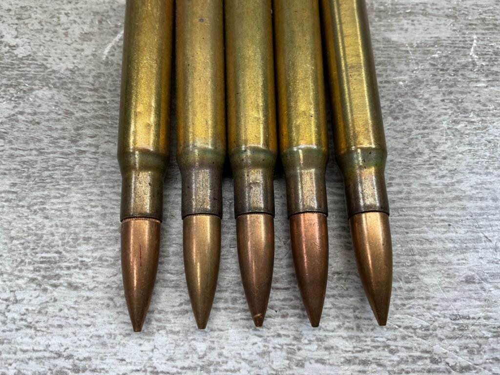 LAKE CITY AMMUNITION 1943 30-06 GOVERNMENT AMMO, QTY 5, VINTAGE, ON STRIPPER CLIP, HEADSTAMP “LC / 43”, WWII ERA.