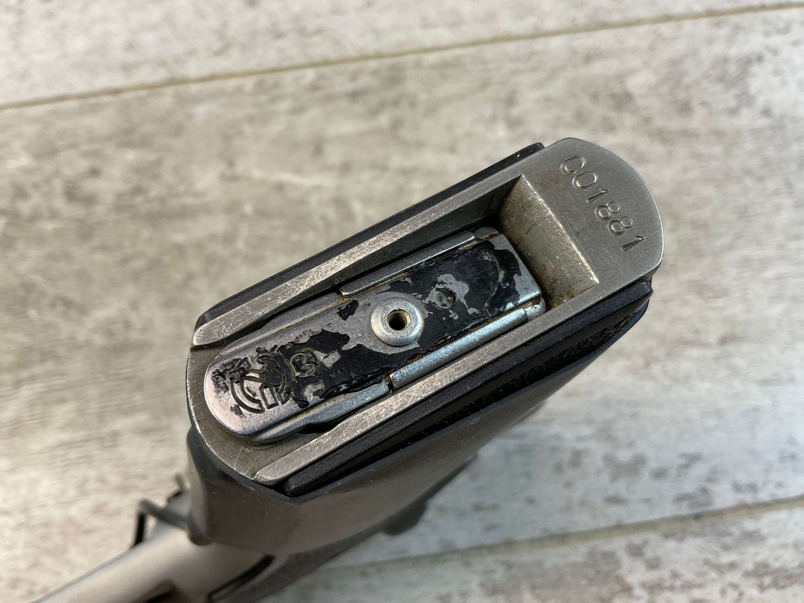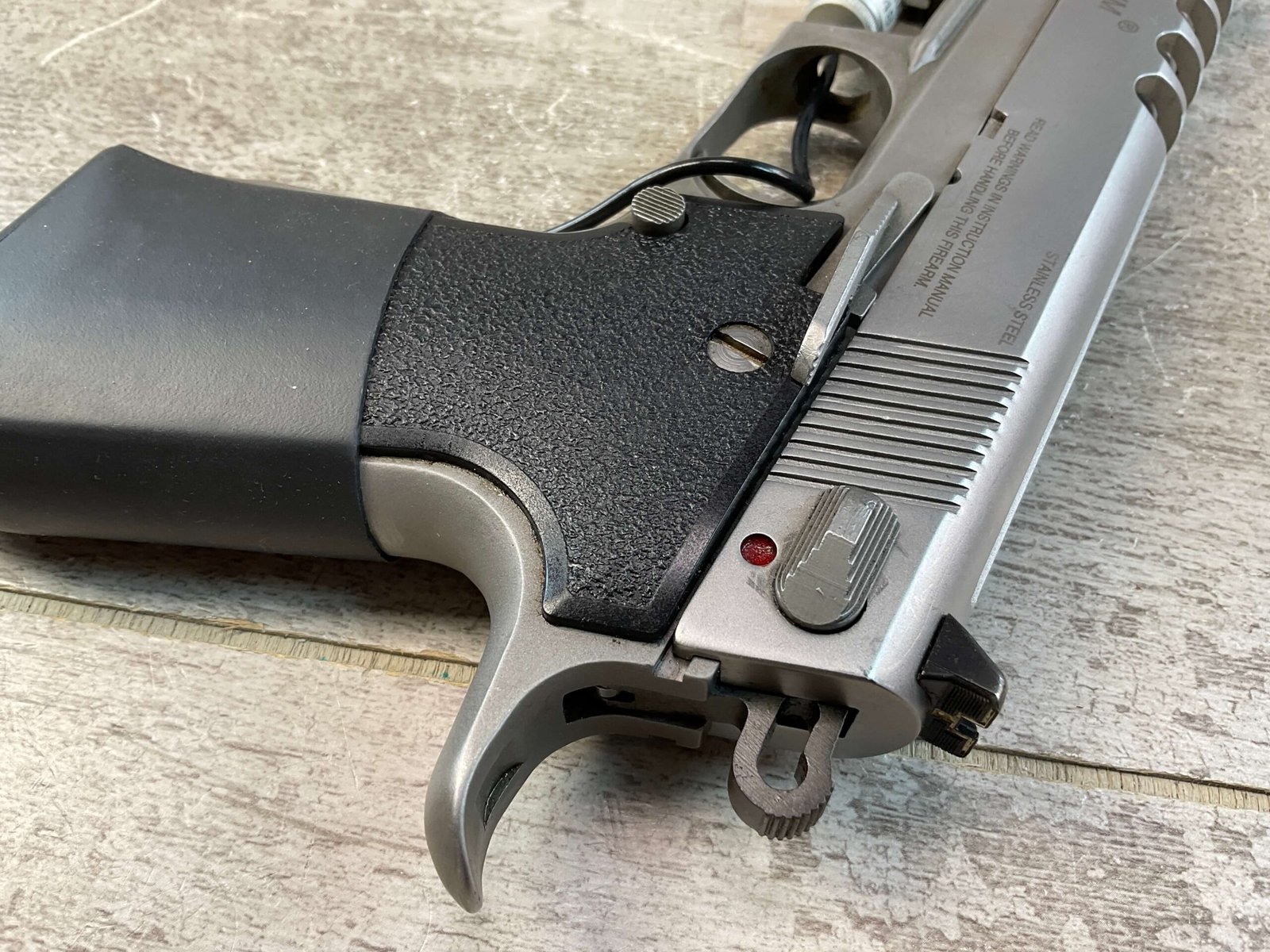 LASERAIM ARMS SERIES III .45 ACP SEMI AUTO STAINLESS PISTOL, JAMES EARL JONES COLLECTION #C01881, 6″ PORTED BARREL, EXC BORE & RIFLING, 95%+ ORIGINAL STAINLESS FINISH, VERY LIGHT WEAR FROM USE, EXC ORGINAL GRIPS, LASERAIM LASER ATTACHED W/ ACTIVATION ON GRIP, CONDITION AS SHOWN IN PICTURES, FROM THE JAMES EARL JONES “FAVORITES” COLLECTION W/ CERTIFICATE OF AUTHENTICITY.
