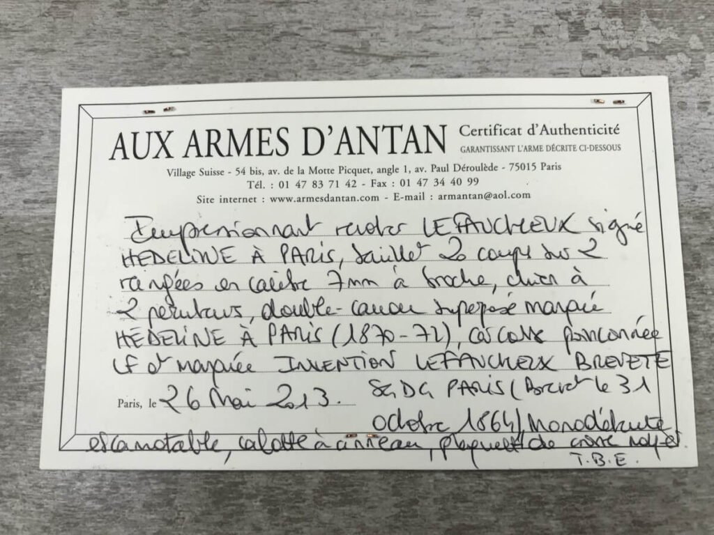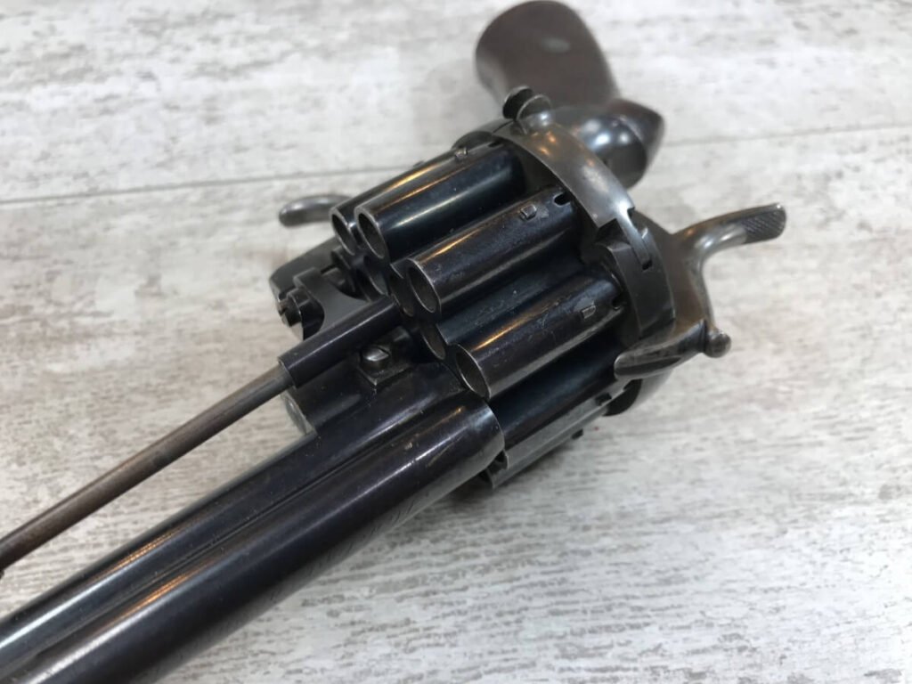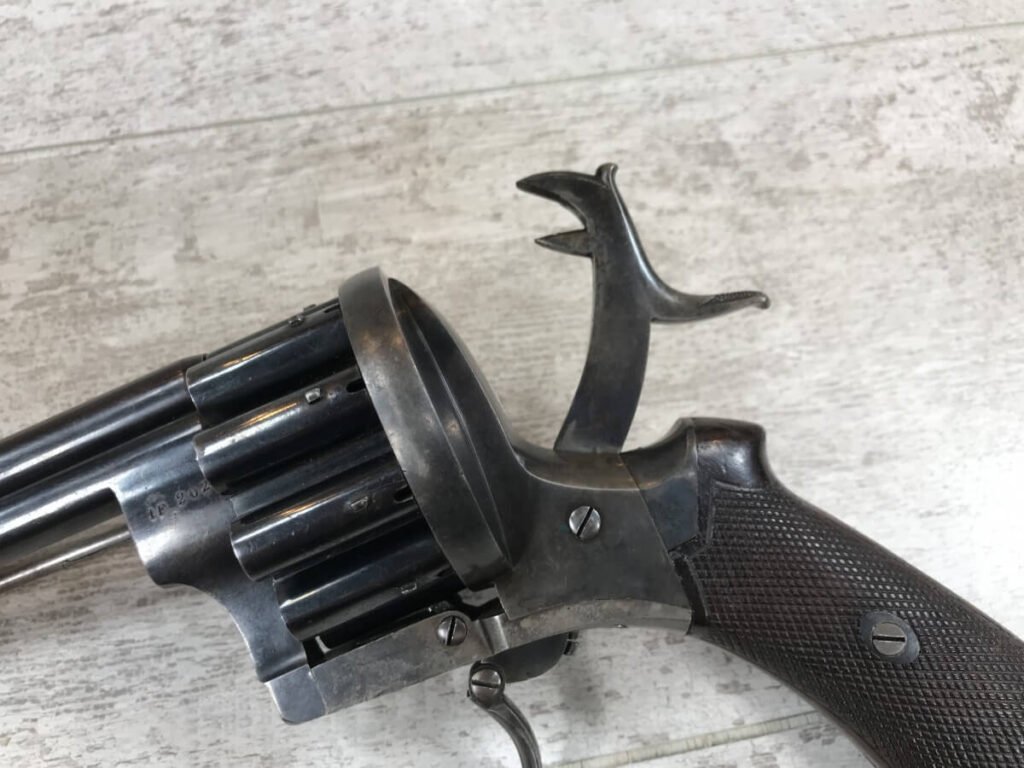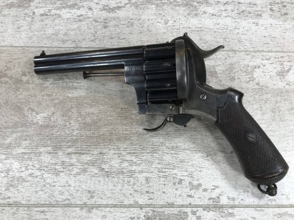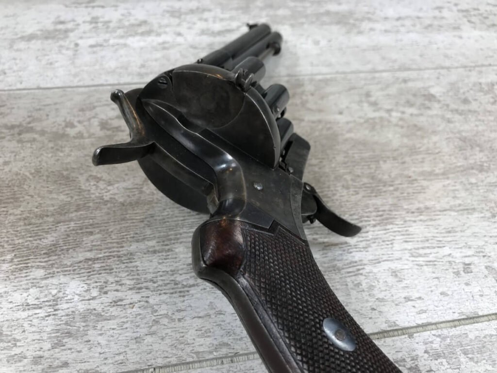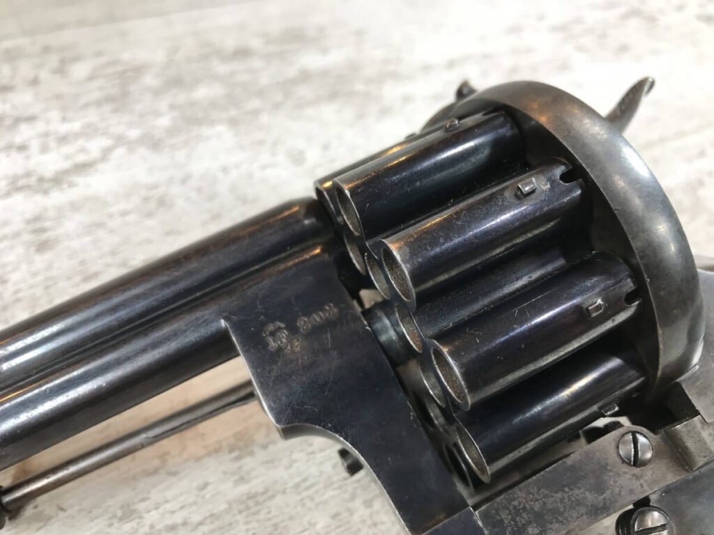 SKU#191 LE FAUCHEUX 20 SHOT PINFIRE DOUBLE BARREL REVOLVER #202, 4 7/8″ O/U BARREL, FOLDING TRIGGER DESIGN, DA ONLY DESIGN, HAMMER IN HALF-COCK ALOWS CYLINDER ROTATION TO FACILITATE LOADING AND UNLOADING, HINGED LOADING GATE ON RIGHT SIDE WITH EJECTOR THAT ROTATES AS WELL, HUMPBACK GRIP DESIGN, LIGHTLY CHECKERED GRIPS IN EXCELLENT CONDITON WITH LANYARD RING, LEFT SIDE MARKED “CROWN/LF/202″, 9 3/4″ OVERALL LENGTH, 2 1/4” WIDE, VERY GOOD BLUE ON BARRELS AND CYLINDER, FRAME HAS MOTTLED GRAY PATINA, EXCELLENT OVERALL, MECHANICALLY EXCELLENT, SEEMS TO INDEX SMOOTHLY AND PERFECT, EVERY TRIGGER PULL ALTERNATES BETWEEN TOP BARREL AND THE BOTTOM BARREL, EXTREMELY RARE & UNUSUAL 19TH CENTURY HIGH CAPACITY REVOLVER!! AUX ARMES D’ANTAN CERTIFICATE OF AUTHENTICITY INCLUDED