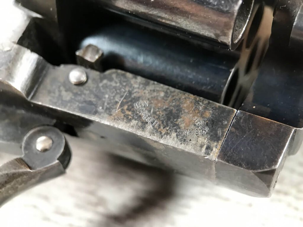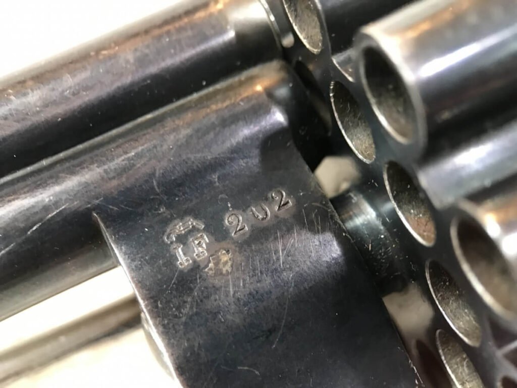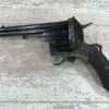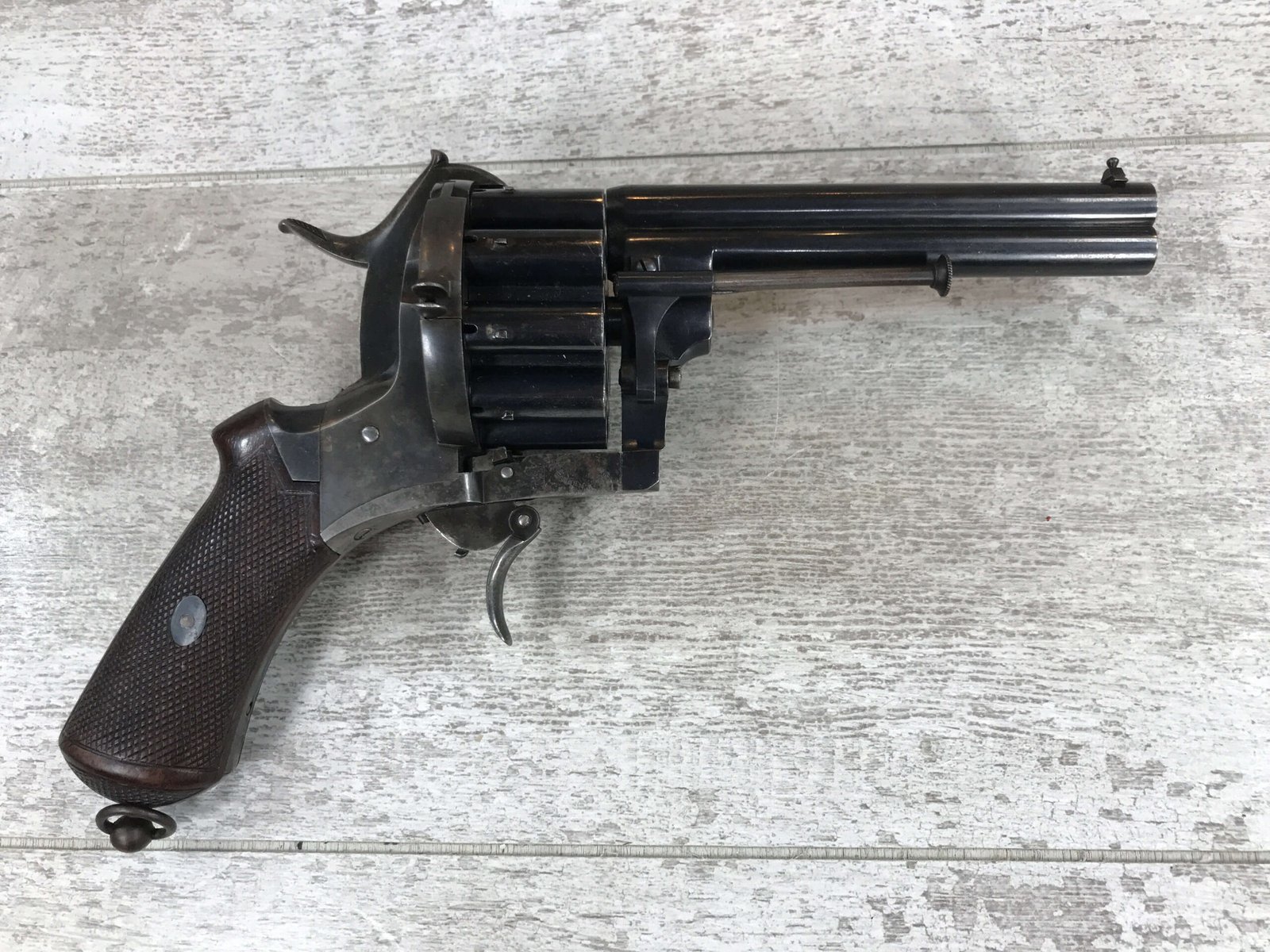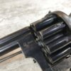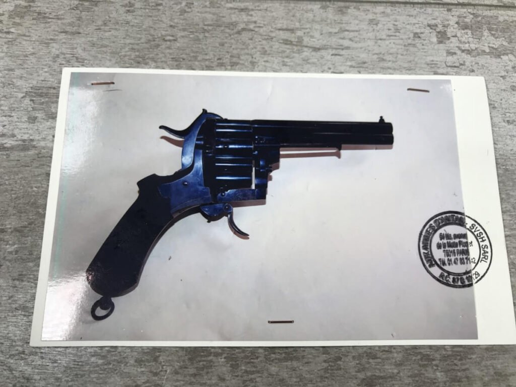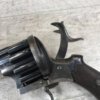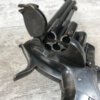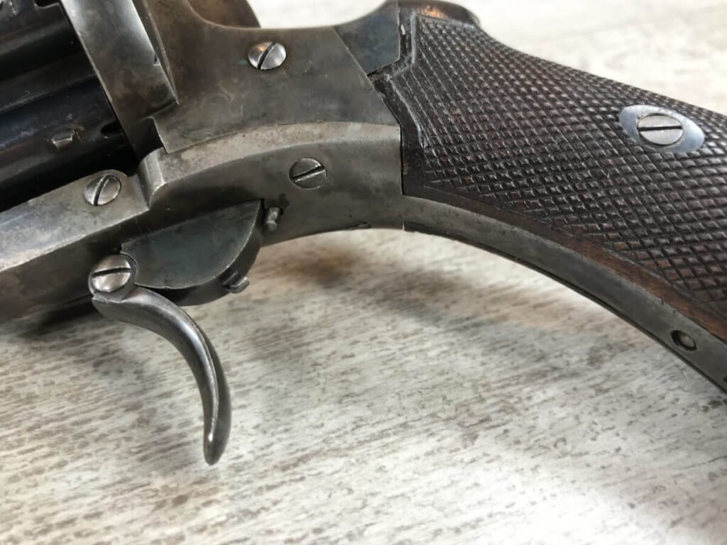 SKU#191 LE FAUCHEUX 20 SHOT PINFIRE DOUBLE BARREL REVOLVER #202, 4 7/8″ O/U BARREL, FOLDING TRIGGER DESIGN, DA ONLY DESIGN, HAMMER IN HALF-COCK ALOWS CYLINDER ROTATION TO FACILITATE LOADING AND UNLOADING, HINGED LOADING GATE ON RIGHT SIDE WITH EJECTOR THAT ROTATES AS WELL, HUMPBACK GRIP DESIGN, LIGHTLY CHECKERED GRIPS IN EXCELLENT CONDITON WITH LANYARD RING, LEFT SIDE MARKED “CROWN/LF/202″, 9 3/4″ OVERALL LENGTH, 2 1/4” WIDE, VERY GOOD BLUE ON BARRELS AND CYLINDER, FRAME HAS MOTTLED GRAY PATINA, EXCELLENT OVERALL, MECHANICALLY EXCELLENT, SEEMS TO INDEX SMOOTHLY AND PERFECT, EVERY TRIGGER PULL ALTERNATES BETWEEN TOP BARREL AND THE BOTTOM BARREL, EXTREMELY RARE & UNUSUAL 19TH CENTURY HIGH CAPACITY REVOLVER!! AUX ARMES D’ANTAN CERTIFICATE OF AUTHENTICITY INCLUDED
