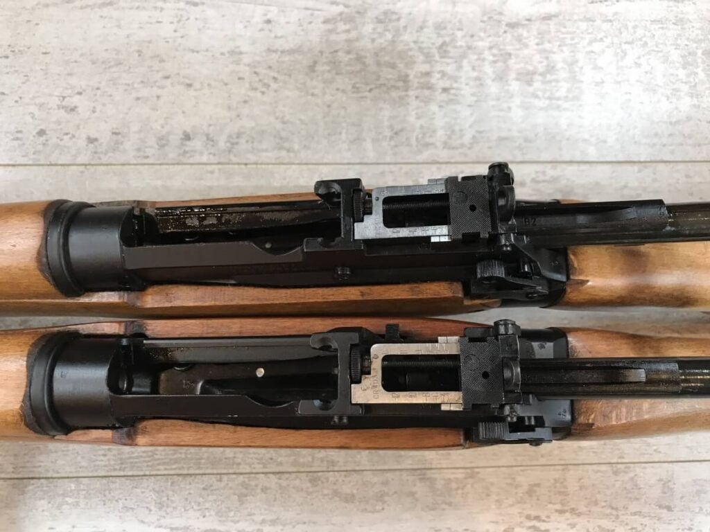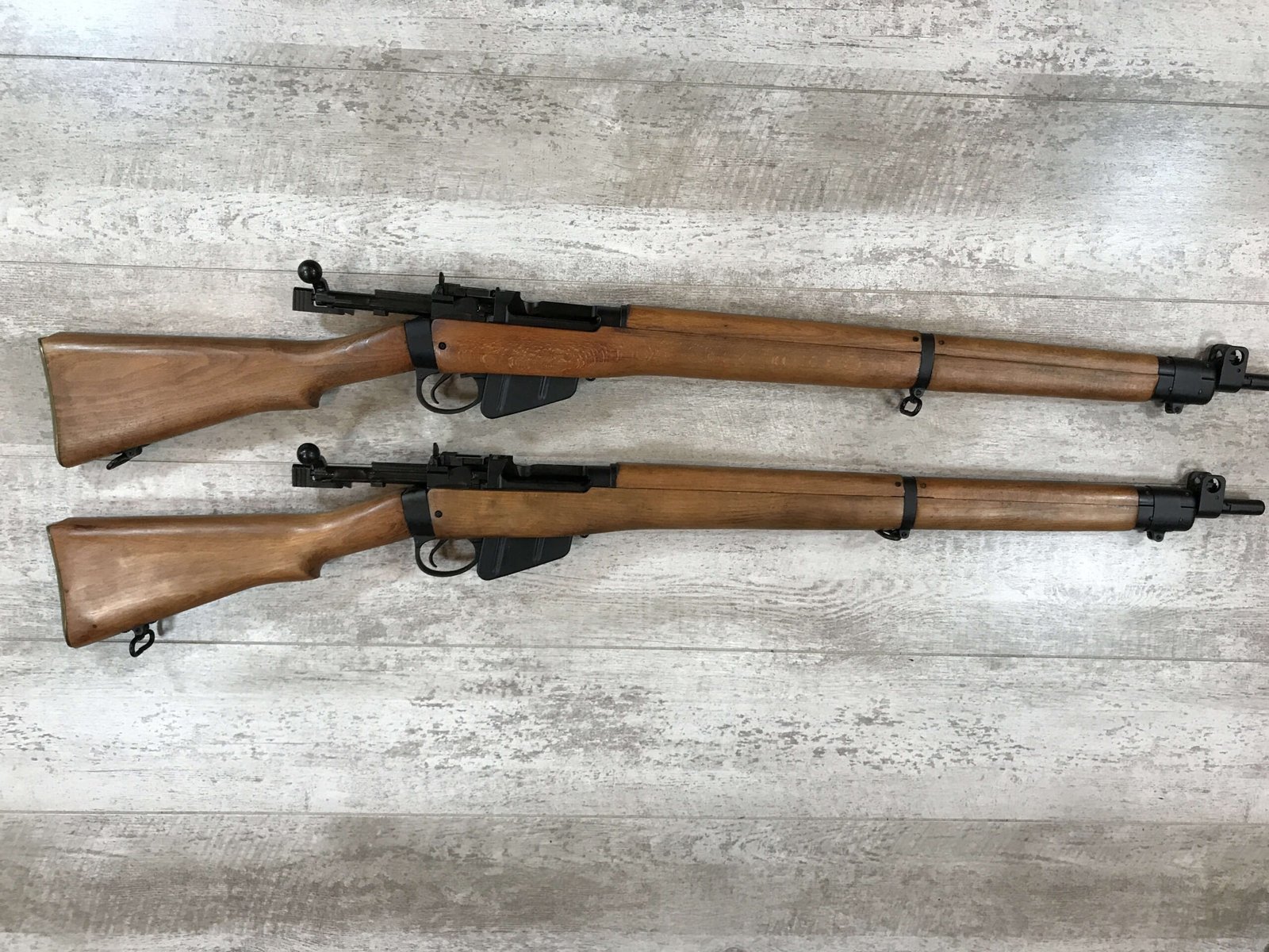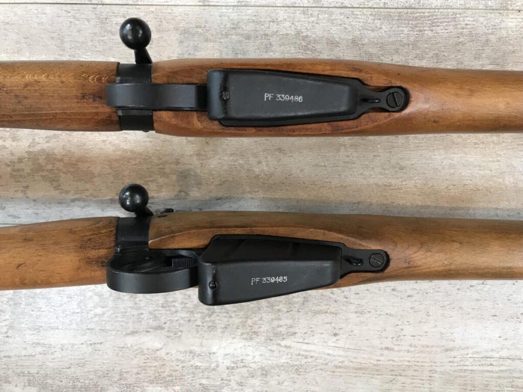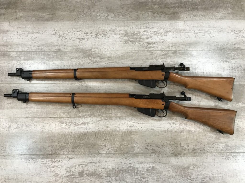 LEE ENFIELD NO4 MK2 (F) RIFLE PAIR #PF 339486 & PF 339485, UNISSUED, UNFIRED, SEQUENTIAL SERIAL NUMBERS!! VERY RARE, MUSEUM QUALITY, DOUBTFUL THAT ANOTHER SET IN THIS CONDITION EXISTS, 1/55 MFR, SOME LIGHT HANDLING MARKS, 10/10 BRIGHT BORES, 10/10 STOCK & STEEL, 99+% OVERALL