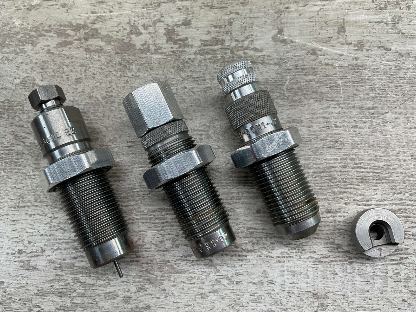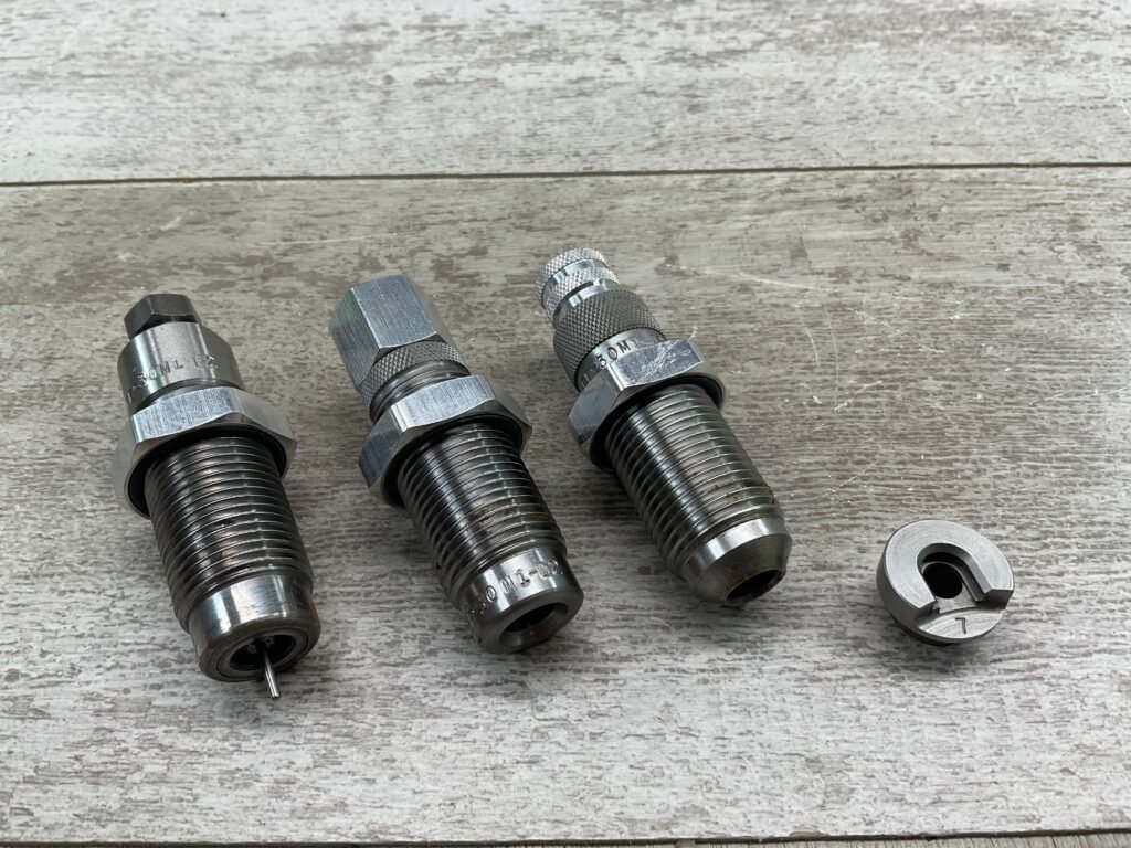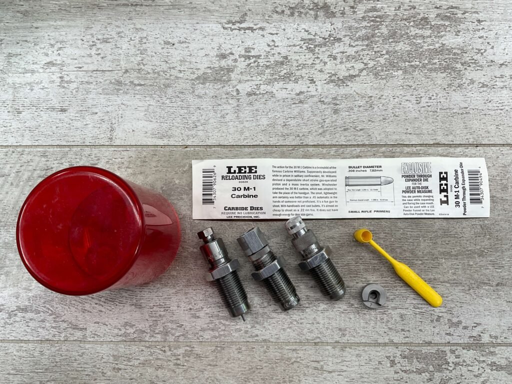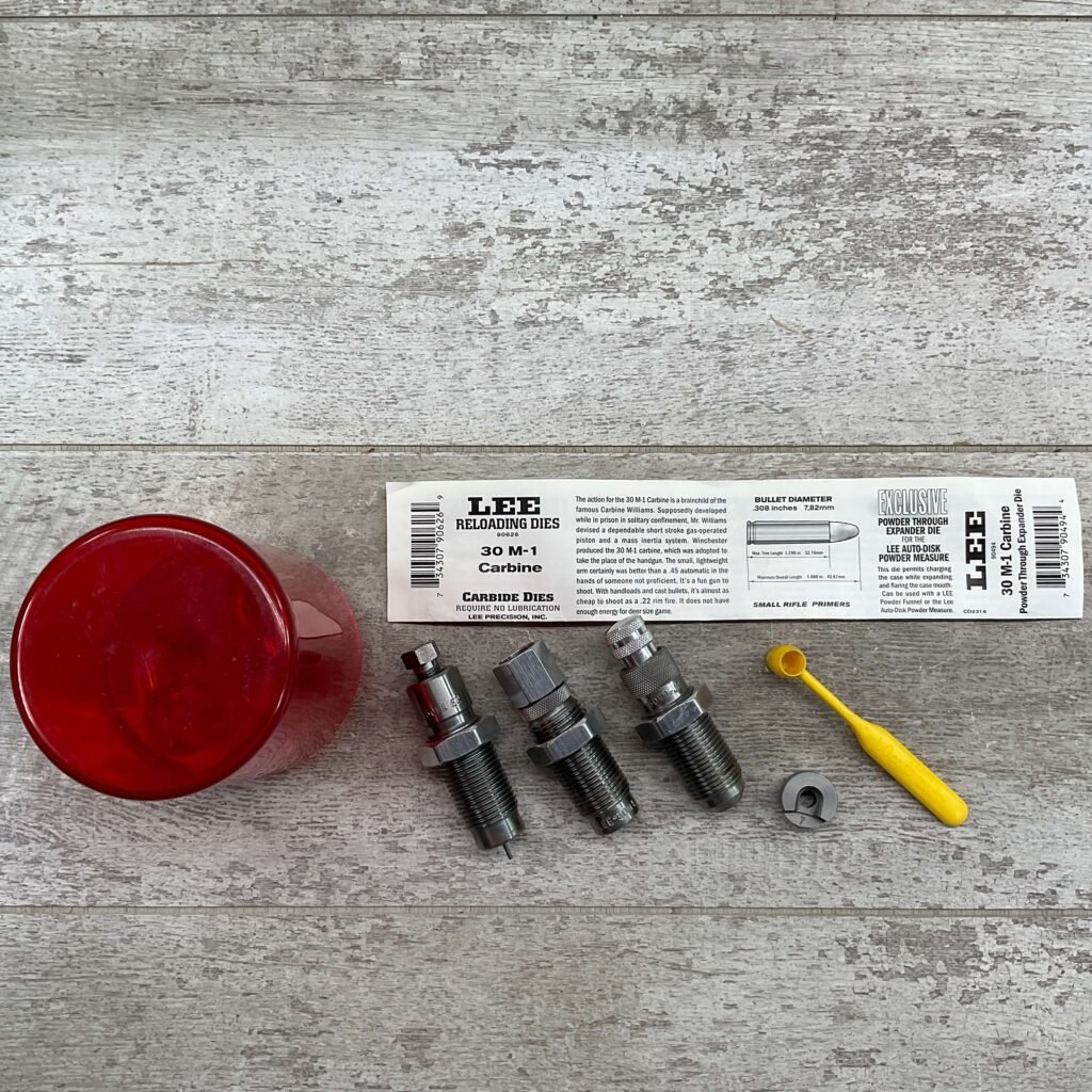 LEE RELOADING 3 DIE SET, 30 M-1 CARBINE, INCLUDES DIPPER, SHELL HOLDER #7, CARBIDE DIES, INSTRUCTIONS AND RED PLASTIC STORAGE ALL IN VG USED CONDITION