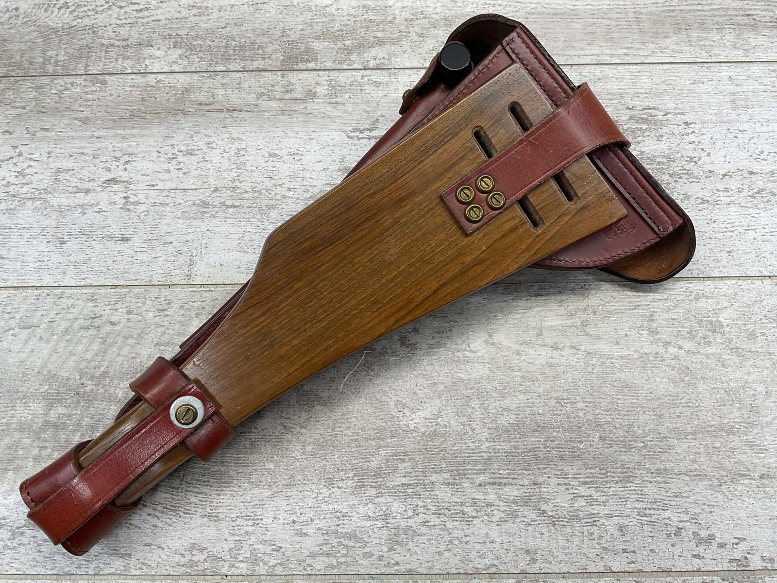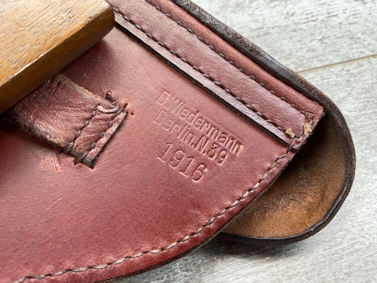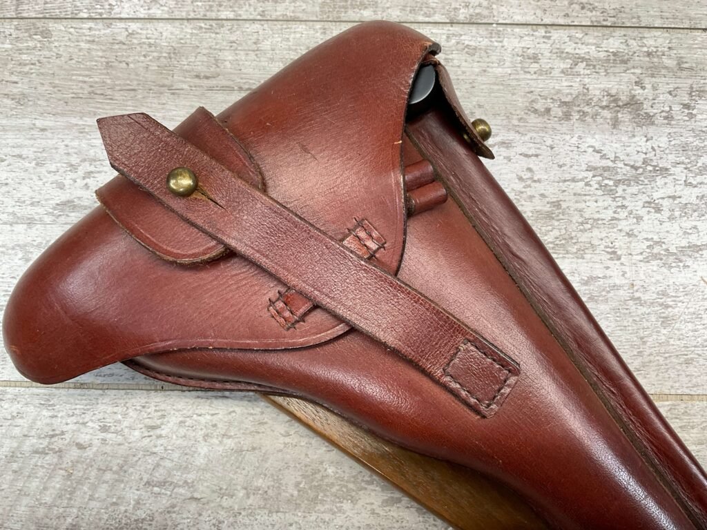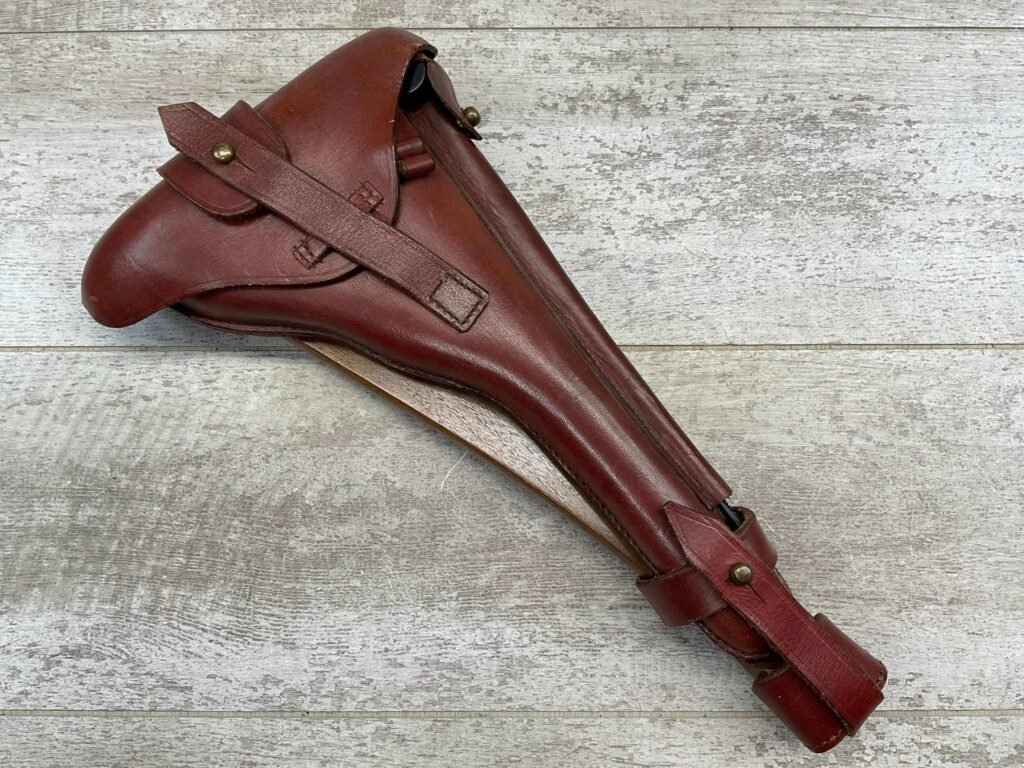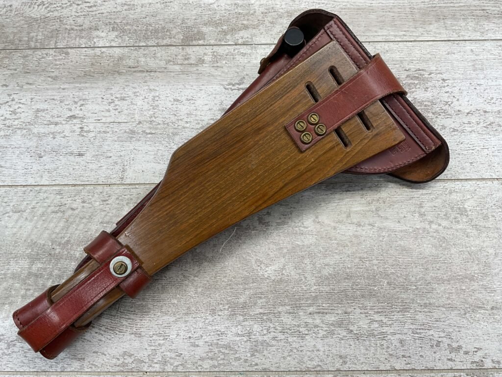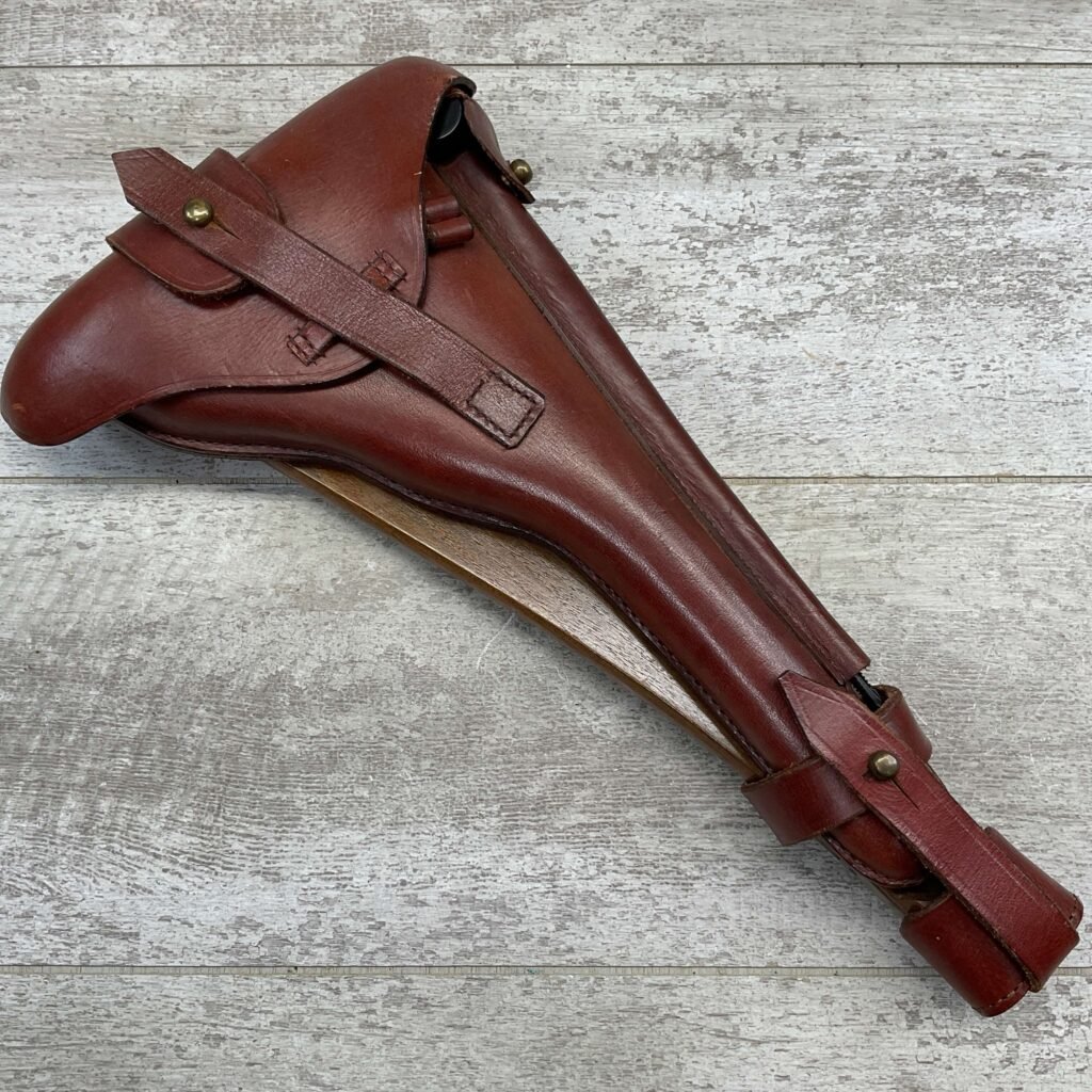 LUGER ARTILLERY REPRO HOLSTER W/ BOARD & CLEANING ROD, HIGH QUALITY, HOLSTER AND BOARD ARE IN EXCELLENT CONDITION AND LOOK LIKE NEW WITH FEW (IF ANY) SIGNS OF WEAR, BACK OF HOLSTER MARKED “B.WIEDERMANN / BERLIN.N.39 / 1916”, GREAT FIND!