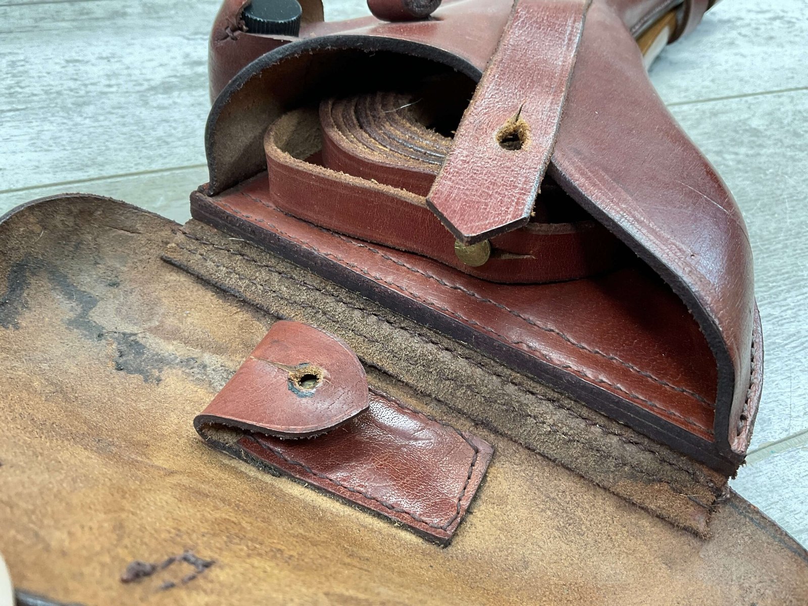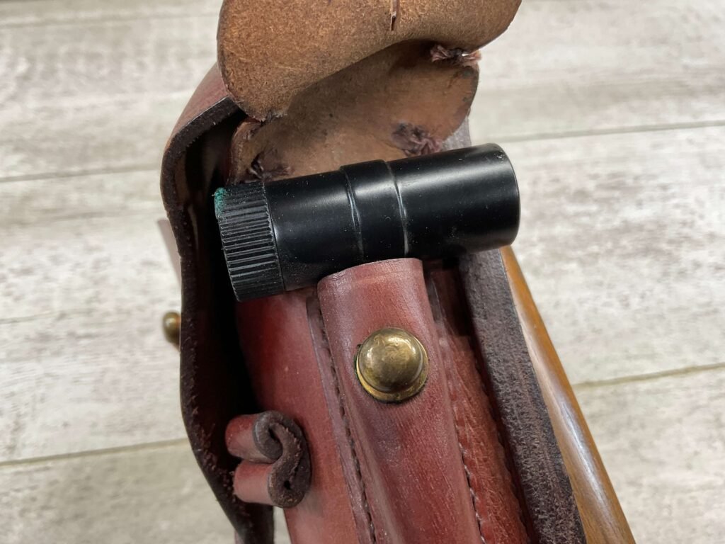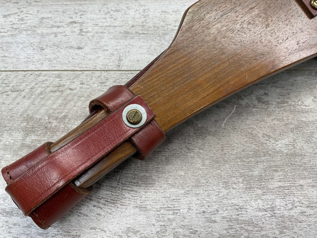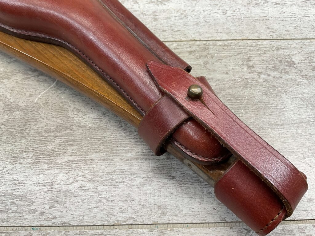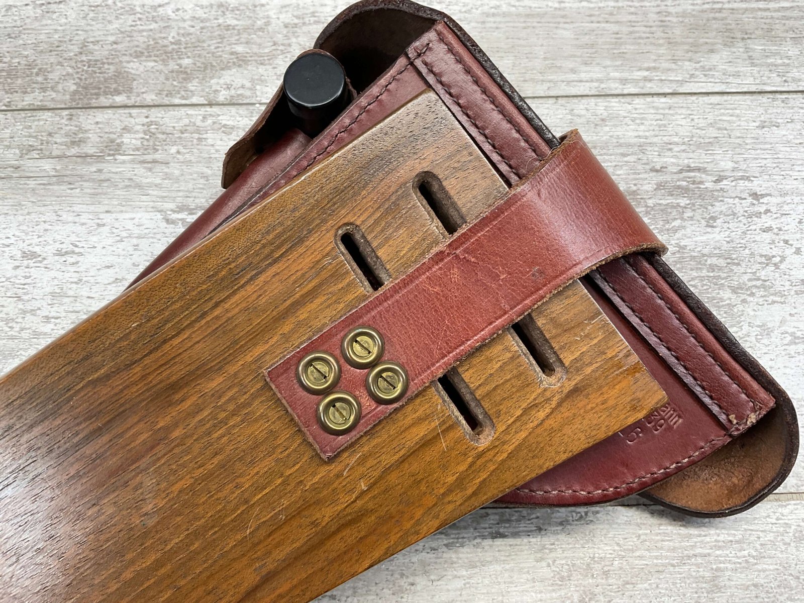 LUGER ARTILLERY REPRO HOLSTER W/ BOARD & CLEANING ROD, HIGH QUALITY, HOLSTER AND BOARD ARE IN EXCELLENT CONDITION AND LOOK LIKE NEW WITH FEW (IF ANY) SIGNS OF WEAR, BACK OF HOLSTER MARKED “B.WIEDERMANN / BERLIN.N.39 / 1916”, GREAT FIND!
