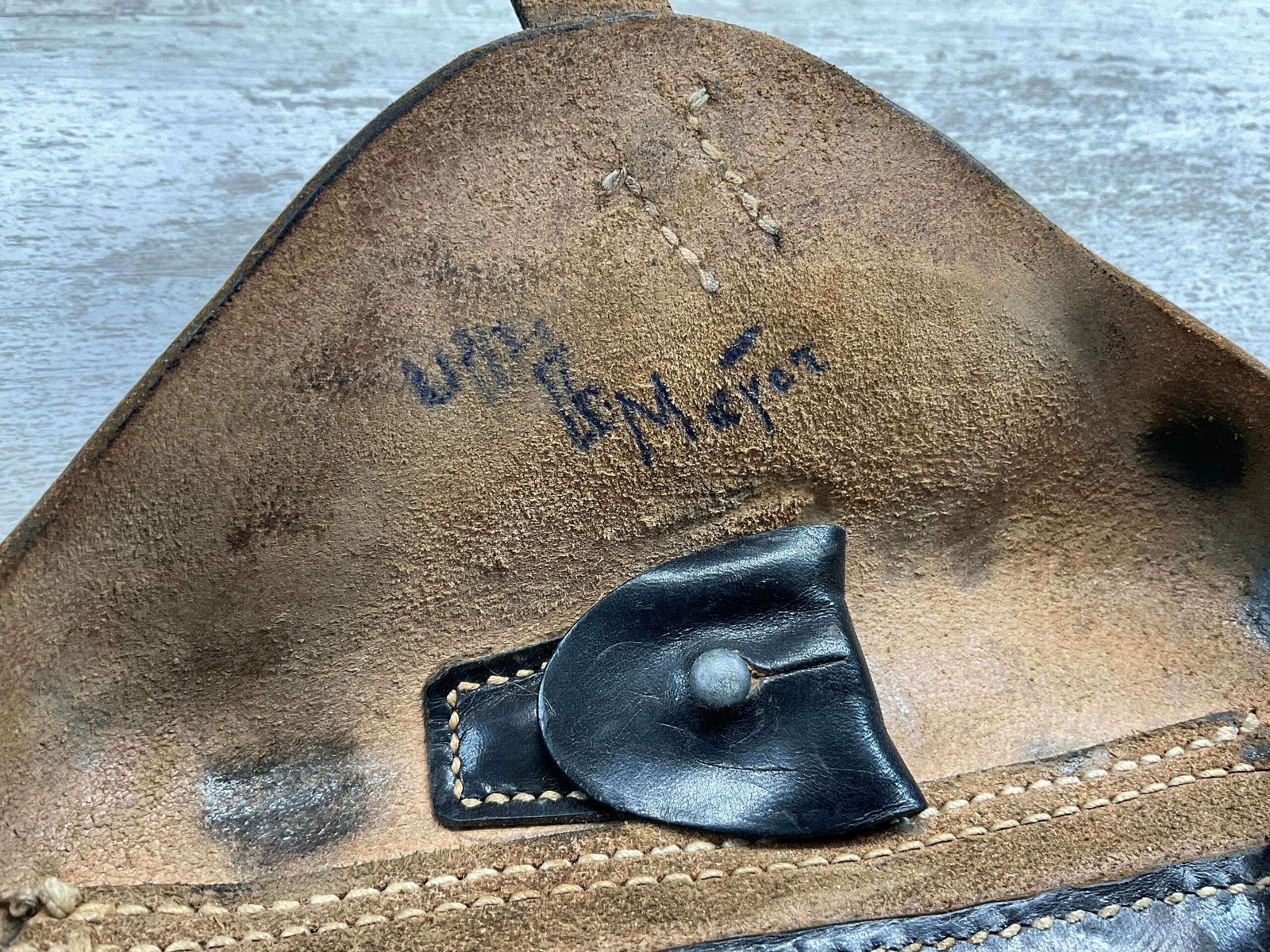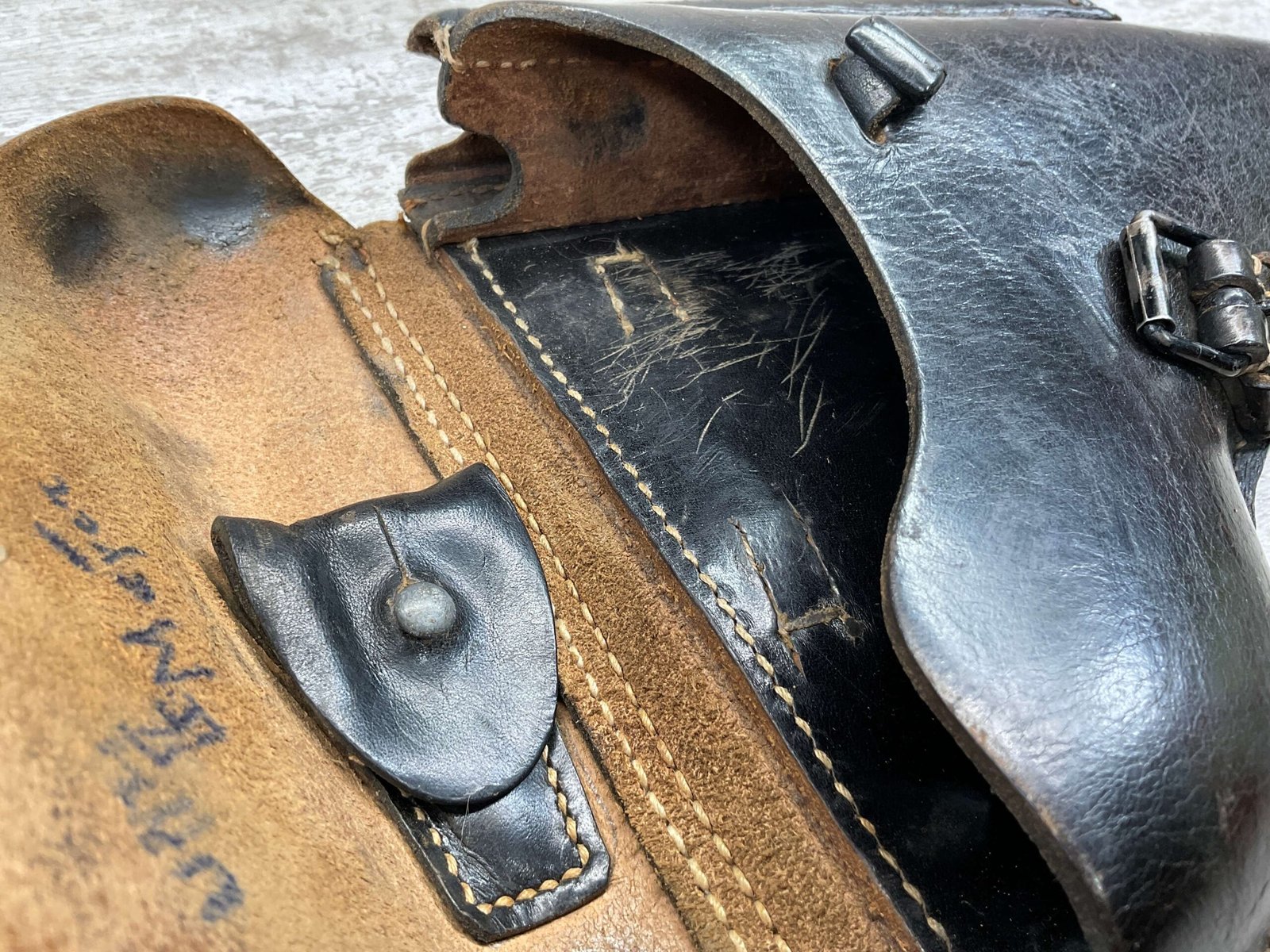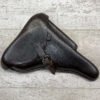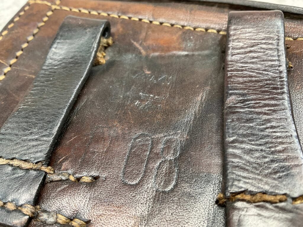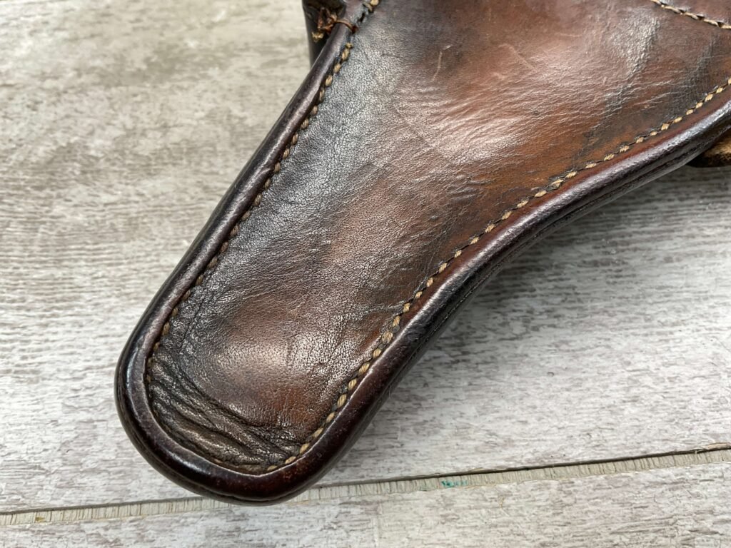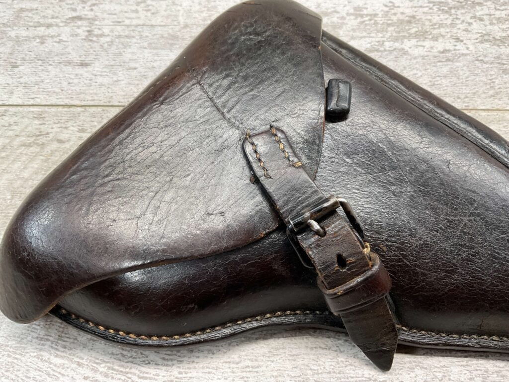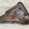 LUGER P08 BROWN HARDSHELL LEATHER HOLSTER, NAZI MARKED, BACK OF HOLSTER MARKED “dtu.41” WITH “WaA163” AND “08”, INSIDE IS MARKED “MEYER”?, EXCELLENT TOOL POUCH, LIFTING STRAP INTACT AND FUNCTIONS VERY WELL, OVERALL IN EXCELLENT CONDITION.