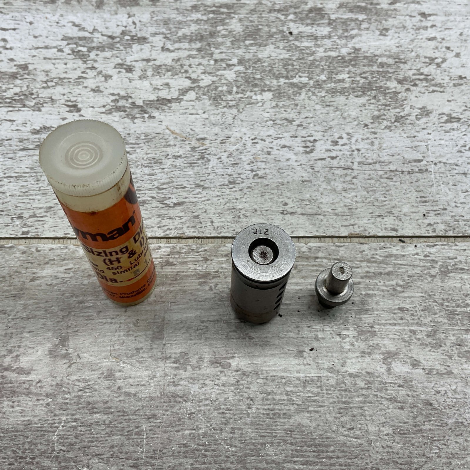 The Lyman H&I (Hollow-Point and Interchangeable) sizing die for the 450 lubricator with a .812 diameter is designed to size cast bullets to a diameter of .812 inches. This die is typically used in conjunction with the Lyman 450 Lubricator Sizer to ensure proper sizing and lubrication of cast bullets for reloading.