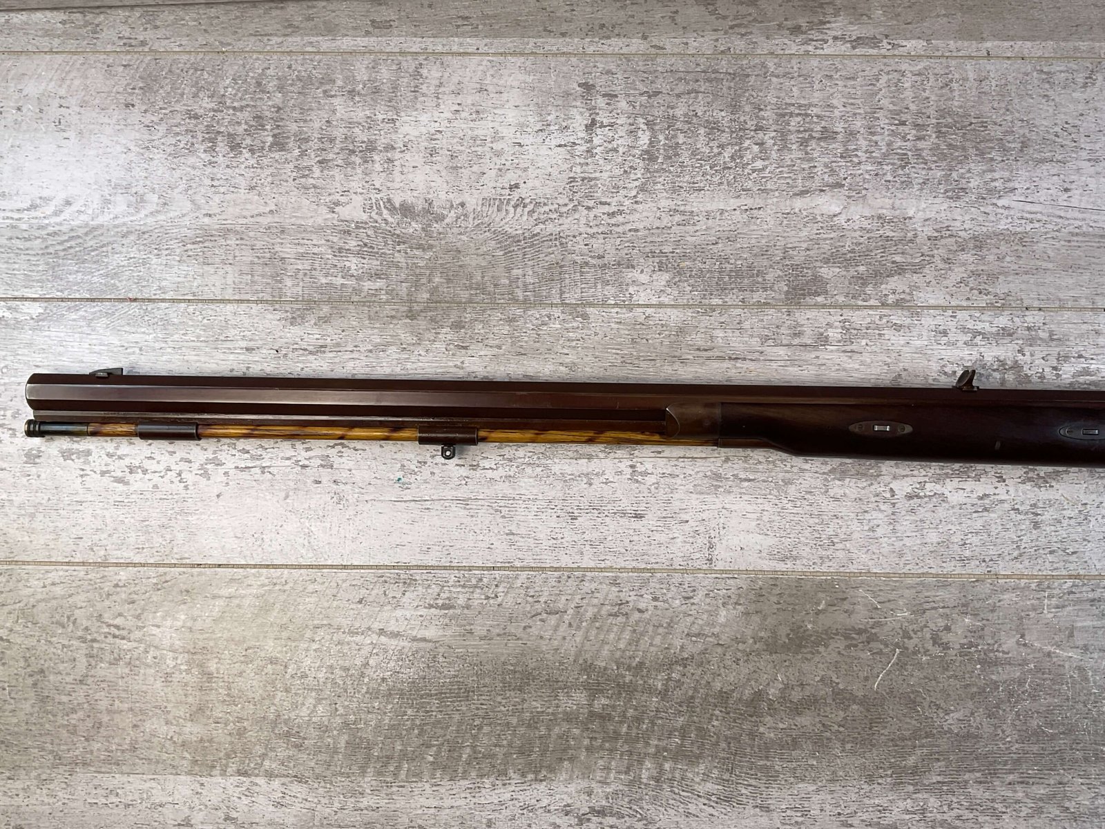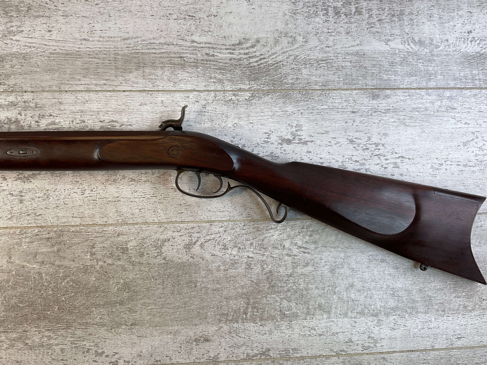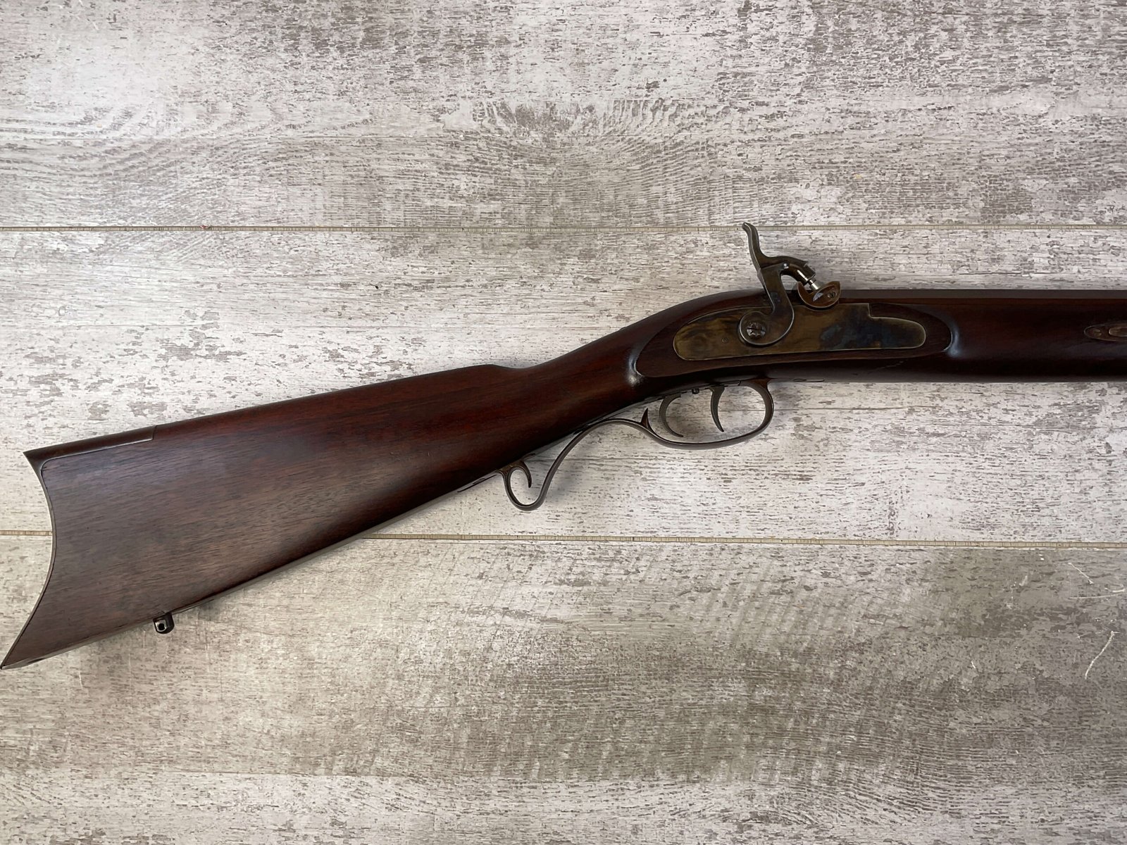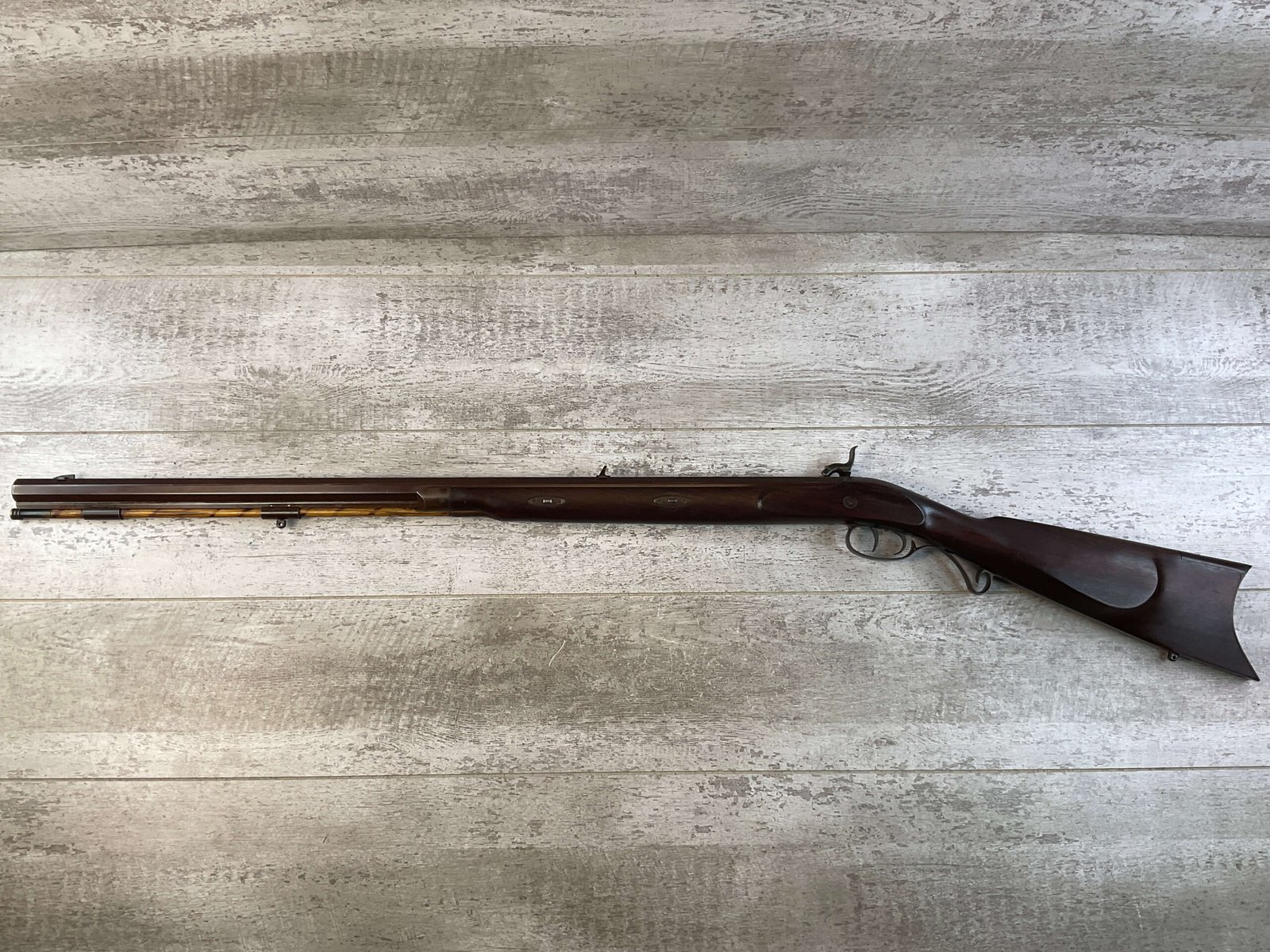 LYMAN GREAT PLAINS .54 CAL PERCUSSION RIFLE #325858, 32″ OCTAGON BARREL, EXC FINISH TURINING PLUM PATINA THROUGHOUT, EXC DARK WALNUT STOCK W/VERY LIGHT HANDLING MARKS, EXC BORE & RIFLING, 1 IN 60″ TWIST, DOUBLE SET TRIGGERS, ADJ SIGHTS, WOODEN RAMROD, 90%+ OVERALL, CONDITION AS SHOWN IN PICTURES.