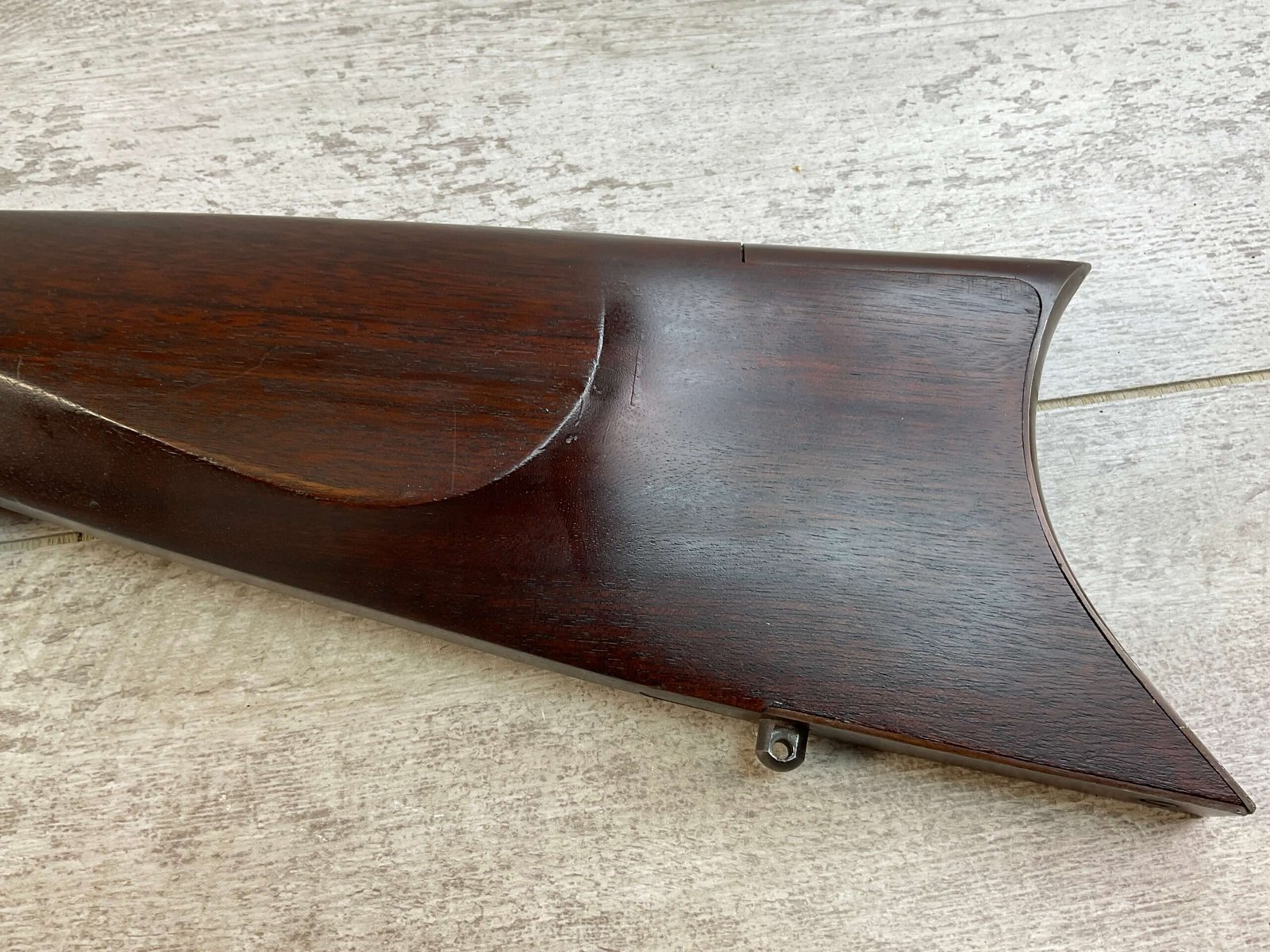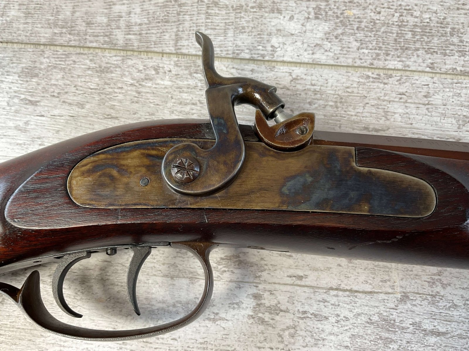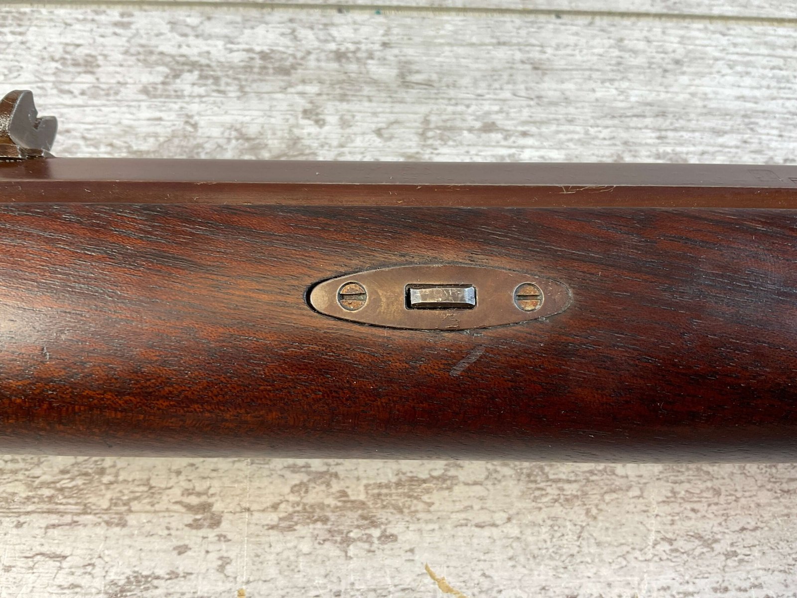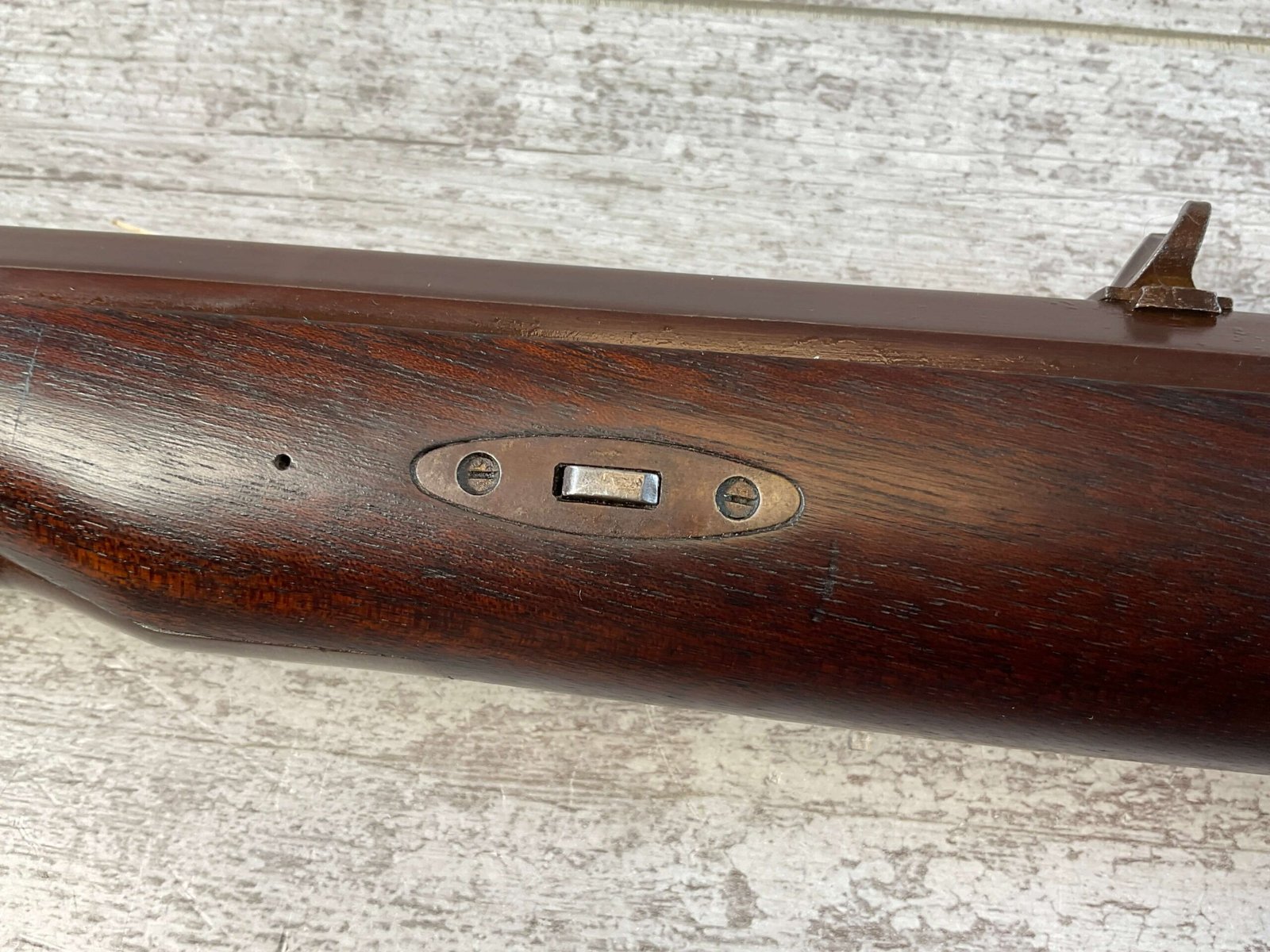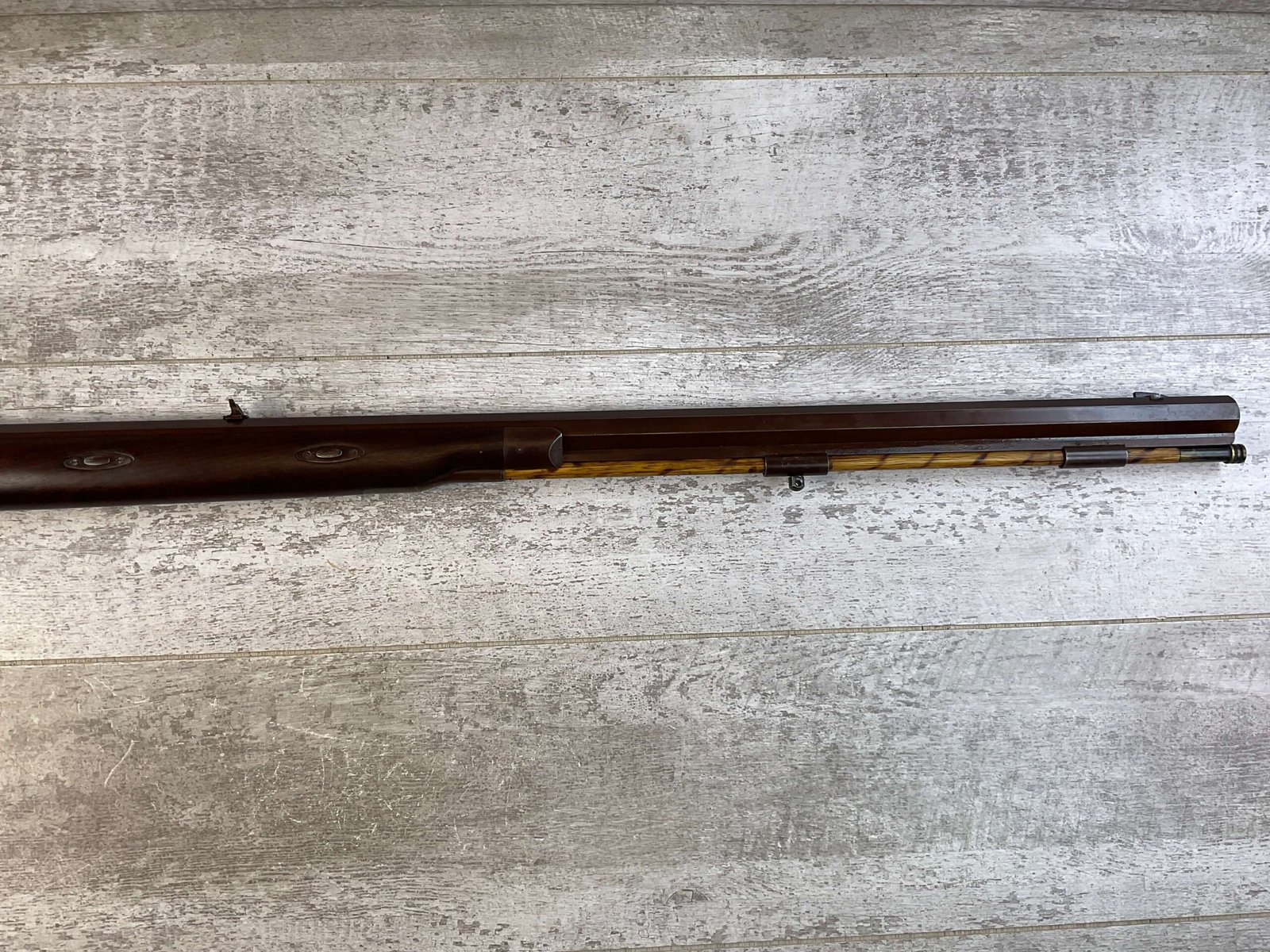 LYMAN GREAT PLAINS .54 CAL PERCUSSION RIFLE #325858, 32″ OCTAGON BARREL, EXC FINISH TURINING PLUM PATINA THROUGHOUT, EXC DARK WALNUT STOCK W/VERY LIGHT HANDLING MARKS, EXC BORE & RIFLING, 1 IN 60″ TWIST, DOUBLE SET TRIGGERS, ADJ SIGHTS, WOODEN RAMROD, 90%+ OVERALL, CONDITION AS SHOWN IN PICTURES.