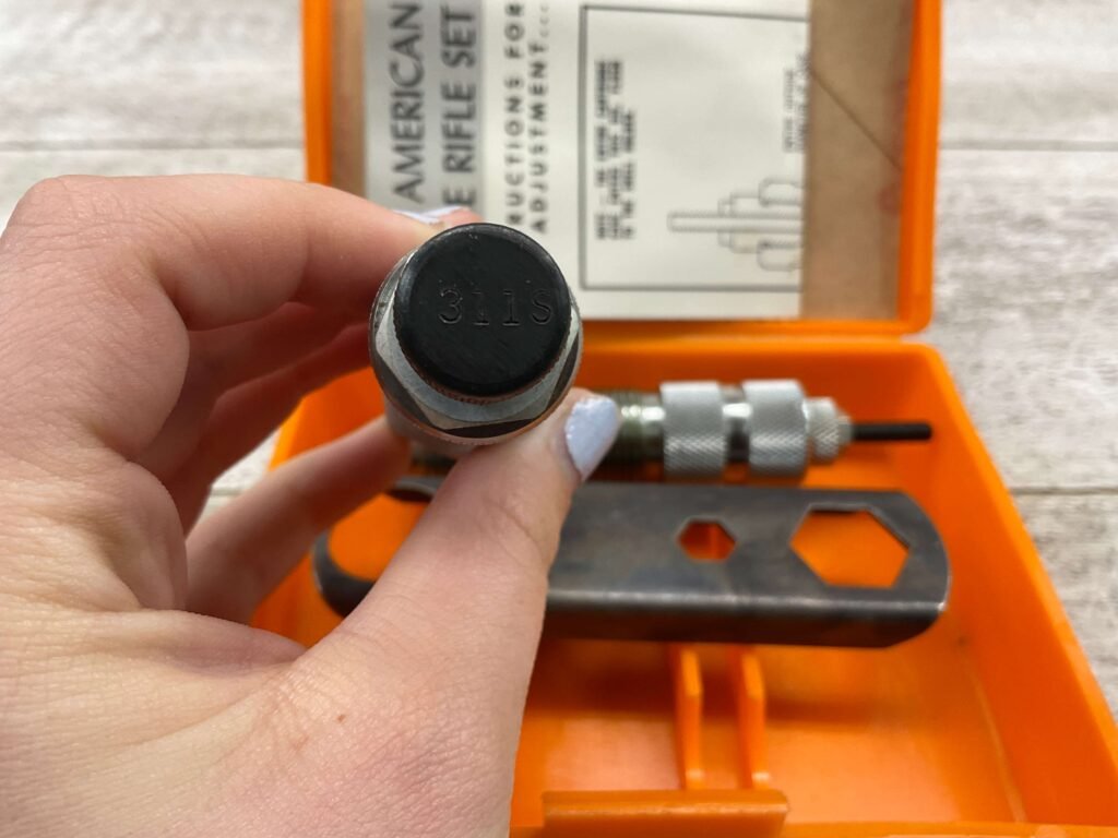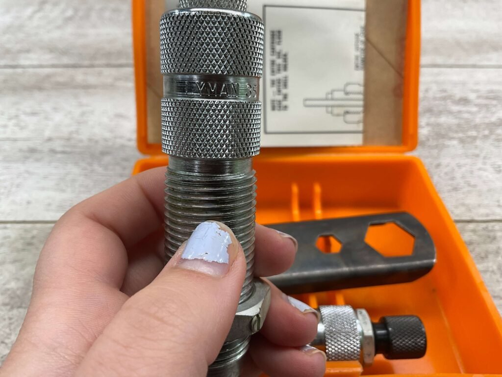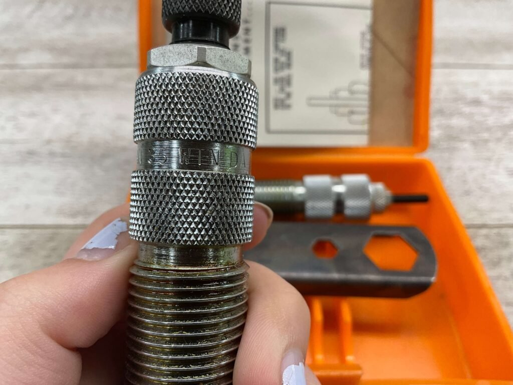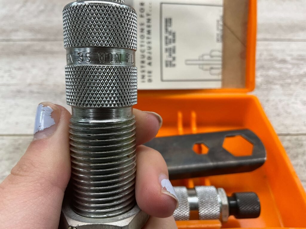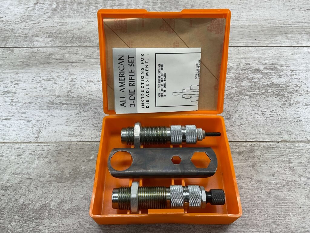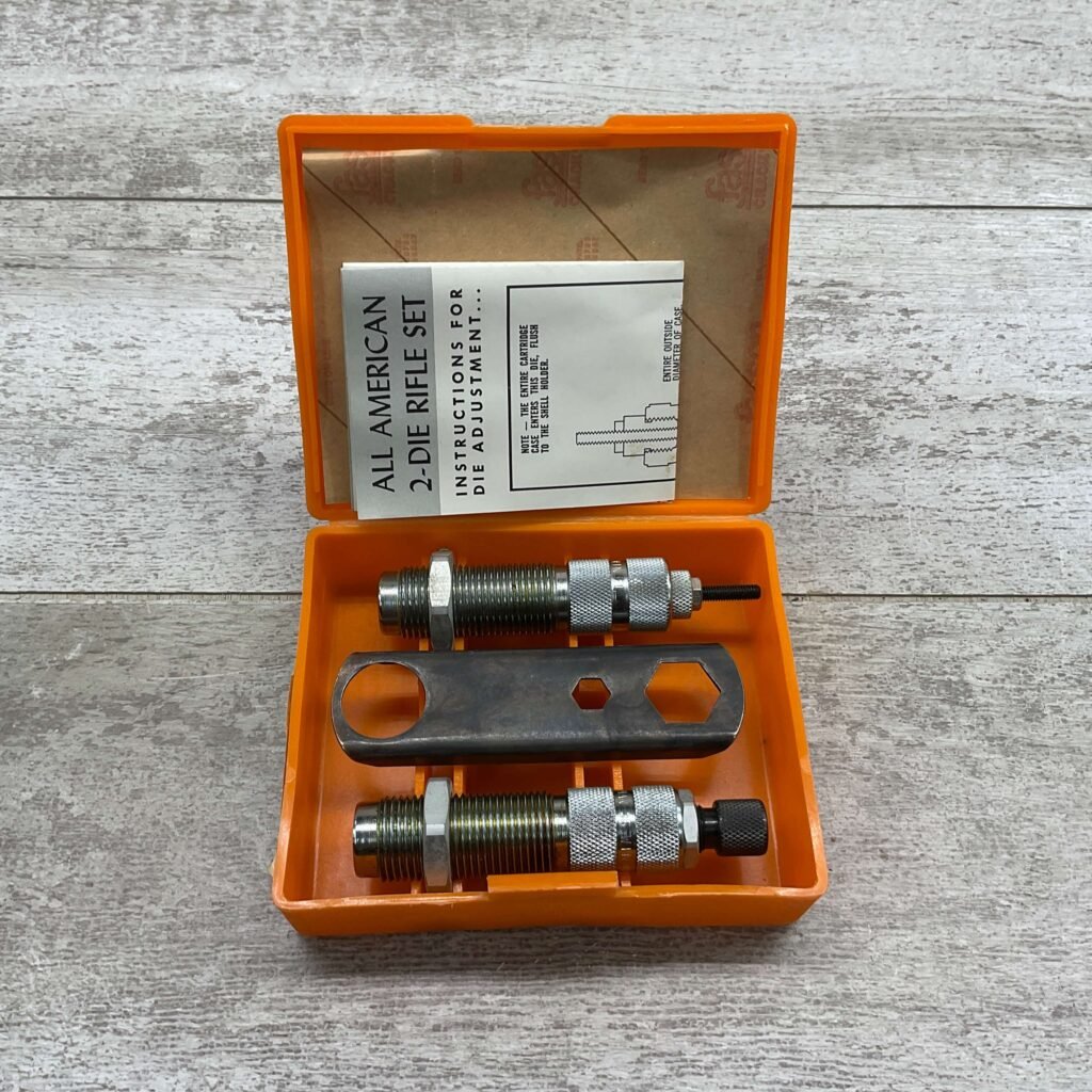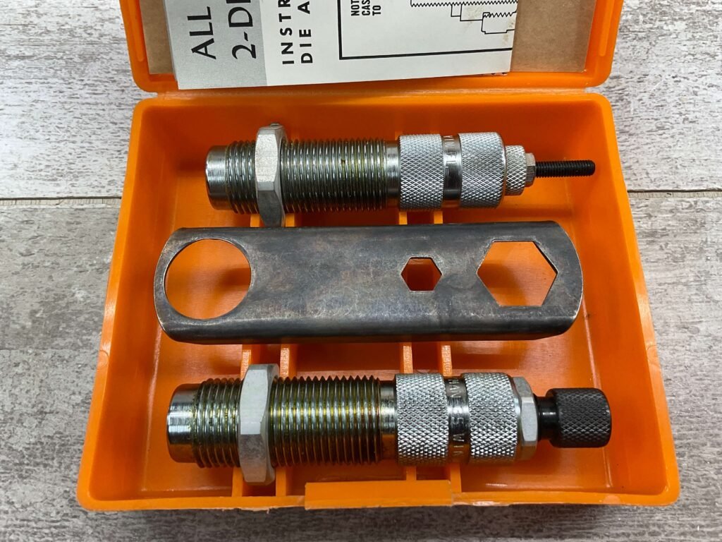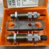 The Lyman A-A reloading 2-die set for .35 Winchester typically includes a resizing/unpriming die and a bullet seating die. These dies are crafted to resize cases, remove spent primers, and seat bullets accurately for reloading .35 Winchester cartridges.