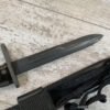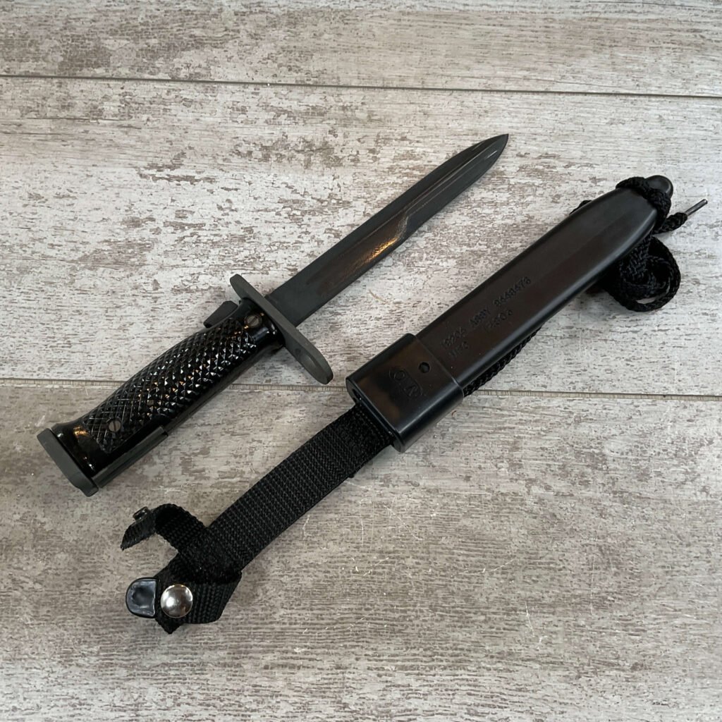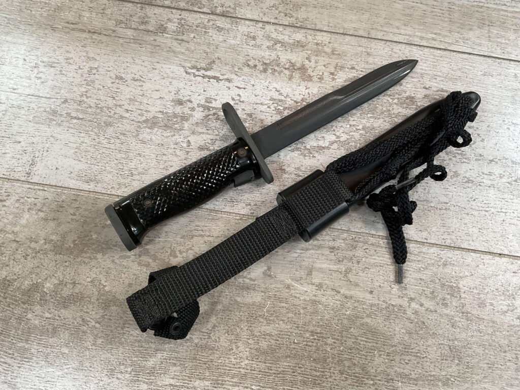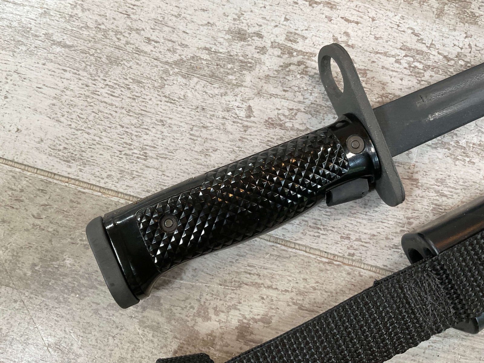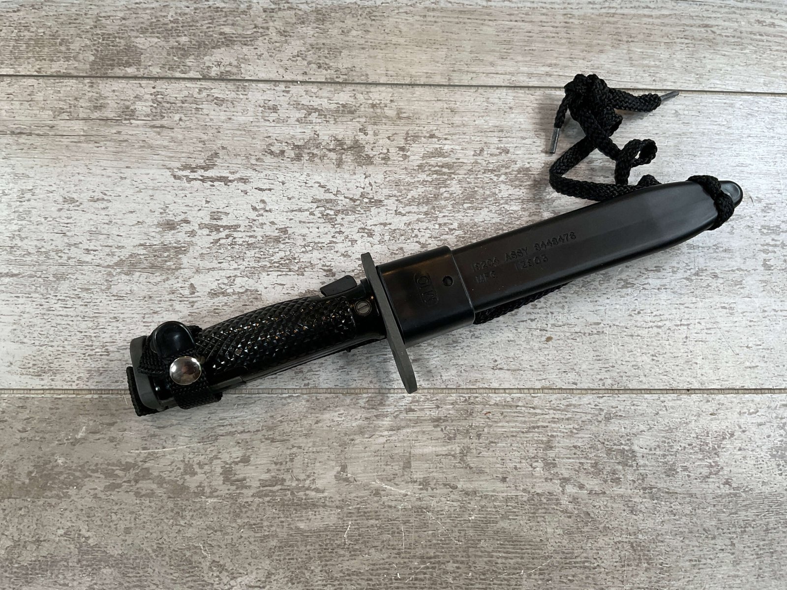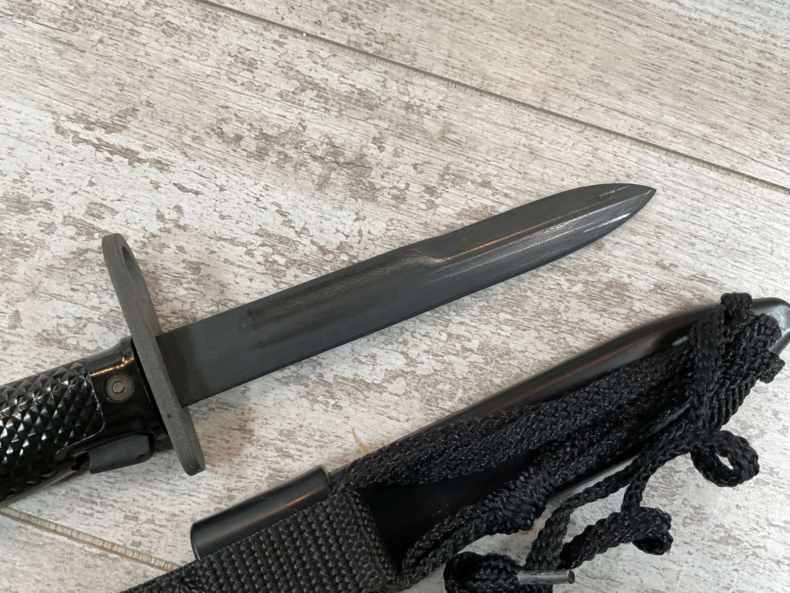 US MILITARY ISSUE VIETNAM ERA BAYONET WITH SCABBARD BAYONET STAMPED WITH US M6 AND MILPAR Col. SCABBARD STAMPED WITH M10, LIGHT SLIDE MARKS ON BLADE FROM SCABBARD, LIKE NEW CONDITION