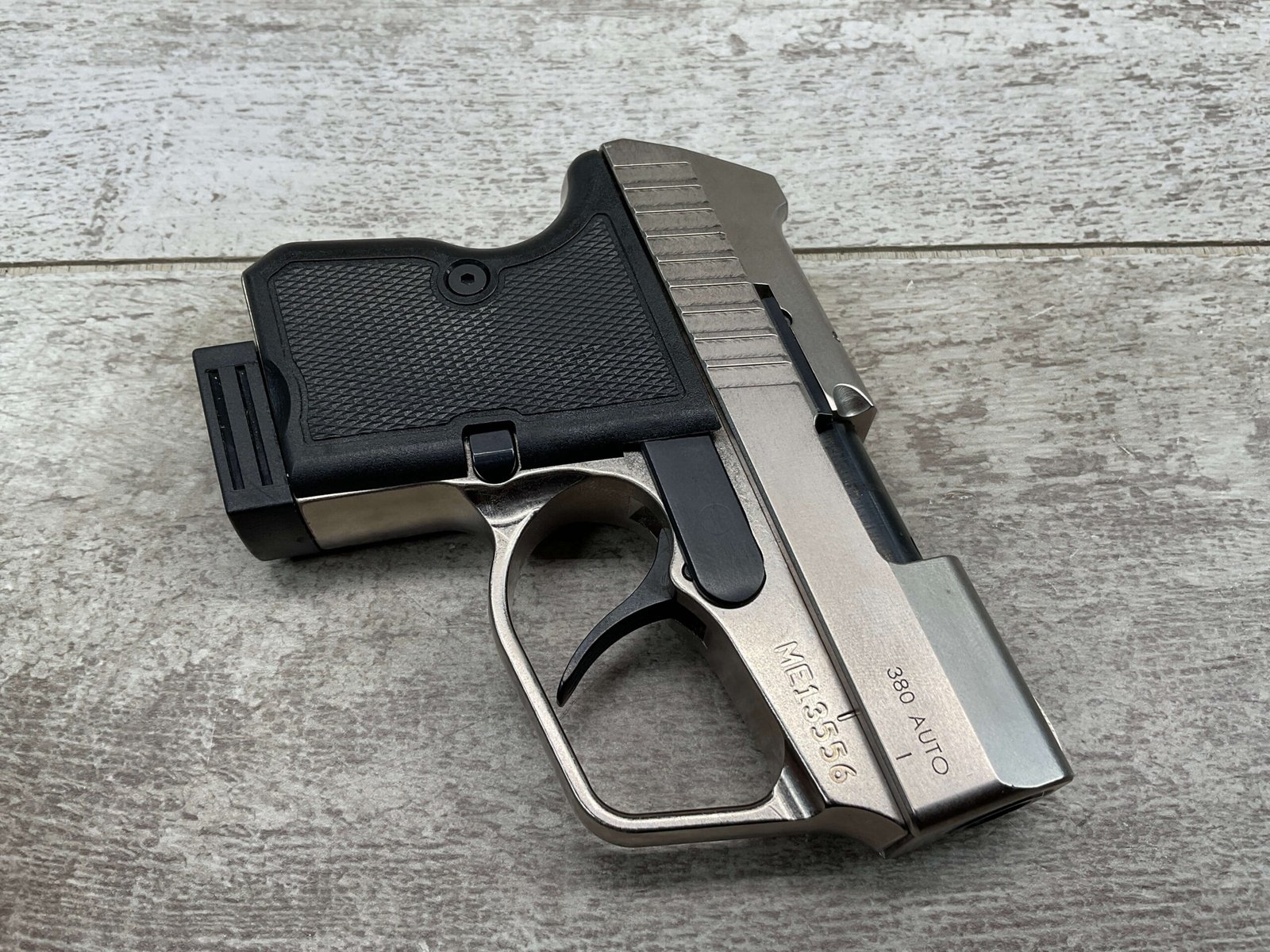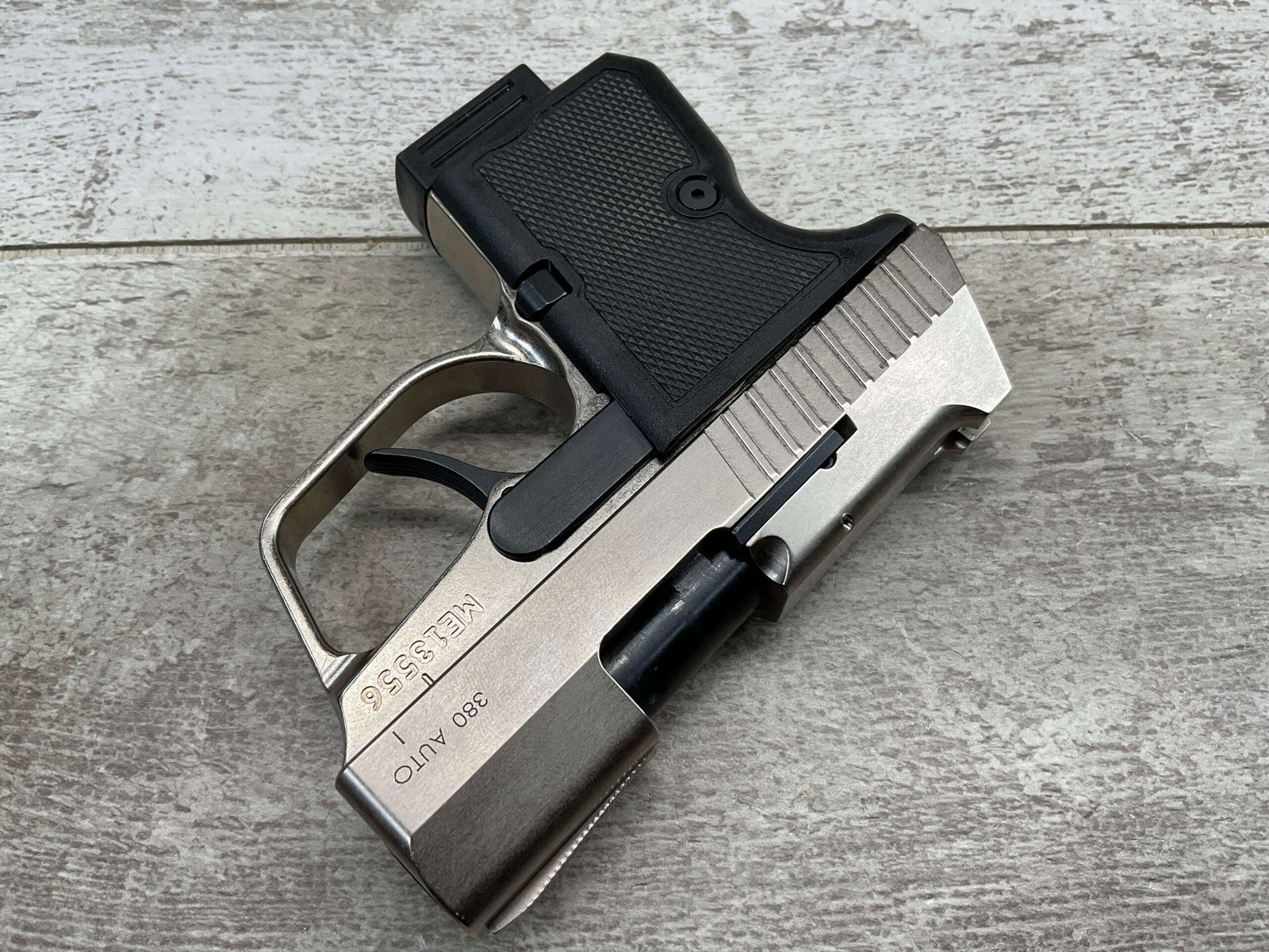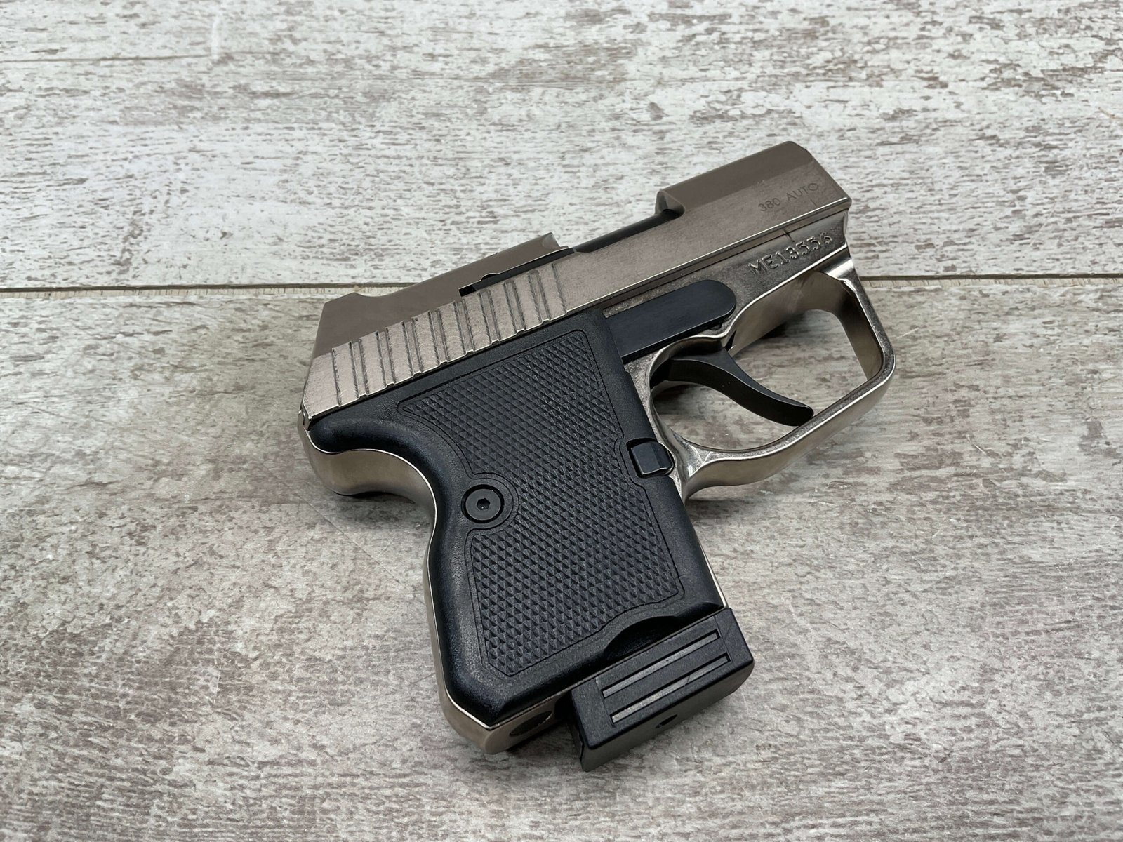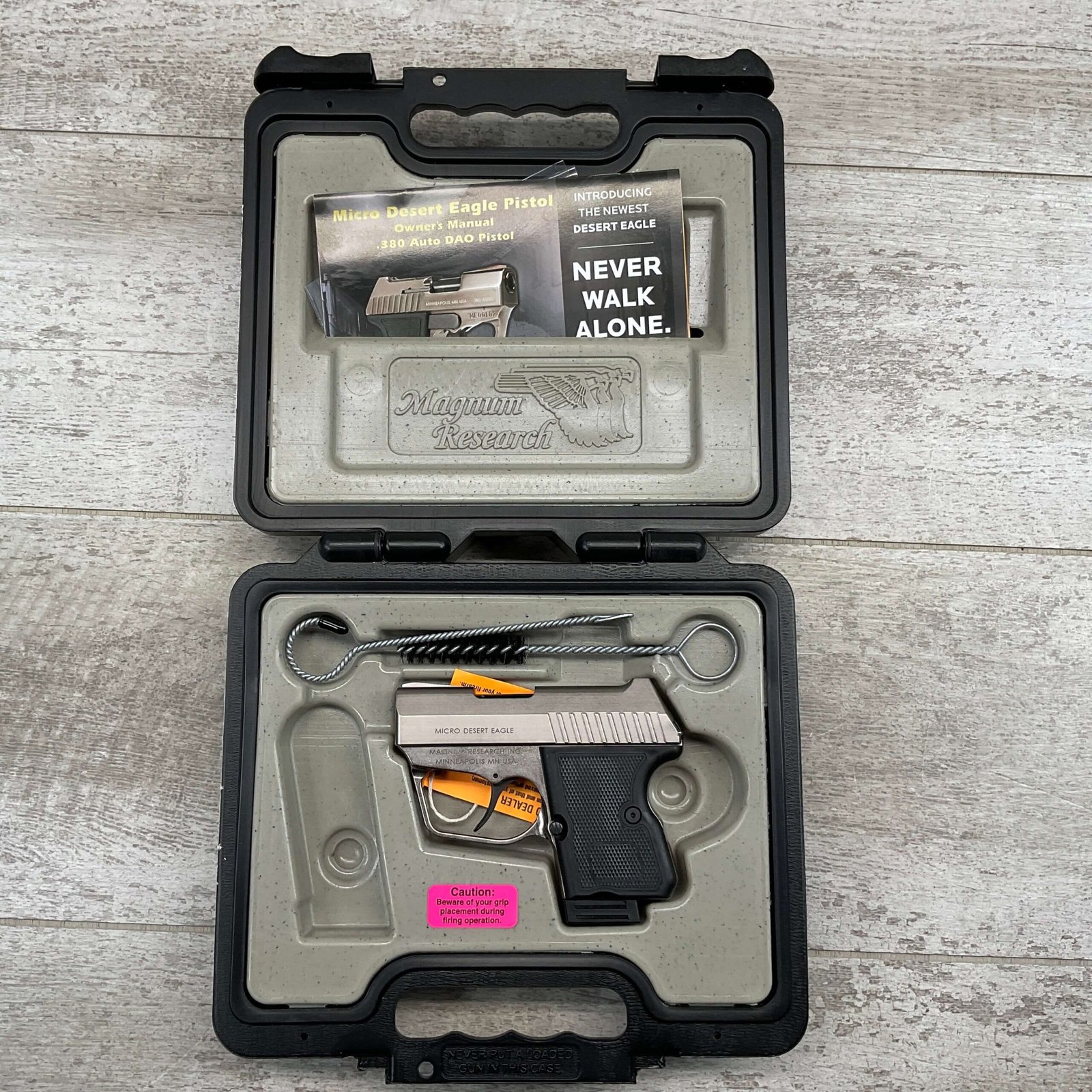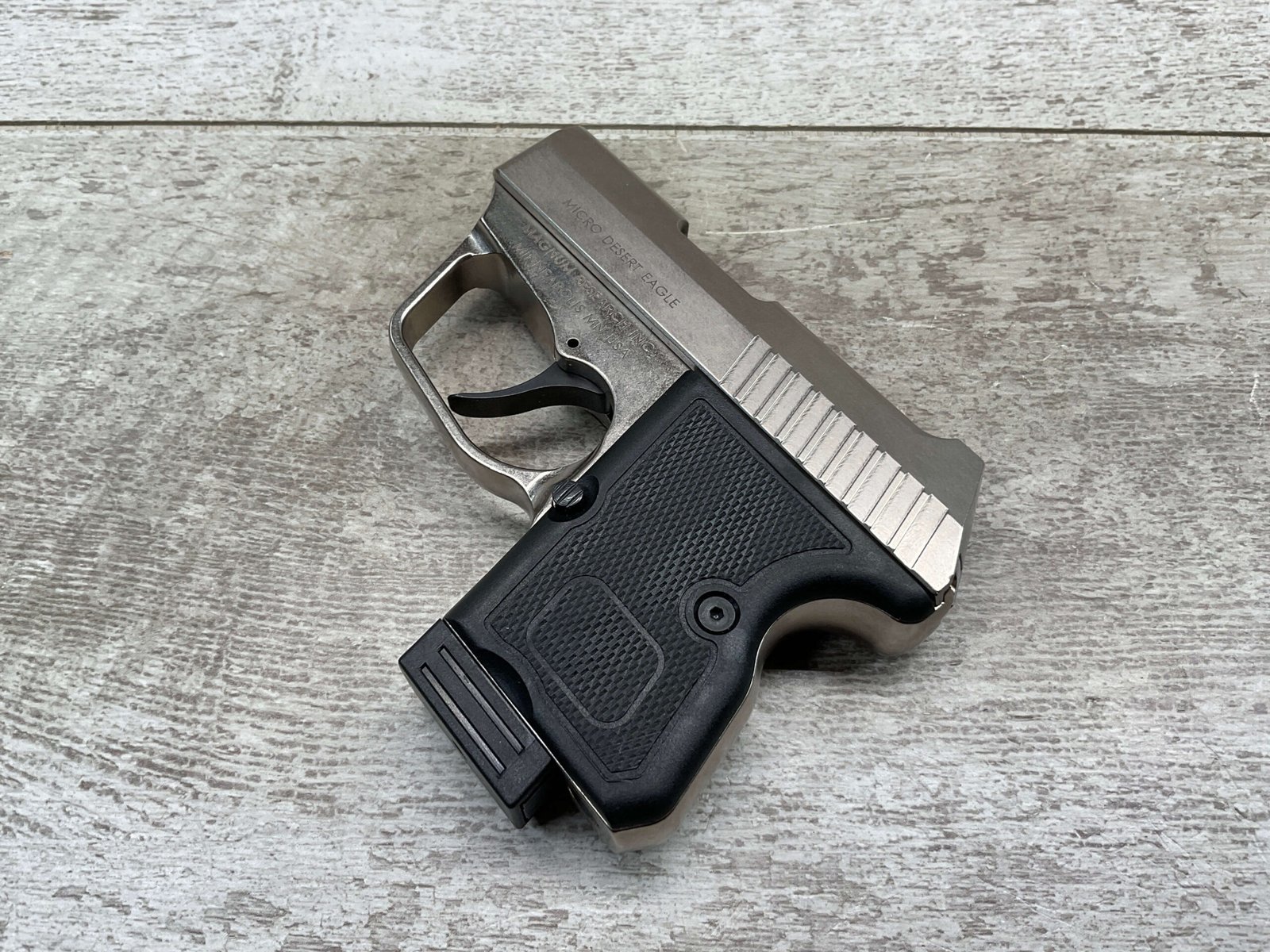 MAGNUM RESEARCH MICRO DESERT EAGLE .380 AUTO, LIKE NEW #ME13556, 2 6ROUND MAGAZINE, STAINLESS CONSTRUCTION, CHECKERED BLACK PLASTIC GRIPS, 2 1/4″ BARREL, DOUBLE ACTION, FIXED SIGHTS, OVERSIZED TRIGGER GUARD, MFG 2009-2013, EXC LIKE NEW CONDITION IN CASE