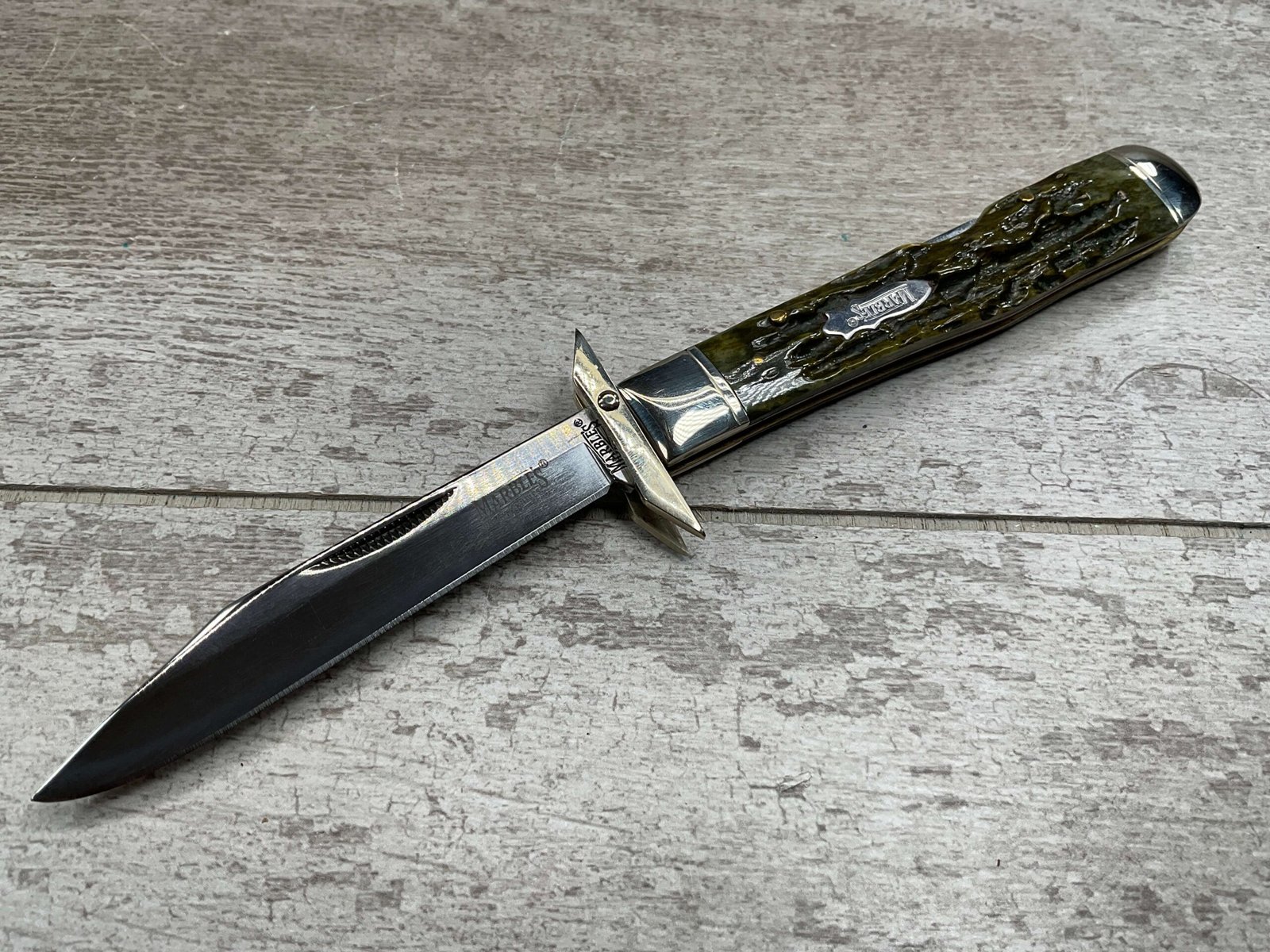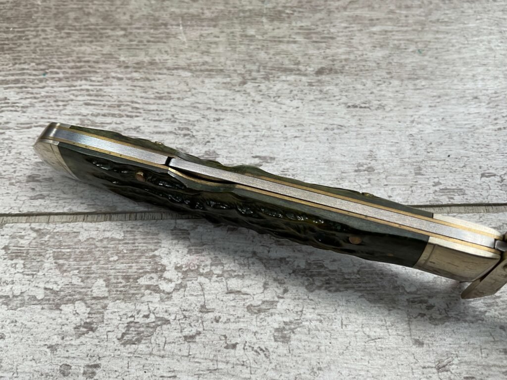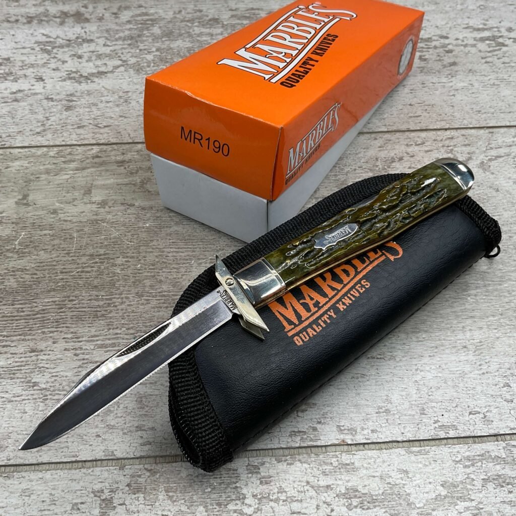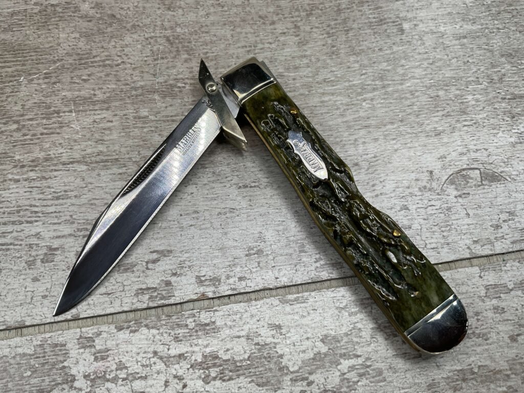 MARBLES FOLDING GUARD LOCKBACK GREEN BONE HANDLE KNIFE. MR190Â OVERALL LENGTH 4 3/8″ CLOSED.