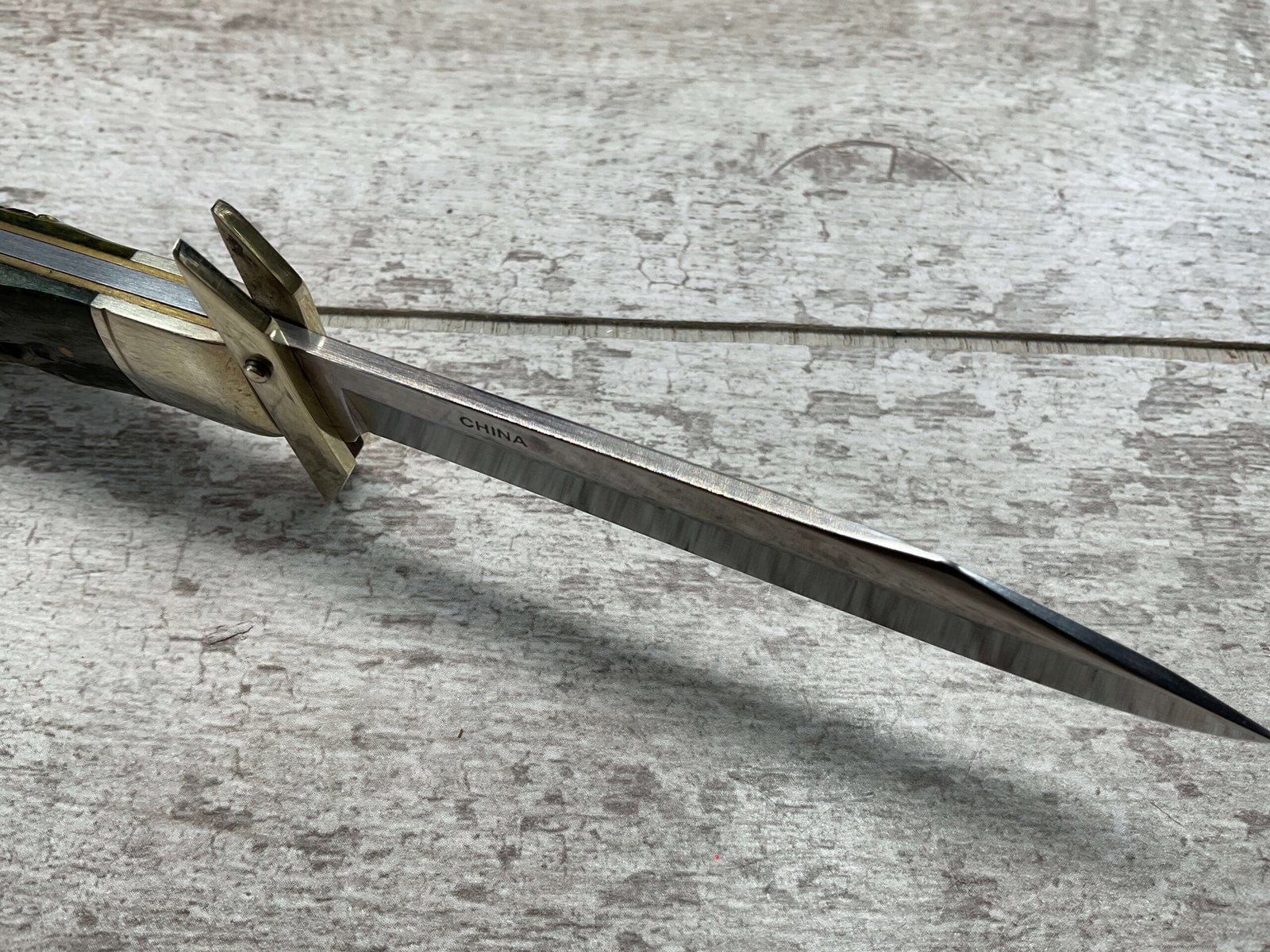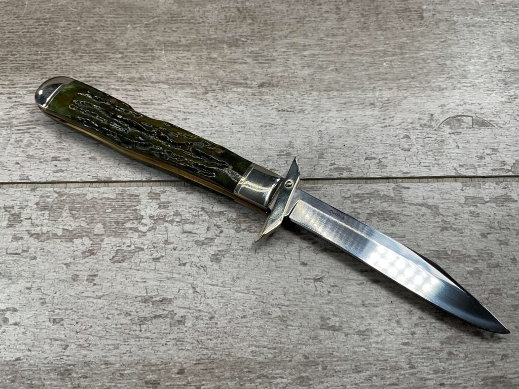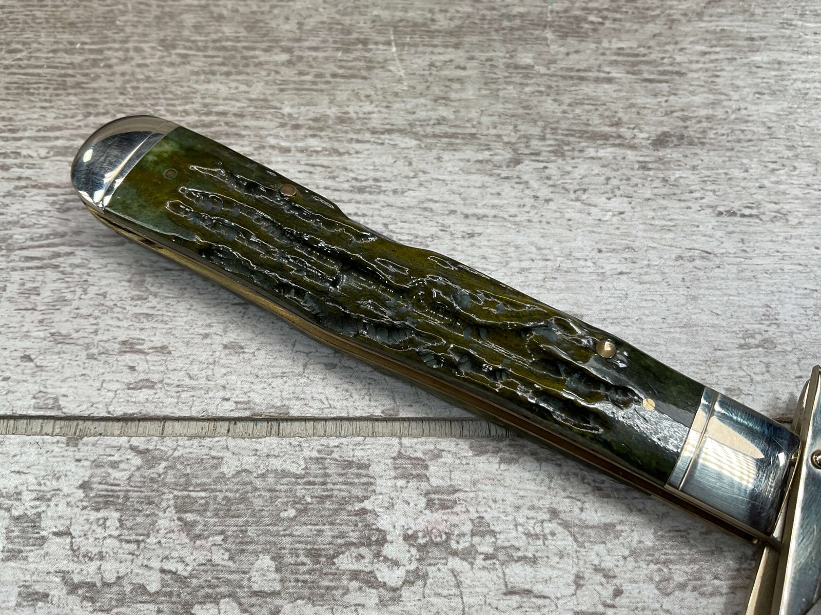 MARBLES FOLDING GUARD LOCKBACK GREEN BONE HANDLE KNIFE. MR190Â OVERALL LENGTH 4 3/8″ CLOSED.