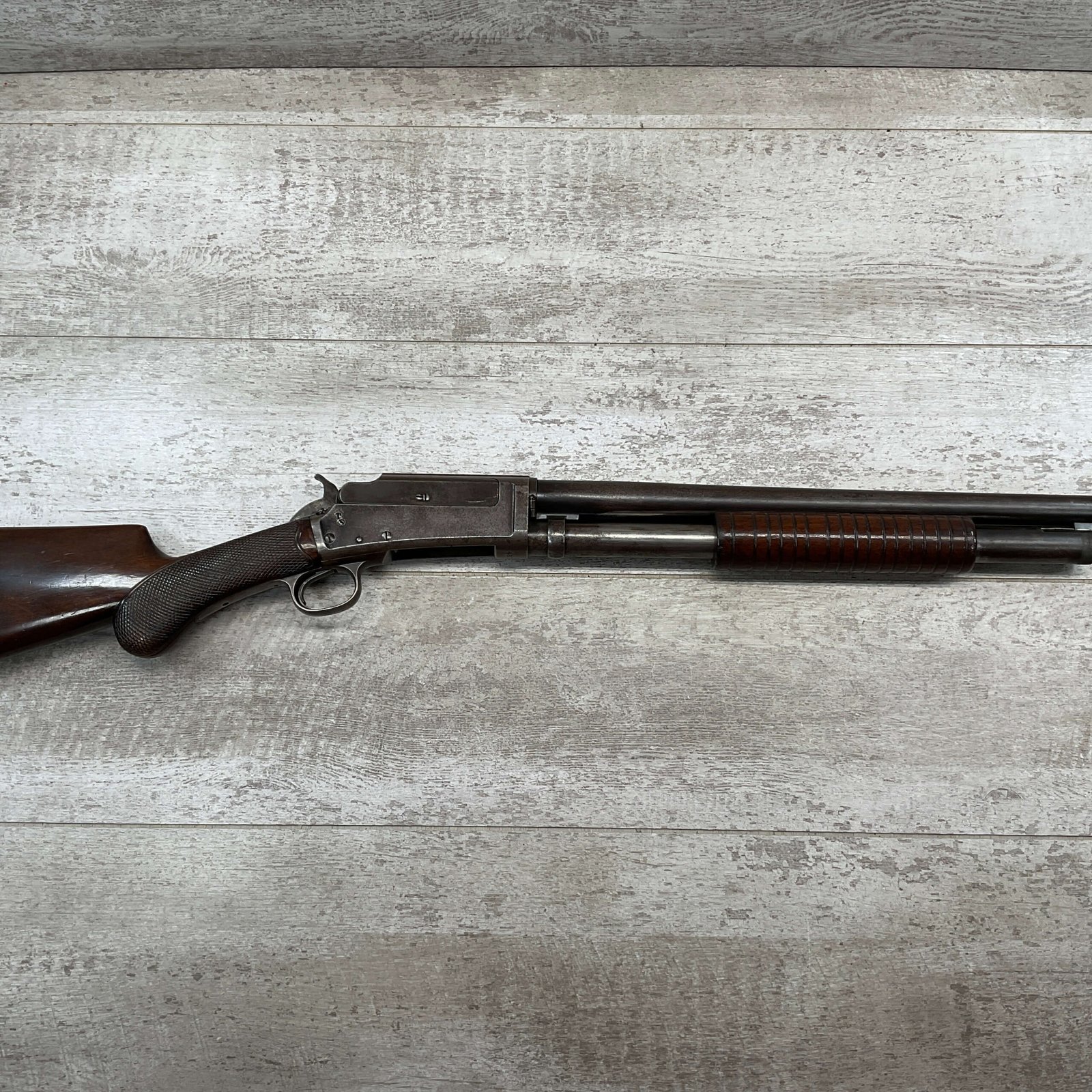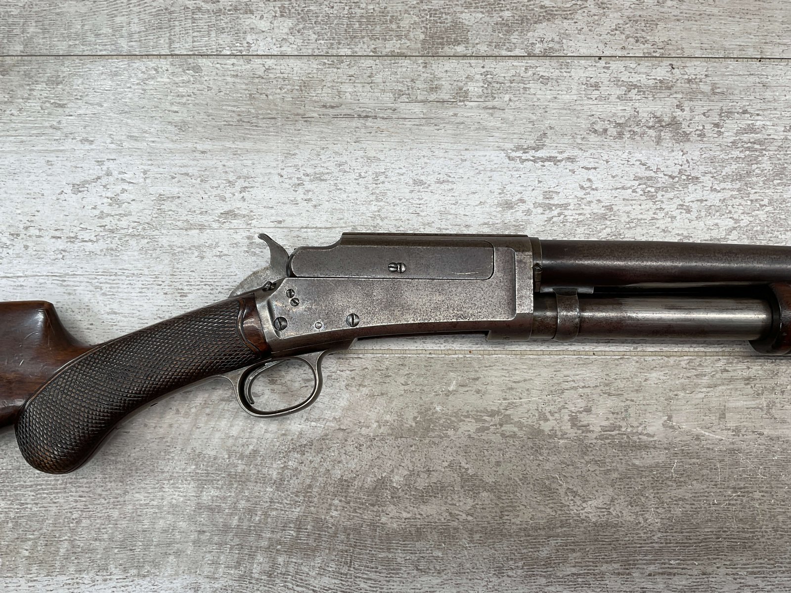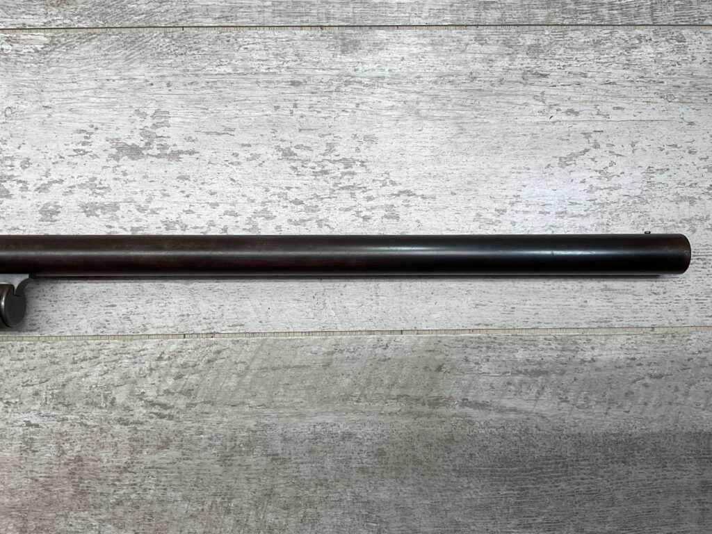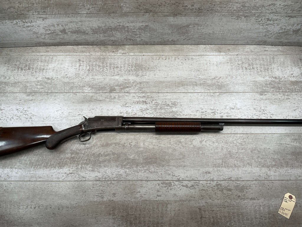MARLIN FIRE-ARMS CO MODEL 1898 12GA SLIDE ACTION SHOTGUN #48913, 30″ BBL, BLUE FINISH TURNED BROWN PATINA, VG CHECKERED WALNUT PISTOL GRIP STOCK, BRIGHT BORE W/LIGHT FROSTING IN AREAS, FULL CHOKE, FRONT BEAD SIGHT, BBL SERIAL # DOESN’T MATCH AND ACCORDING TO RESEARCH THEY USUALLY DO NOT, EXPOSED HAMMER, REPLACEMENT PLASTIC RECOIL PAD, 1904 MFR, GREAT CONDITION CONSIDERING AGE!