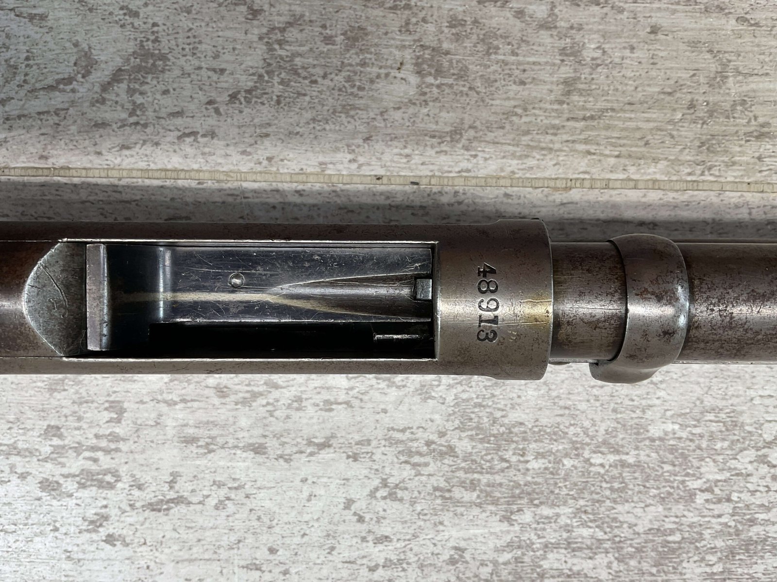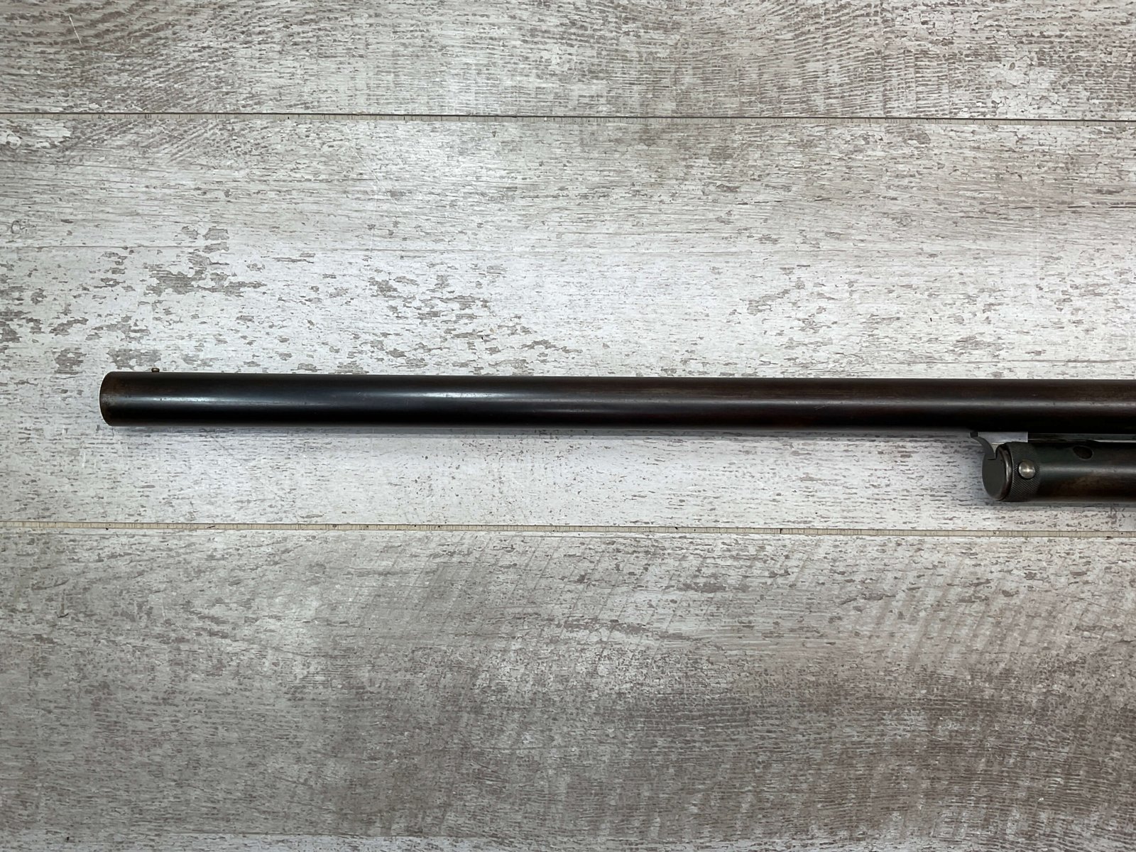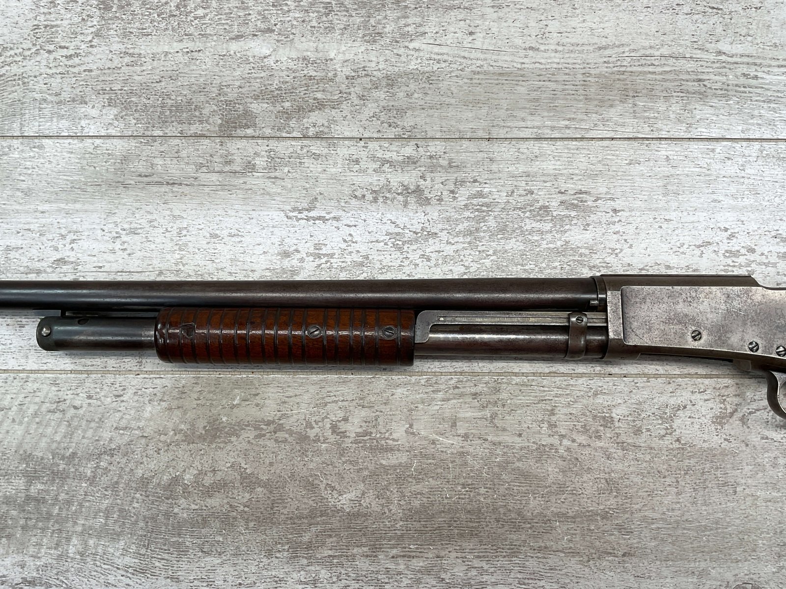 MARLIN FIRE-ARMS CO MODEL 1898 12GA SLIDE ACTION SHOTGUN #48913, 30″ BBL, BLUE FINISH TURNED BROWN PATINA, VG CHECKERED WALNUT PISTOL GRIP STOCK, BRIGHT BORE W/LIGHT FROSTING IN AREAS, FULL CHOKE, FRONT BEAD SIGHT, BBL SERIAL # DOESN’T MATCH AND ACCORDING TO RESEARCH THEY USUALLY DO NOT, EXPOSED HAMMER, REPLACEMENT PLASTIC RECOIL PAD, 1904 MFR, GREAT CONDITION CONSIDERING AGE!