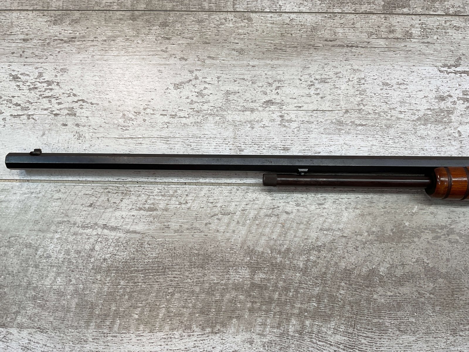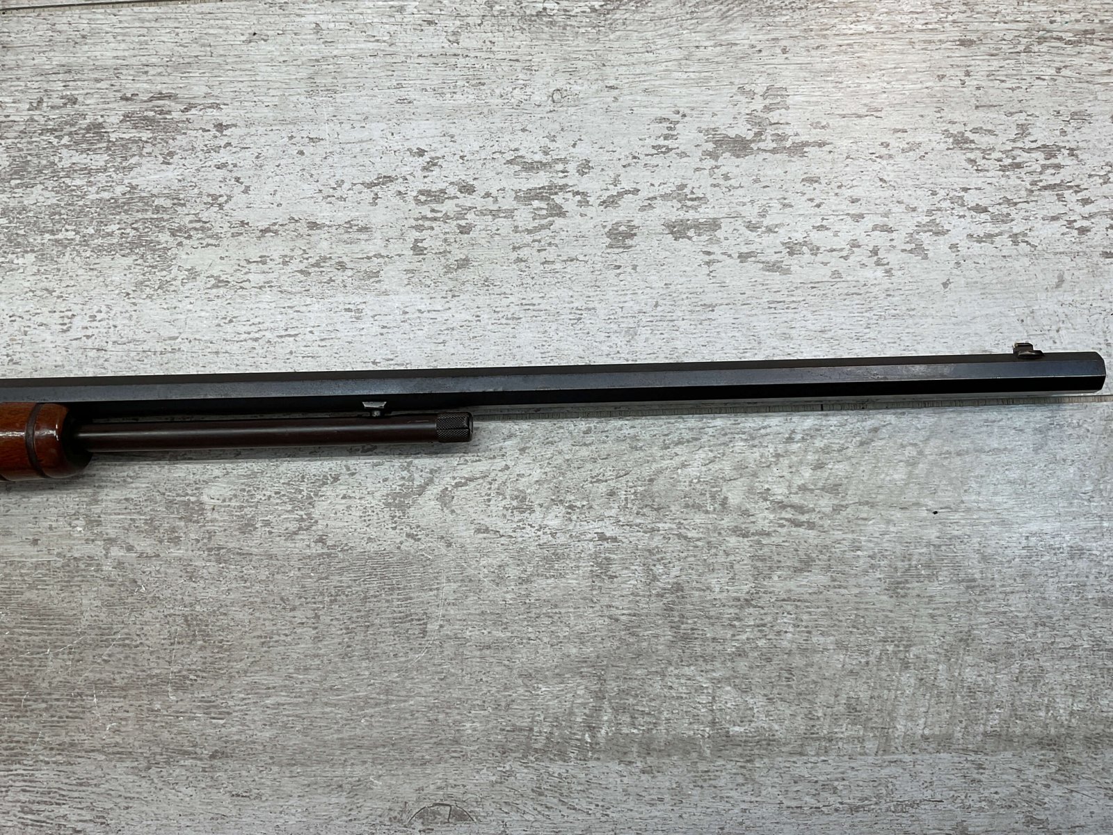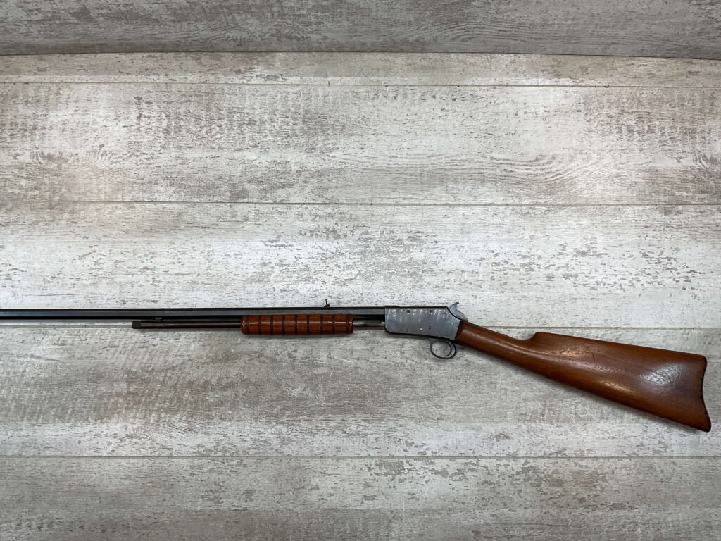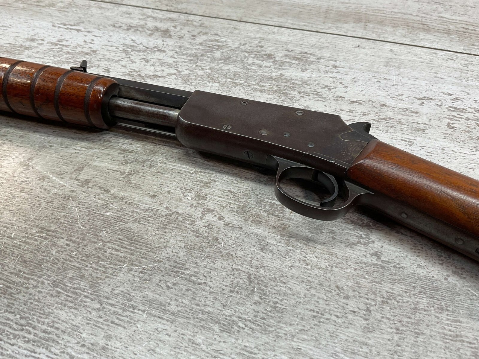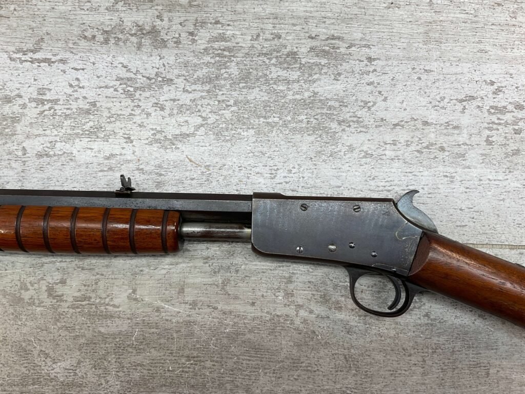 MARLIN MODEL 20 .22LR SLIDE ACTION RIFLE #NSN, 23″ OCTAGON BARREL, EXPOSED HAMMER, EXC BLUED FINISH W/AREAS TURNING BROWN PATINA, EXC STRAIGHT GRIP WALNUT STOCK & FOREND, TUBE MAGAZINE, OPEN SIGHTS W/REAR FOLDING, TAKEDOWN, METAL BUTT PLATE, MANUFACTURED 1907-1922, GOOD BORE W/LIGHT FROSTING IN AREAS, STRONG RIFLING, GREAT LITTLE SHOOTER!!