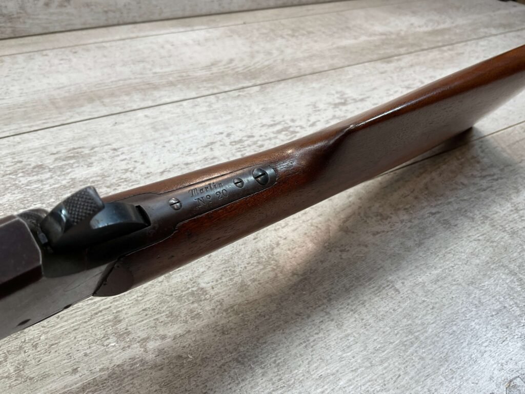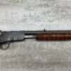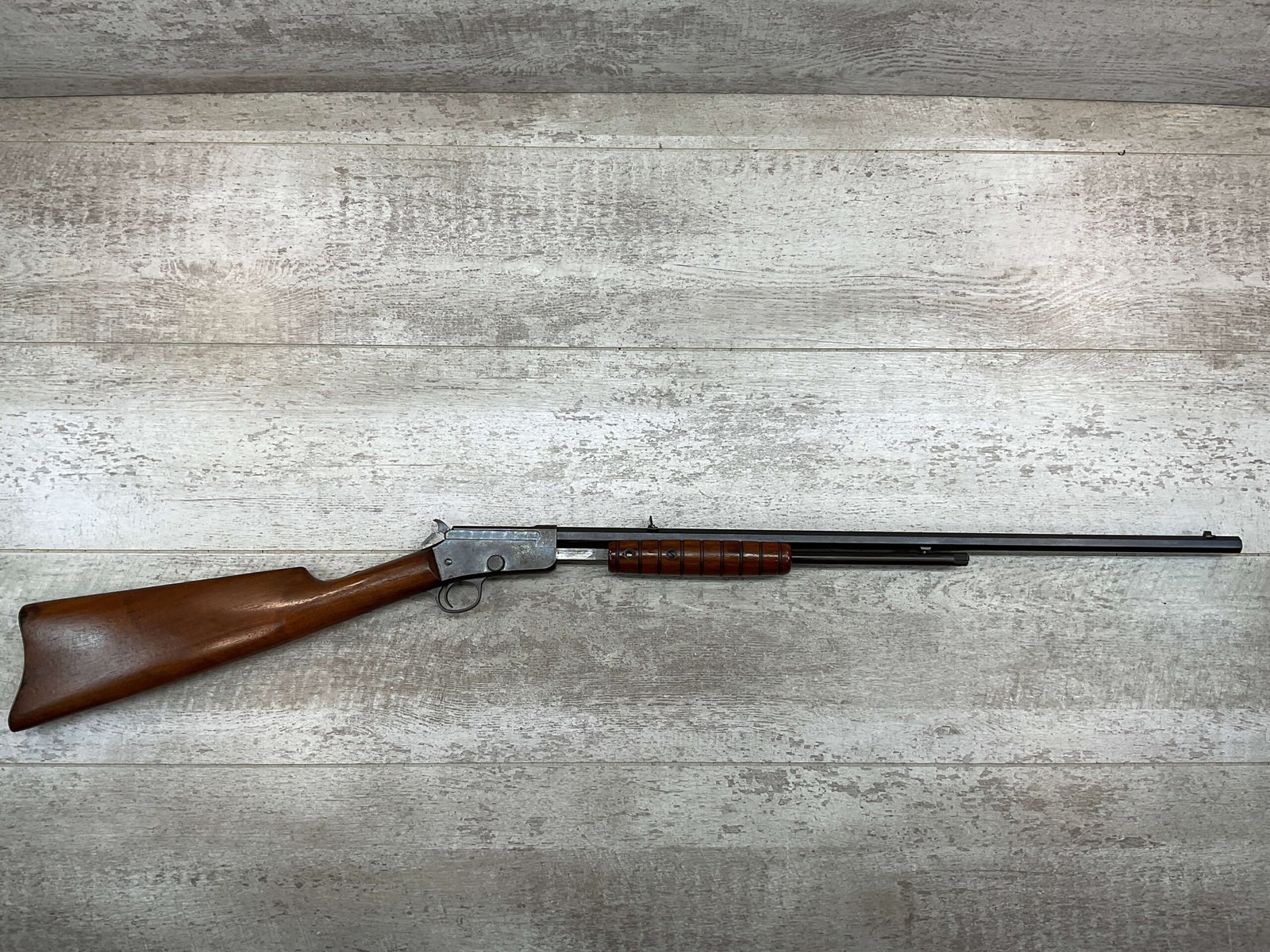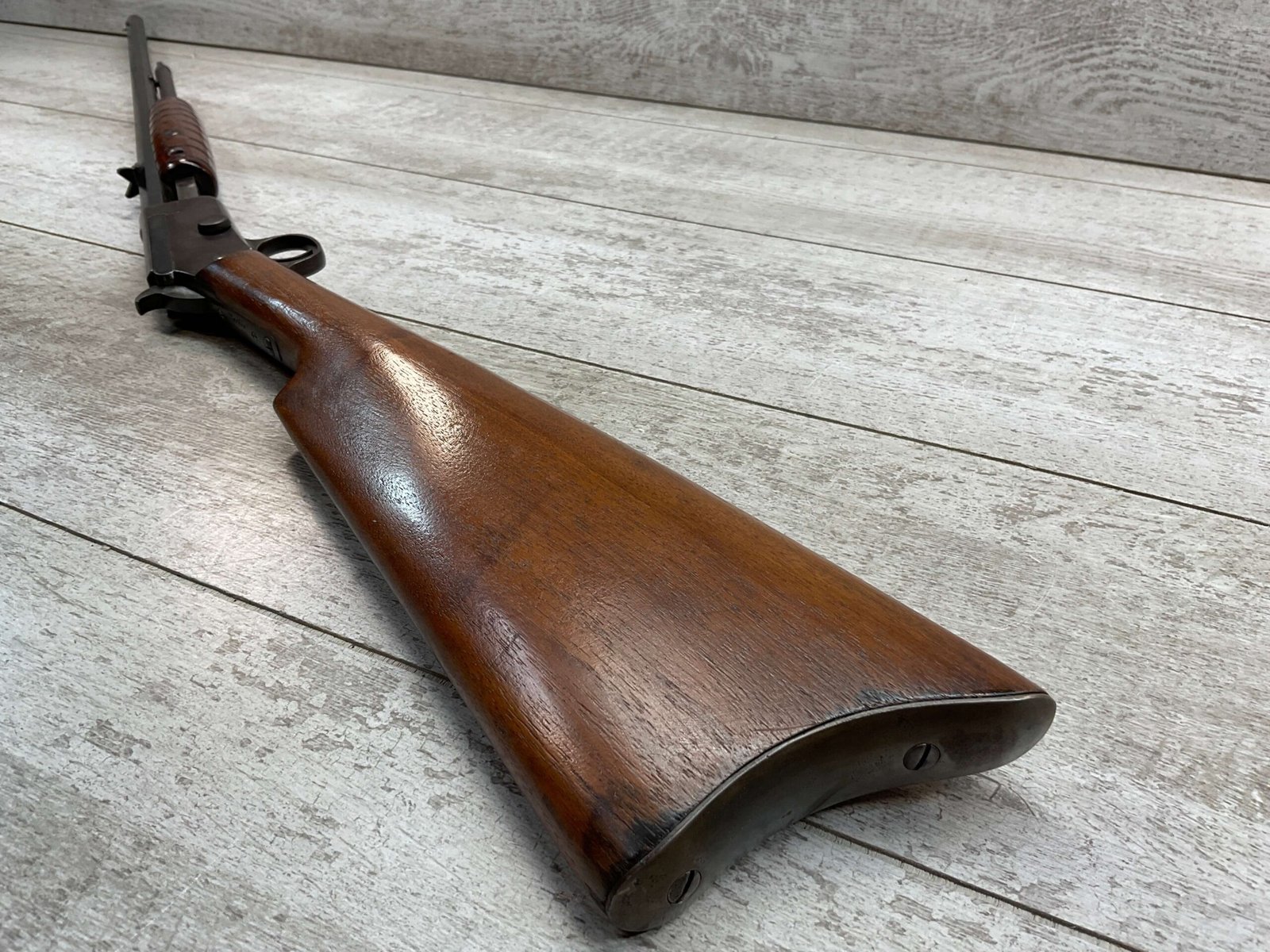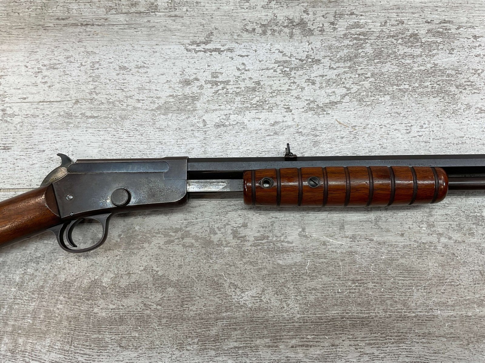 MARLIN MODEL 20 .22LR SLIDE ACTION RIFLE #NSN, 23″ OCTAGON BARREL, EXPOSED HAMMER, EXC BLUED FINISH W/AREAS TURNING BROWN PATINA, EXC STRAIGHT GRIP WALNUT STOCK & FOREND, TUBE MAGAZINE, OPEN SIGHTS W/REAR FOLDING, TAKEDOWN, METAL BUTT PLATE, MANUFACTURED 1907-1922, GOOD BORE W/LIGHT FROSTING IN AREAS, STRONG RIFLING, GREAT LITTLE SHOOTER!!