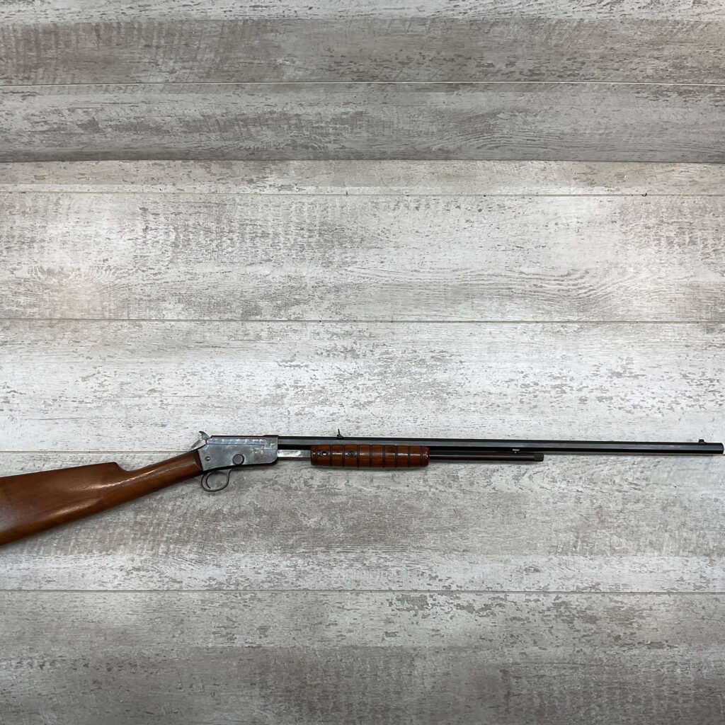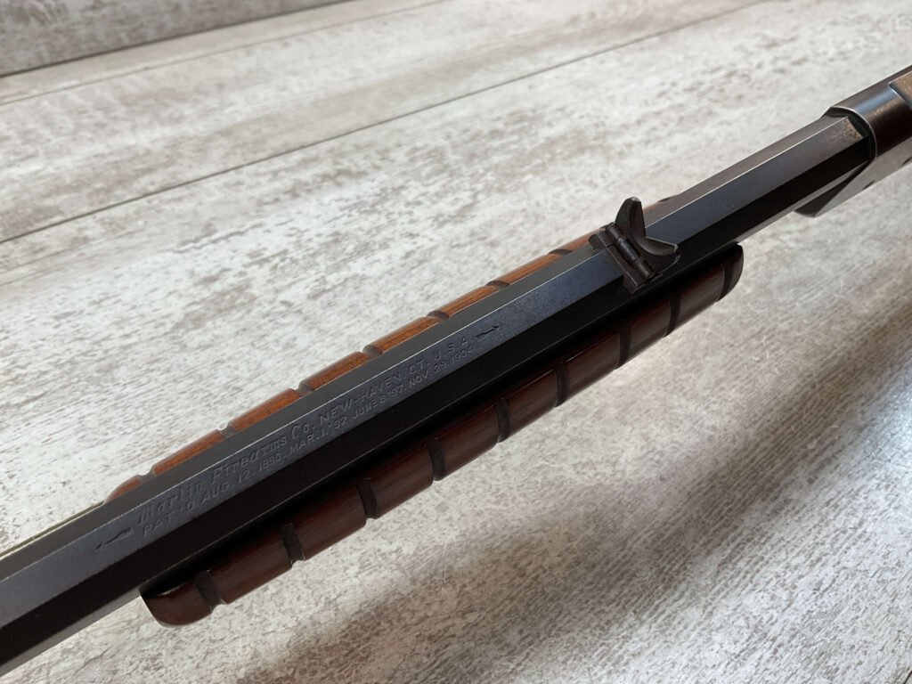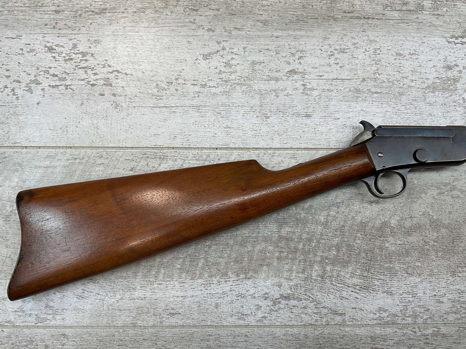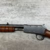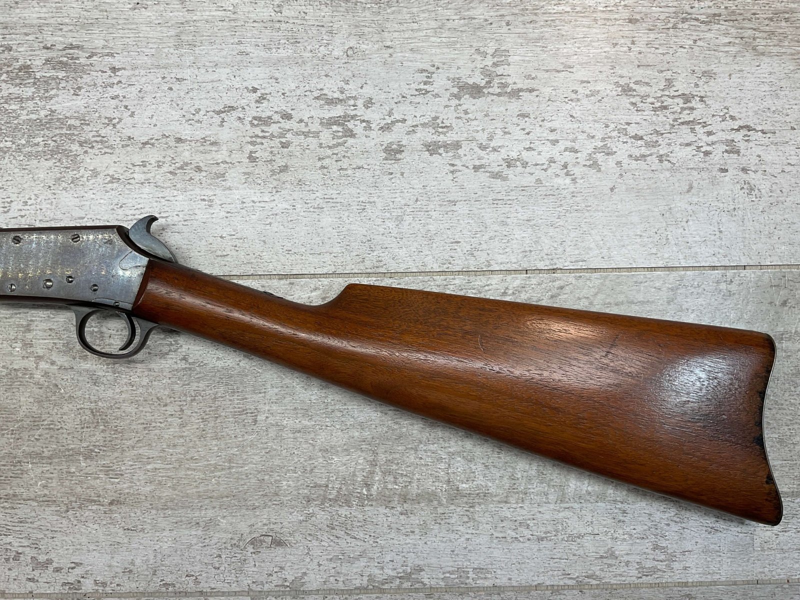 MARLIN MODEL 20 .22LR SLIDE ACTION RIFLE #NSN, 23″ OCTAGON BARREL, EXPOSED HAMMER, EXC BLUED FINISH W/AREAS TURNING BROWN PATINA, EXC STRAIGHT GRIP WALNUT STOCK & FOREND, TUBE MAGAZINE, OPEN SIGHTS W/REAR FOLDING, TAKEDOWN, METAL BUTT PLATE, MANUFACTURED 1907-1922, GOOD BORE W/LIGHT FROSTING IN AREAS, STRONG RIFLING, GREAT LITTLE SHOOTER!!