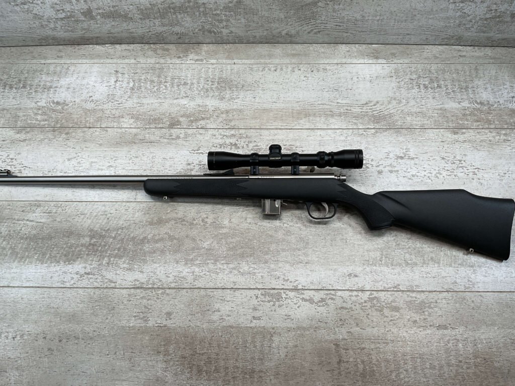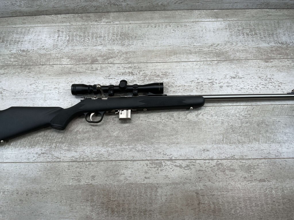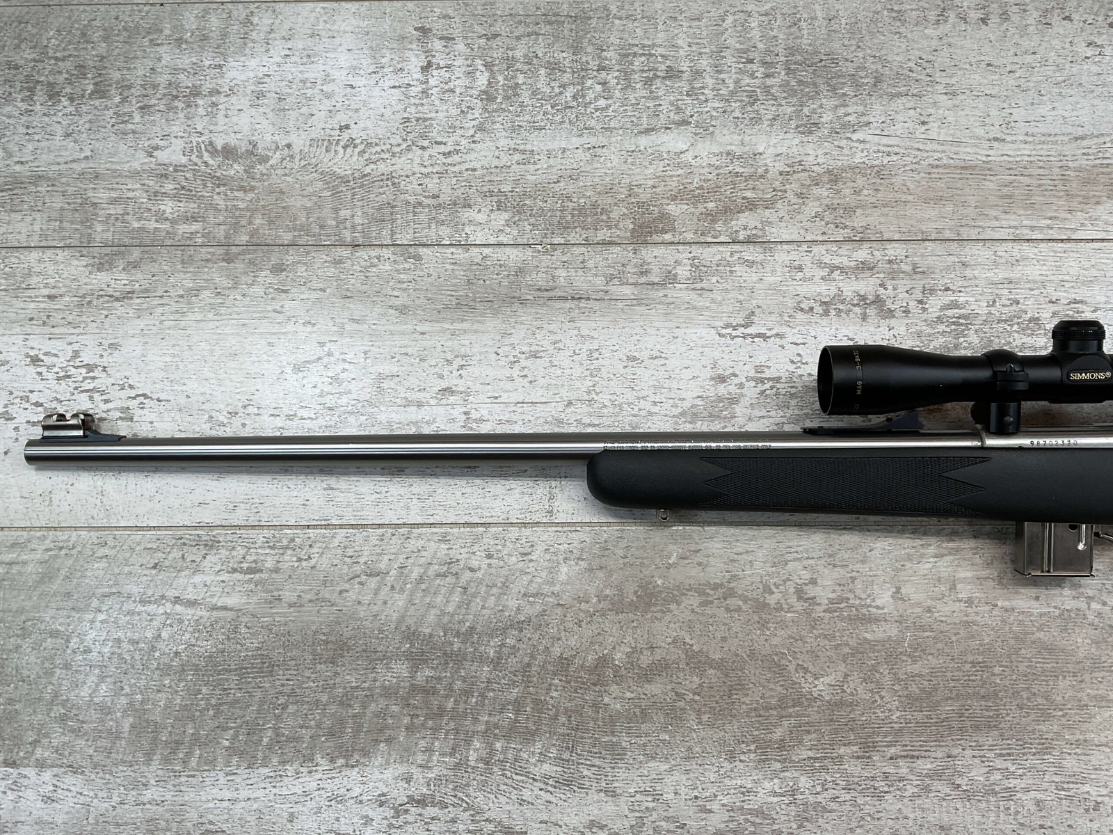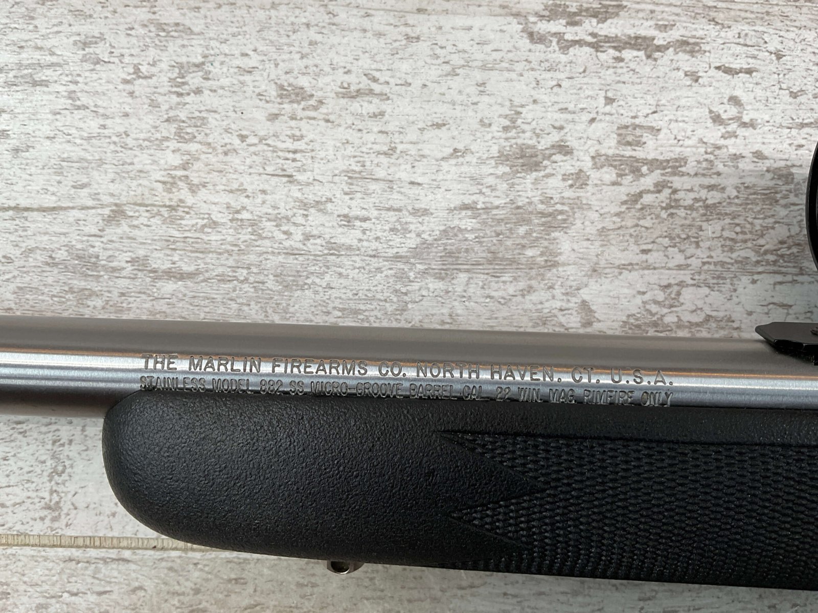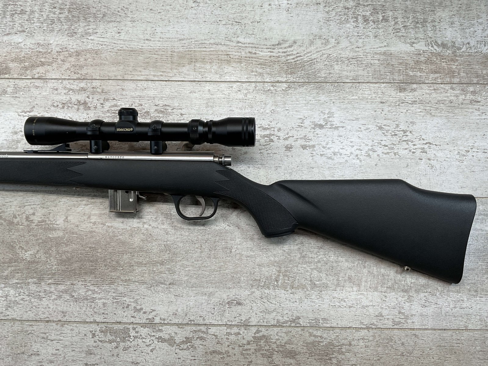 MARLIN MODEL 882-SS .22 WIN MAG BOLT ACTION RIFLE W/SCOPE #98702320, 22″ JM STAMPED STAINLESS STEEL BARREL, EXC MICRO GROOVE RIFLING, 3-9X32 SIMMONS SCOPE, 7 ROUND MAGAZINE, BLACK SYNTHETIC STOCK, MIRROR BRIGHT BORE, VERY LIGHT HANDLING MARKS, 98+%
