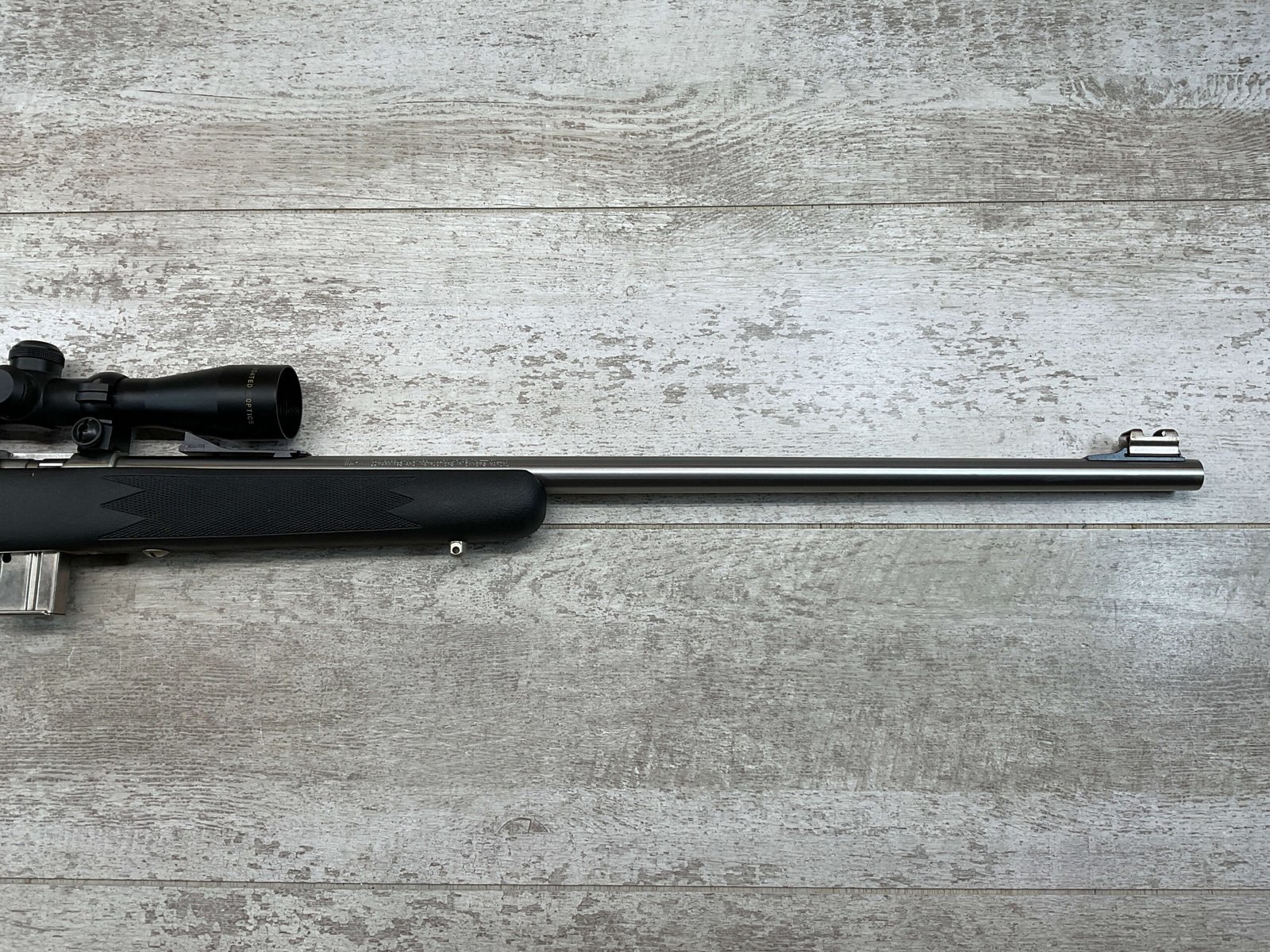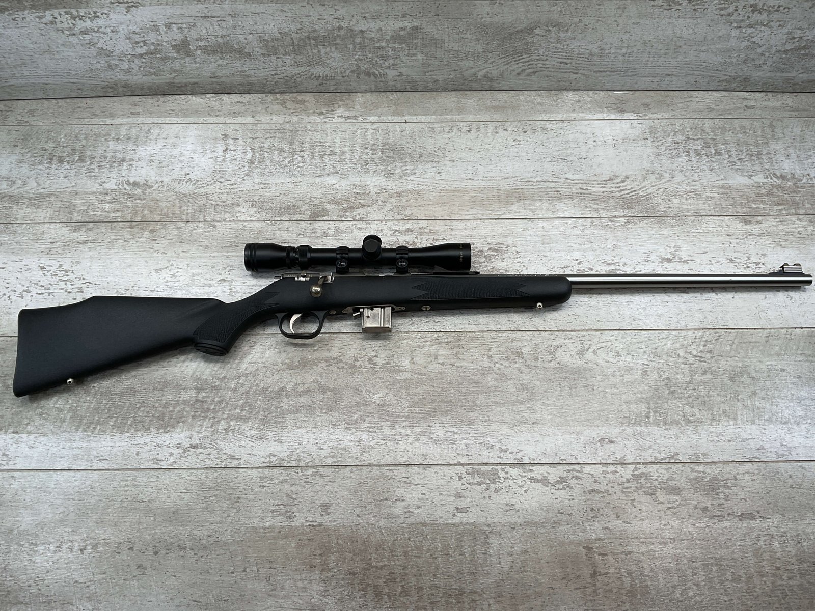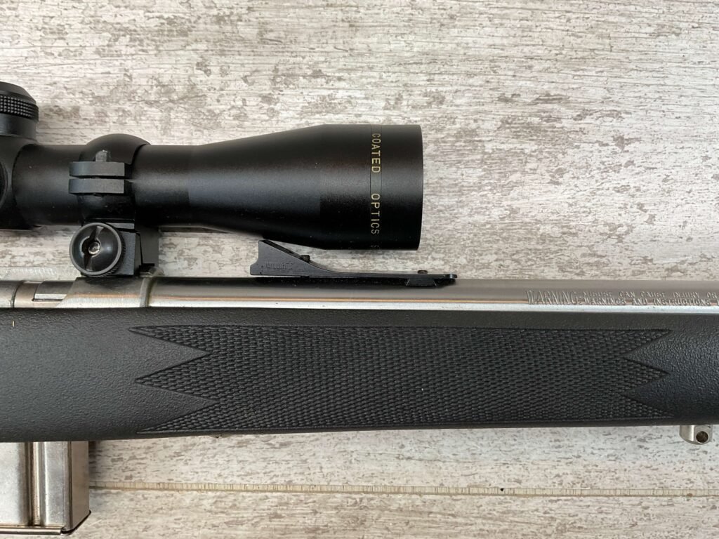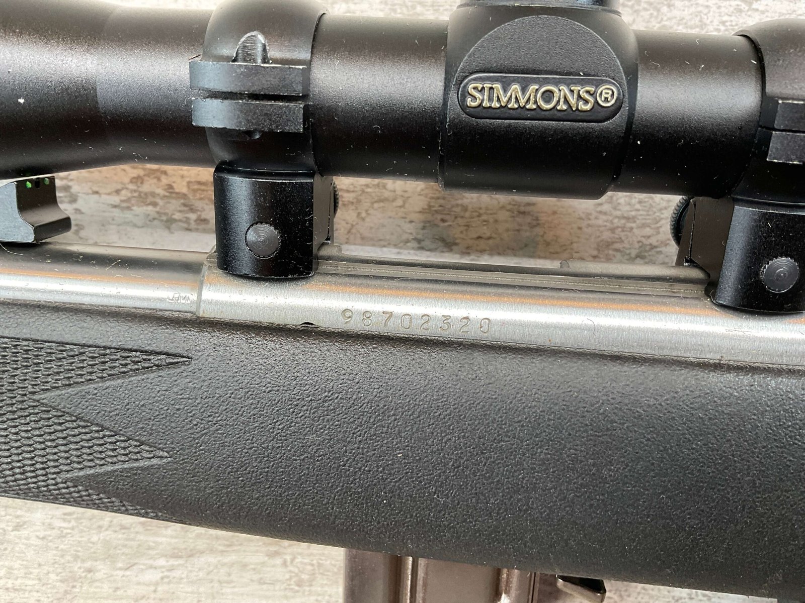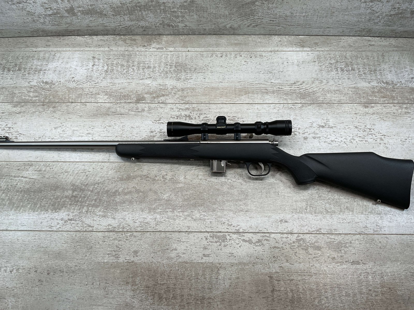 MARLIN MODEL 882-SS .22 WIN MAG BOLT ACTION RIFLE W/SCOPE #98702320, 22″ JM STAMPED STAINLESS STEEL BARREL, EXC MICRO GROOVE RIFLING, 3-9X32 SIMMONS SCOPE, 7 ROUND MAGAZINE, BLACK SYNTHETIC STOCK, MIRROR BRIGHT BORE, VERY LIGHT HANDLING MARKS, 98+%