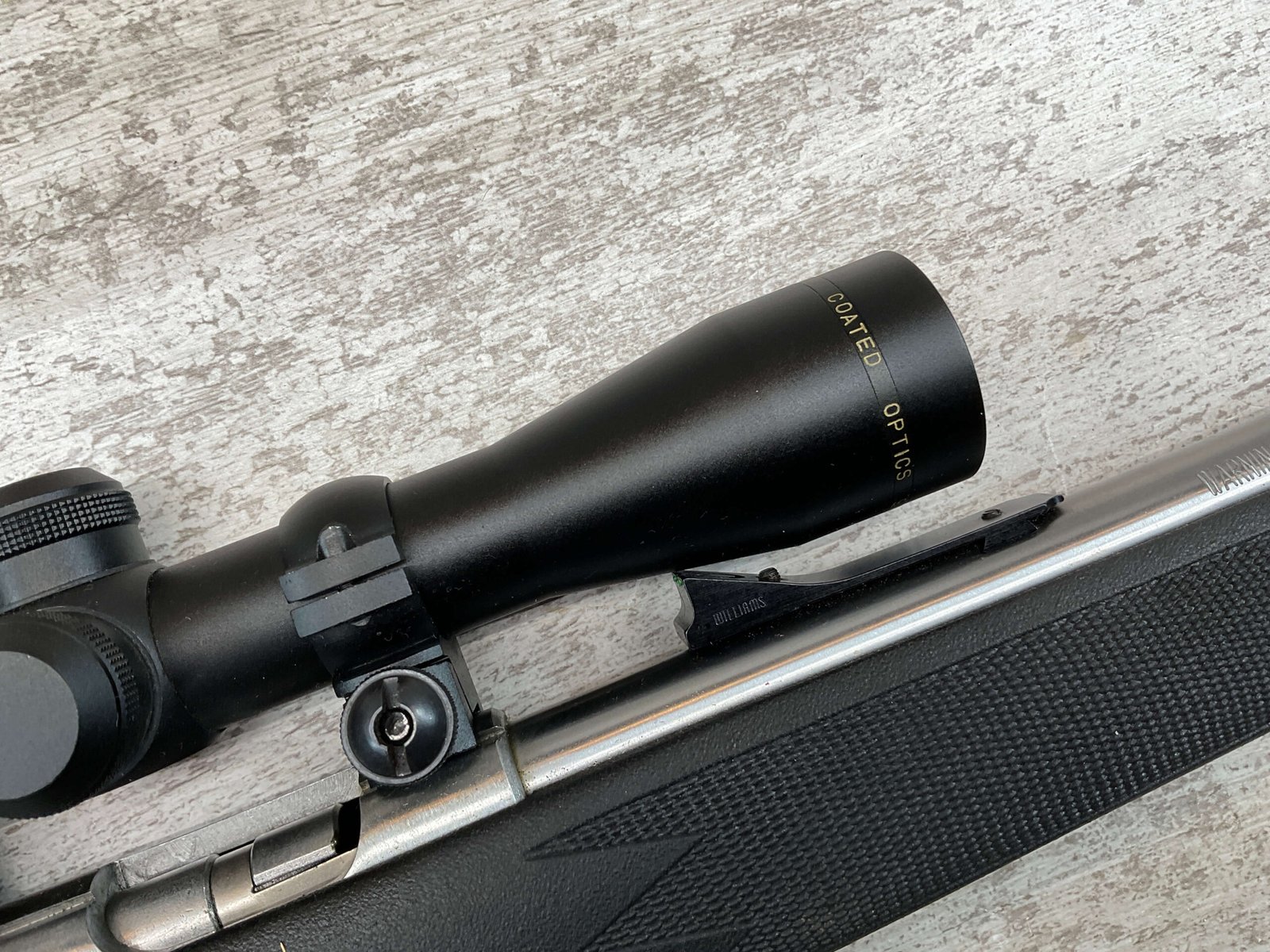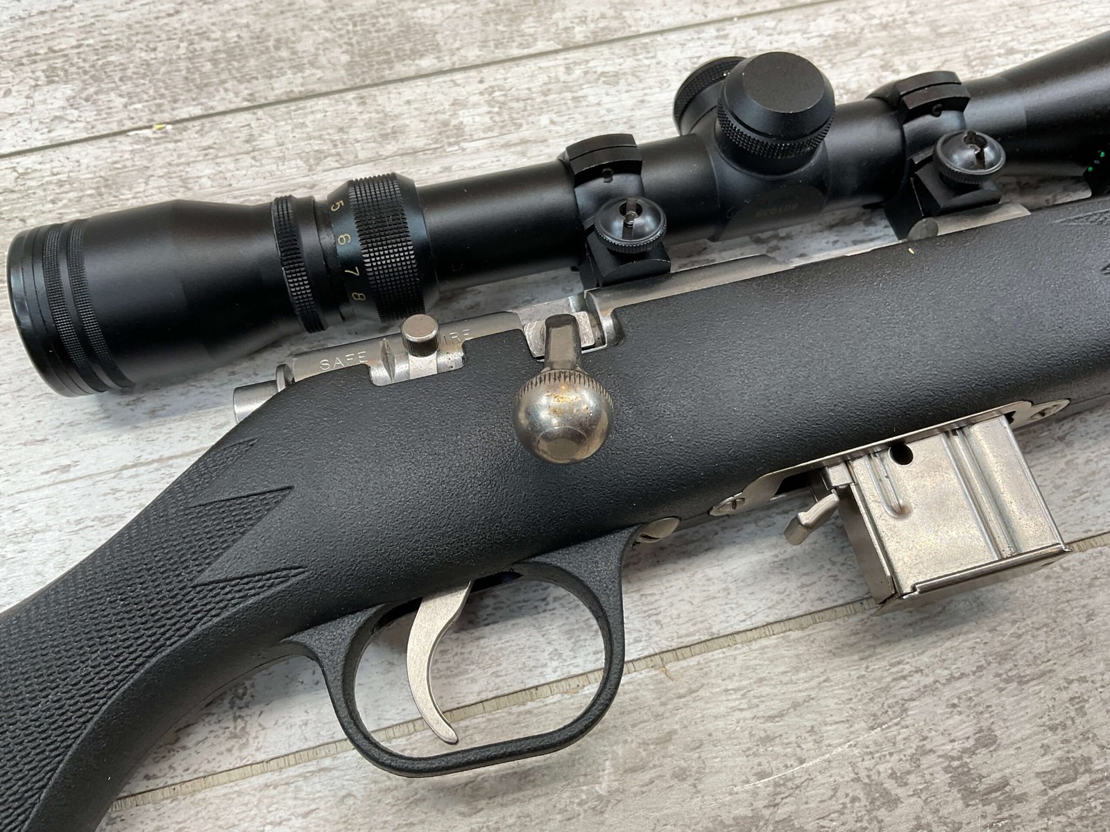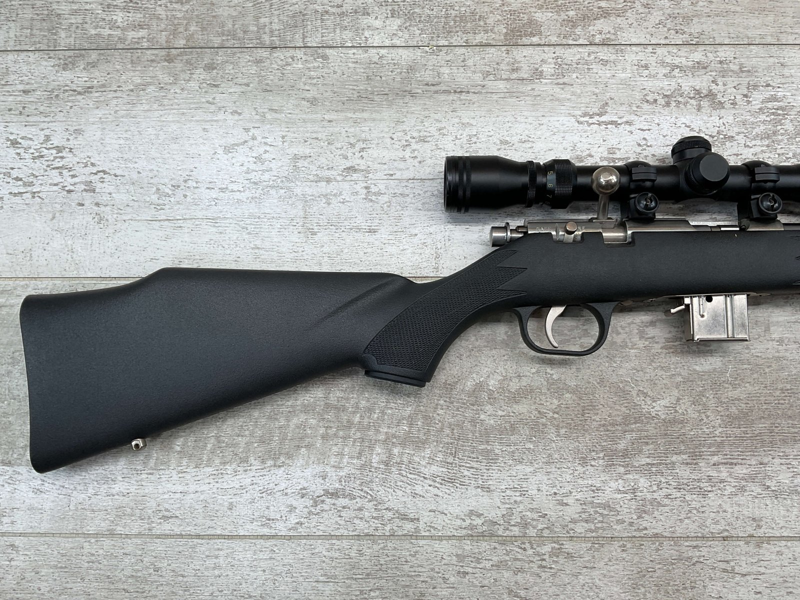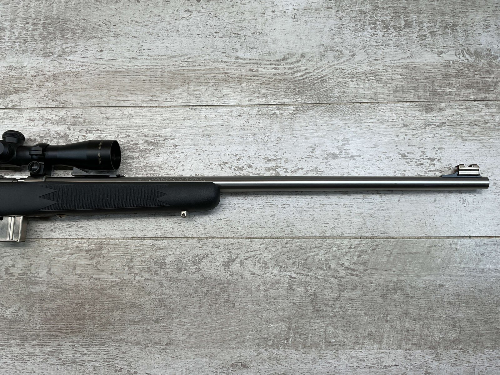 MARLIN MODEL 882-SS .22 WIN MAG BOLT ACTION RIFLE W/SCOPE #98702320, 22″ JM STAMPED STAINLESS STEEL BARREL, EXC MICRO GROOVE RIFLING, 3-9X32 SIMMONS SCOPE, 7 ROUND MAGAZINE, BLACK SYNTHETIC STOCK, MIRROR BRIGHT BORE, VERY LIGHT HANDLING MARKS, 98+%