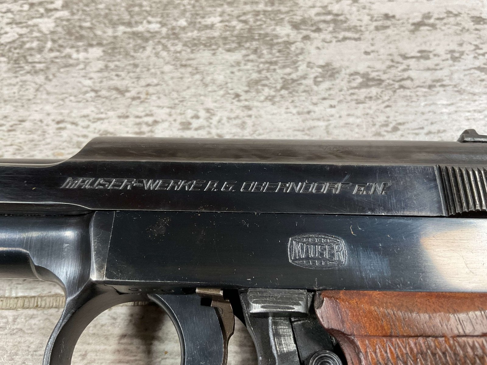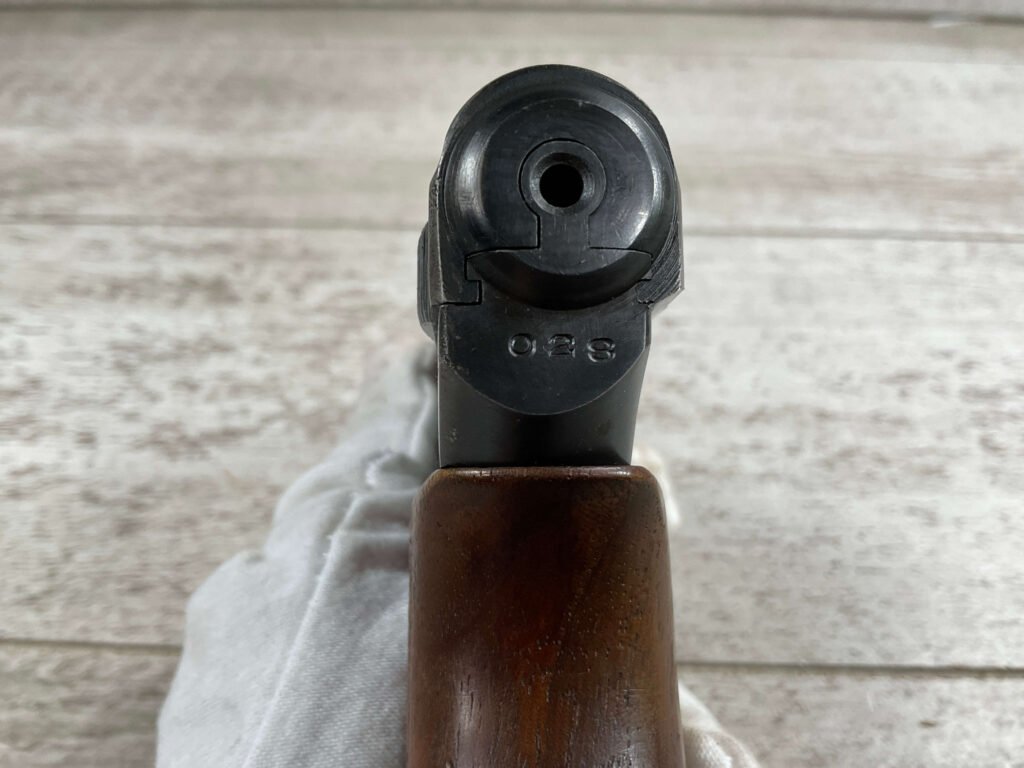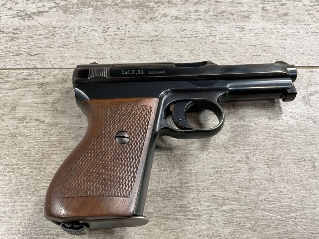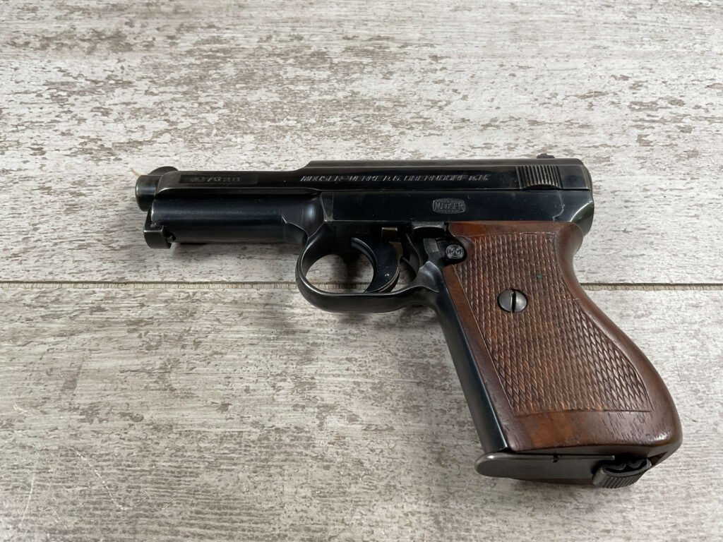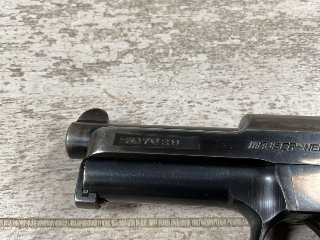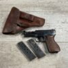 MAUSER 1934 7,65mm E/N MARKED PISTOL RIG #597028, ALL MATCHING, “EAGLE/N” BEHIND REAR SIGHT, 2 EXC MAGAZINES “MAUSER” BANNER BASE, 85+% ORIGINAL HIGH POLISH SALT BLUE FINISH W/HIGH EDGE WEAR AS WELL AS HOLSTER/USE WEAR, EXC BRIGHT BORE & RIFLING(9.5/10), EXC ORIGINAL CHECKERED WALNUT GRIPS W/CURVED BACK, VG BROWN LEATHER HOLSTER W/EXC STITCHING, 90+% OVERALL