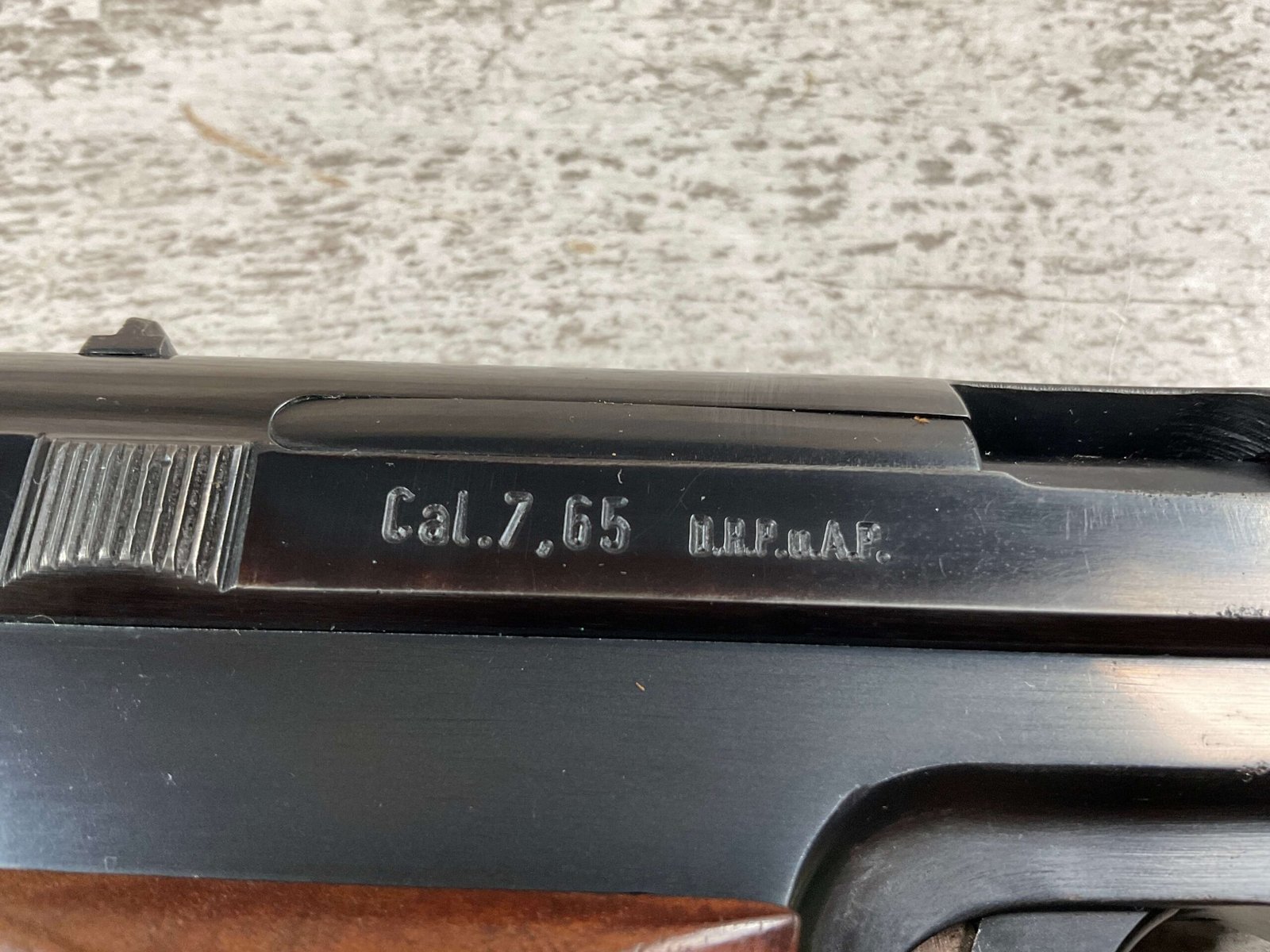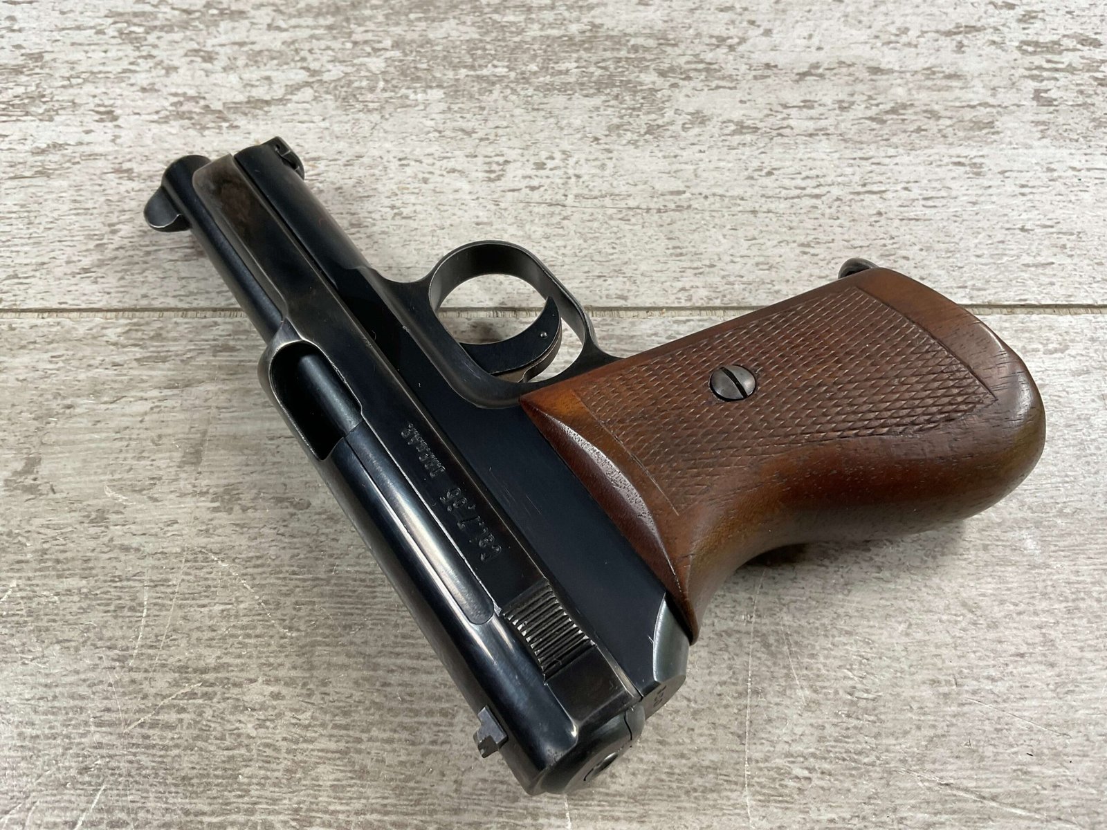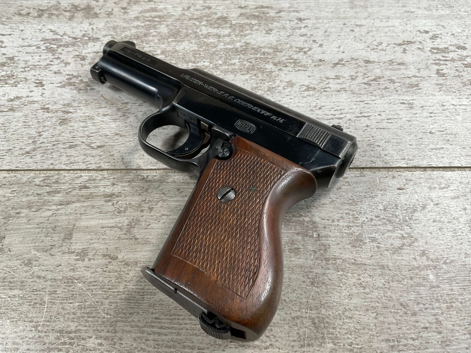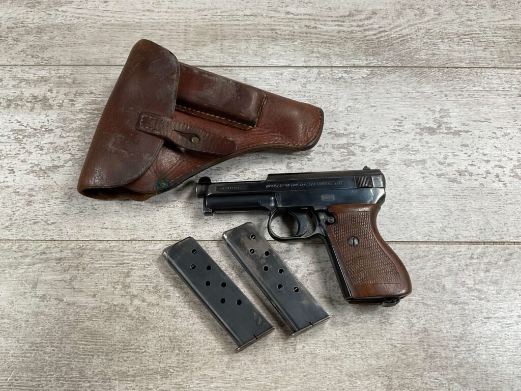 MAUSER 1934 7,65mm E/N MARKED PISTOL RIG #597028, ALL MATCHING, “EAGLE/N” BEHIND REAR SIGHT, 2 EXC MAGAZINES “MAUSER” BANNER BASE, 85+% ORIGINAL HIGH POLISH SALT BLUE FINISH W/HIGH EDGE WEAR AS WELL AS HOLSTER/USE WEAR, EXC BRIGHT BORE & RIFLING(9.5/10), EXC ORIGINAL CHECKERED WALNUT GRIPS W/CURVED BACK, VG BROWN LEATHER HOLSTER W/EXC STITCHING, 90+% OVERALL