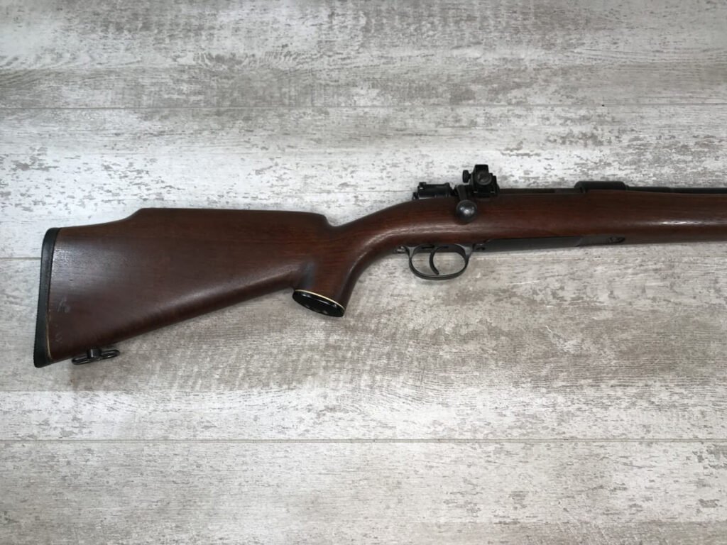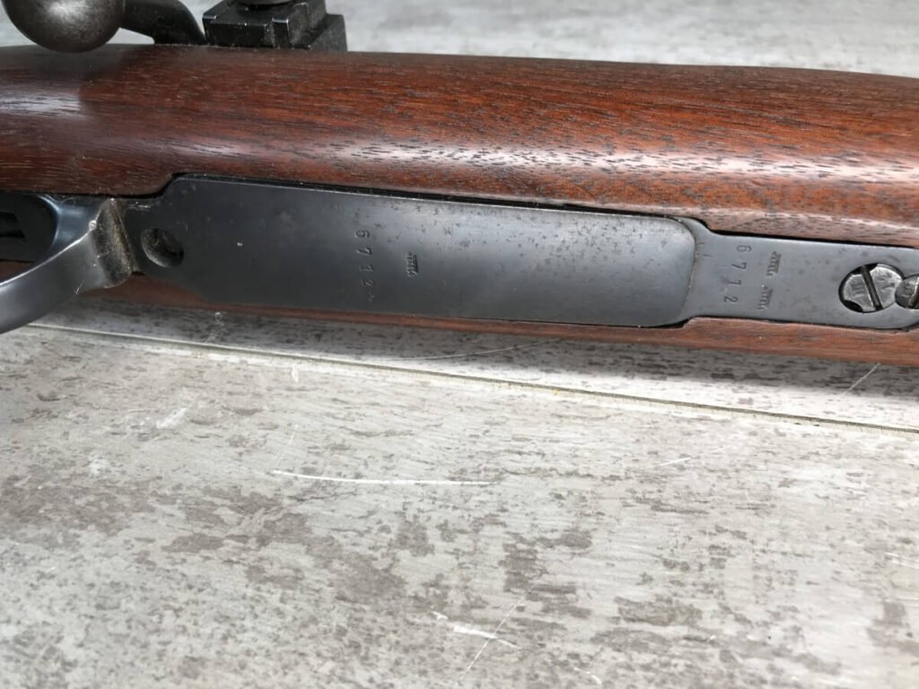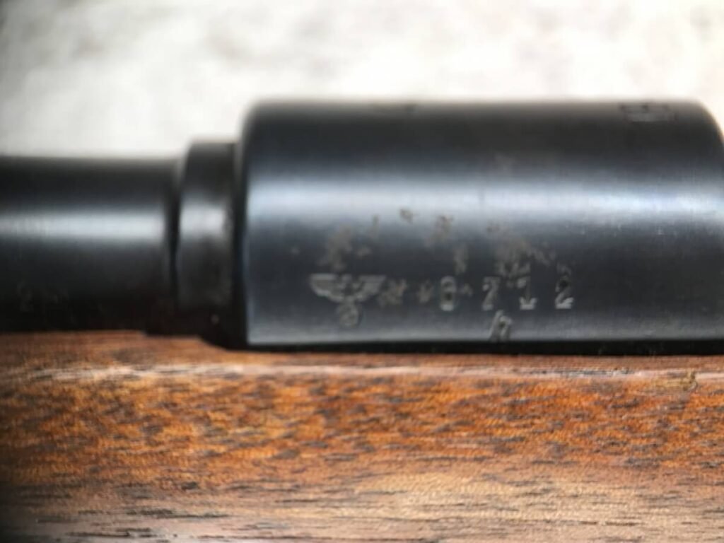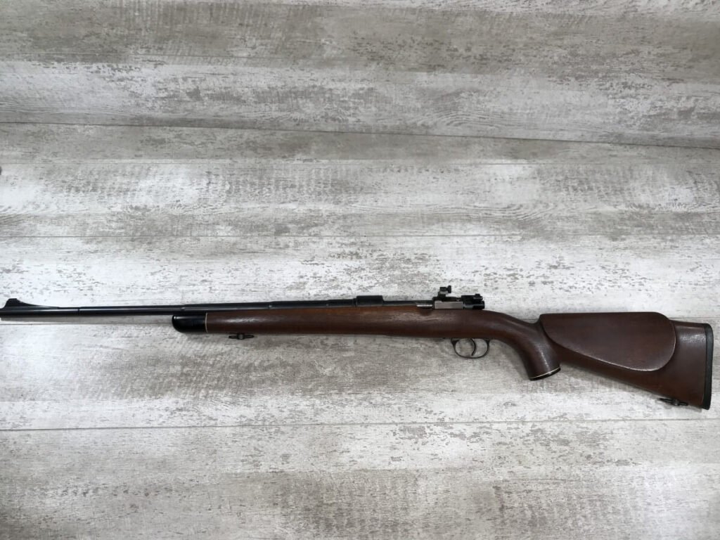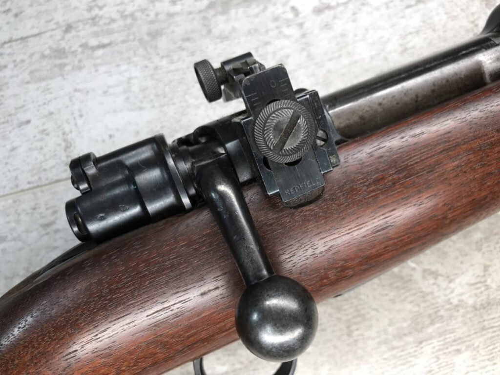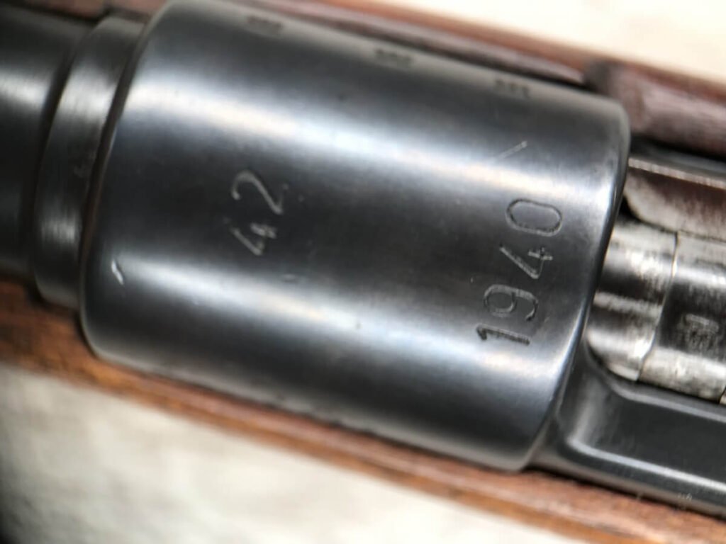 SKU#425 MAUSER “42” CODE 1940 DATE 98K BOLT ACTION RIFLE #6712h, ALL MATCHING SERIAL NUMBERS, SPORTERIZED MONTE CARLO STOCK W/REDFIELD PEEP SIGHT, BLADE FRONT SIGHT, “E/655” INSPECTION MARKS THROUGHOUT, “NAZI EAGLE/GLOBE” ON RECEIVER, 90% BLUE FINISH W/SOME SPOTTING, EXC WOOD W/LIGHT HANDLING MARKS, PROFESSIONALLY SPORTERIZED IN THE 1950’S (PER OWNER), 90% OVERALL, GREAT SHOOTER!!