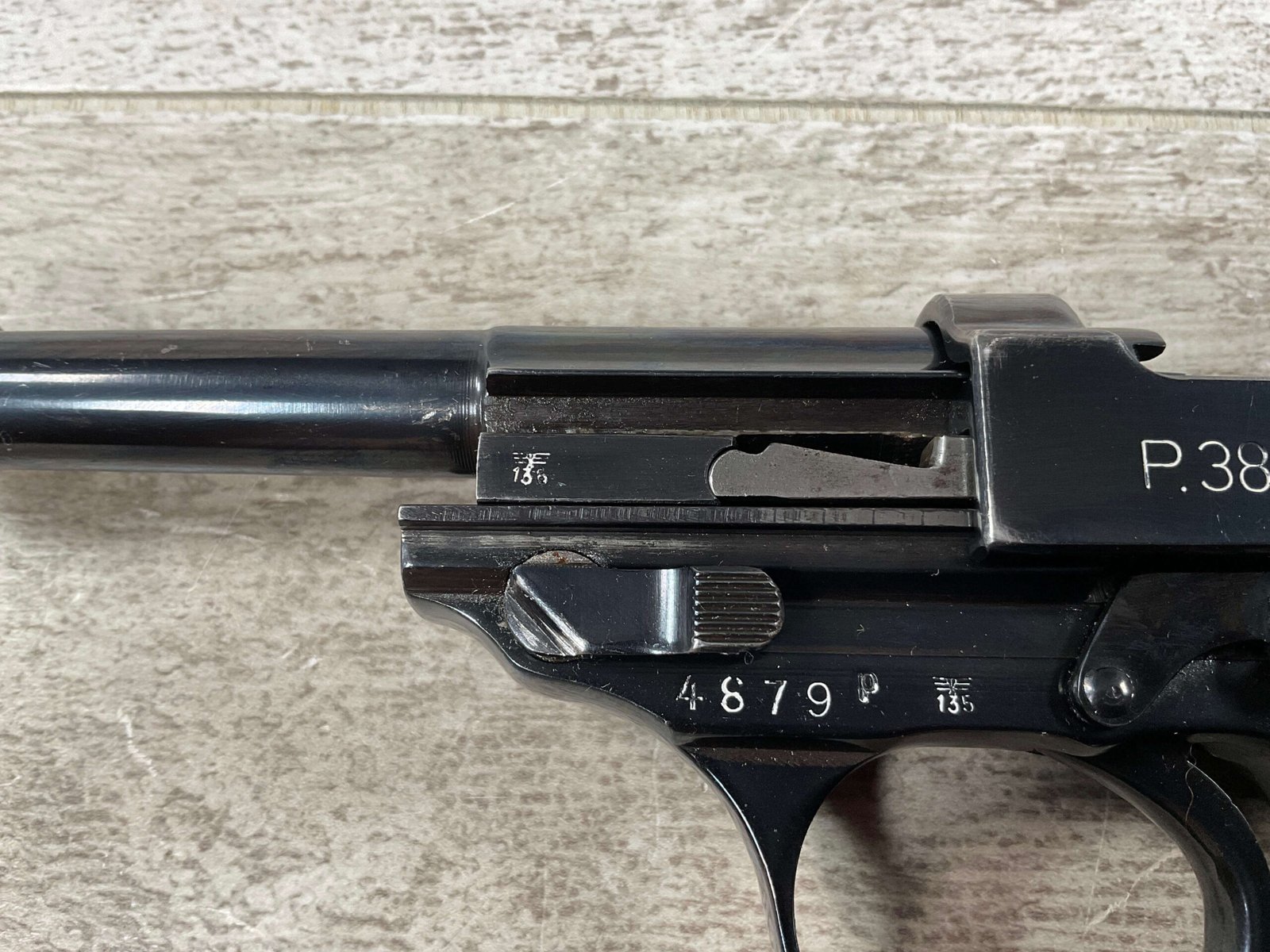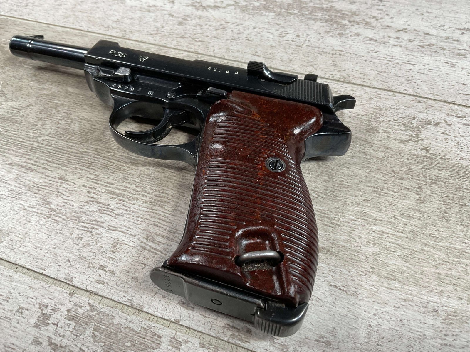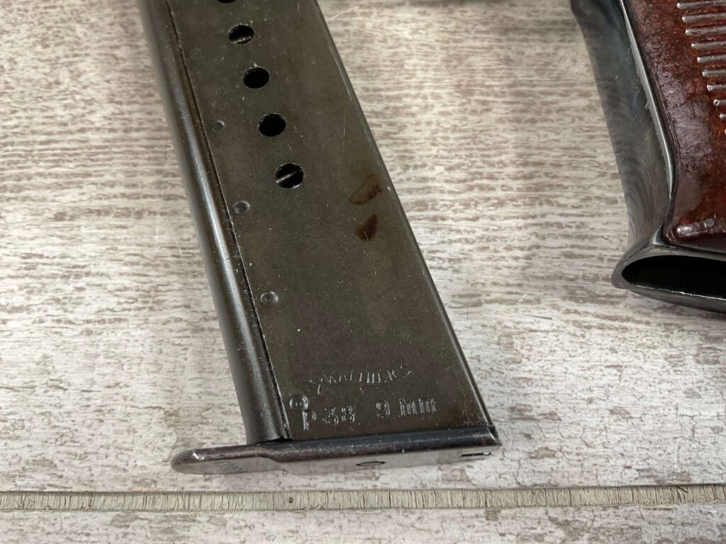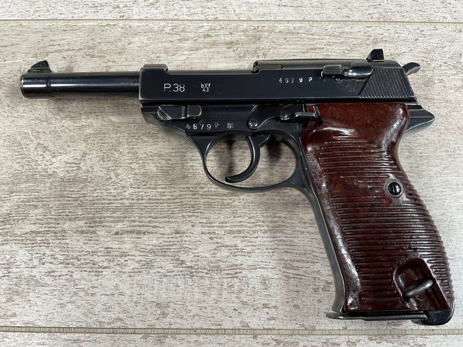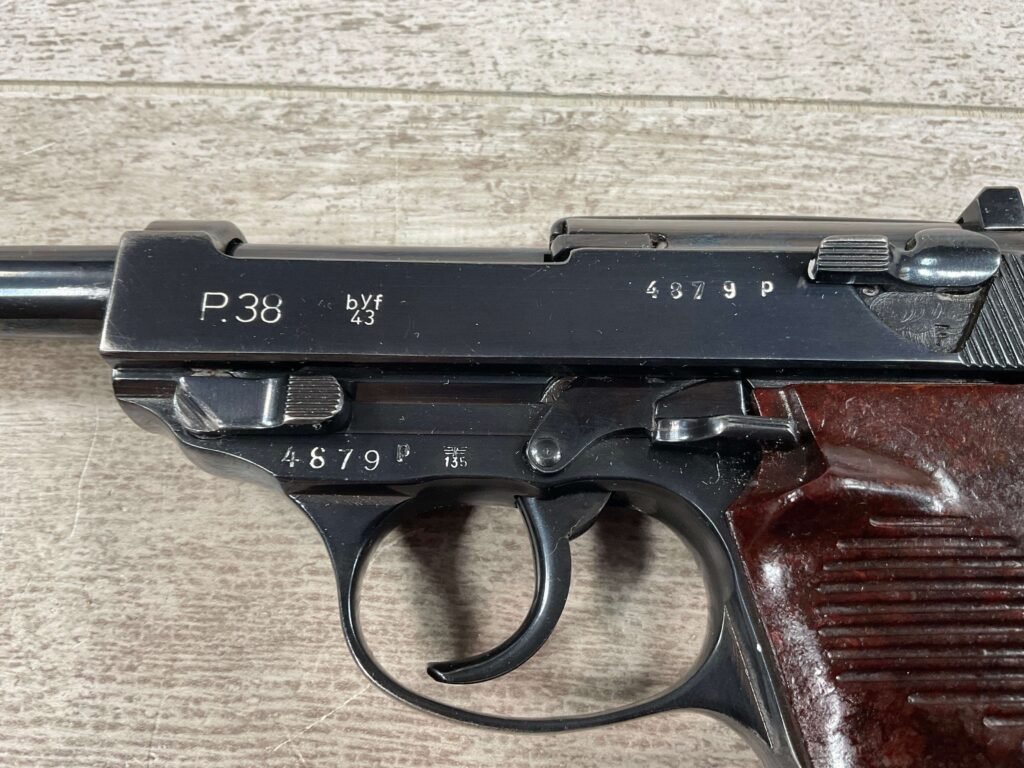 MAUSER byf43 P38 PISTOL MATCHING #4879p, 9mm, 5″ BBL, 98+% REBLUE, LEFT FRAME HAS “4679P E/135”, EXC BROWN BAKELITE GRIPS, VG BRIGHT BORE W/LIGHT FROSTING THROUGHOUT, NO IMPORT MARKS, NON MATCHING WALTHER P38 MARKED MAG, 95+% OVERALL